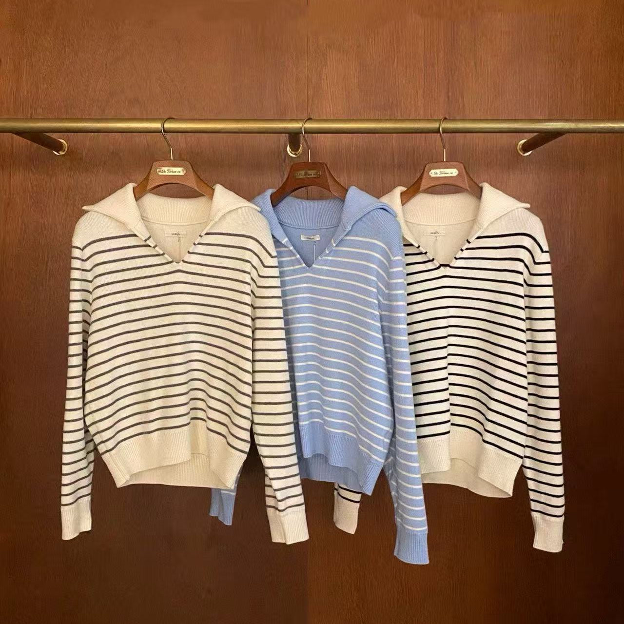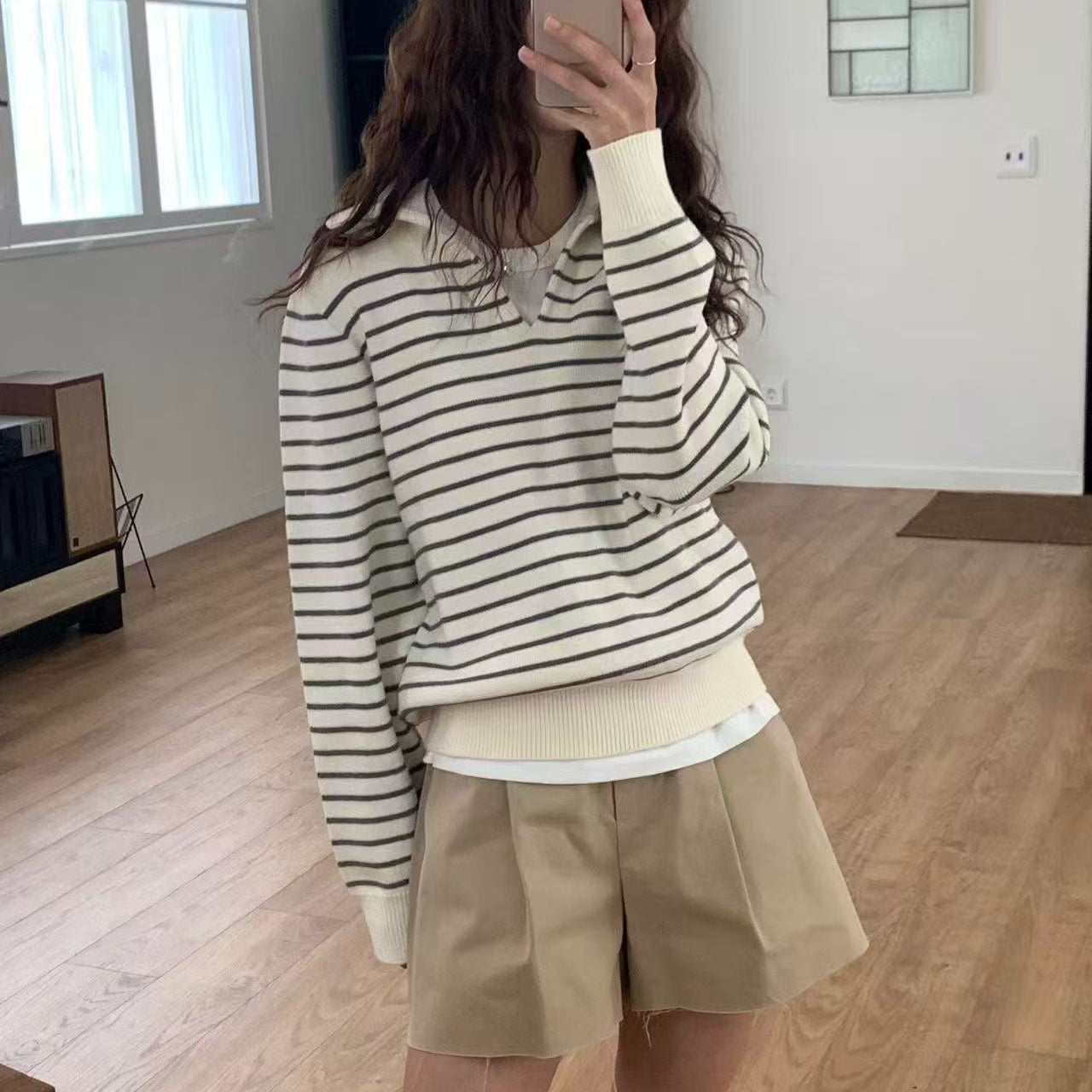 KOREAN COLLECTION 2602 海军领条纹韩系毛衣白棕+短裤