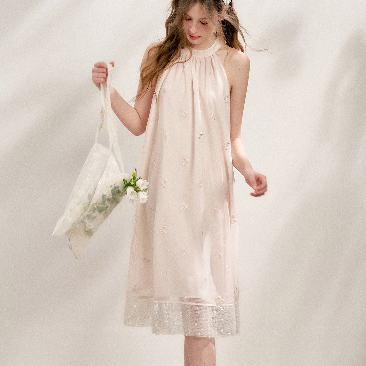 Kroche 2604 钉珠刺绣 花朵亮片拼接挂脖连衣裙