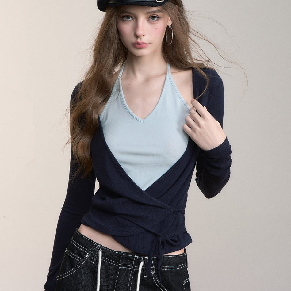 VIA PITTI 2509 挂脖撞色交襟系带假两件 藏蓝
