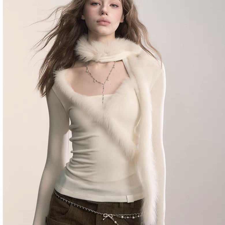 VIA PITTI 2511 真狐狸毛领围巾V领针织上衣