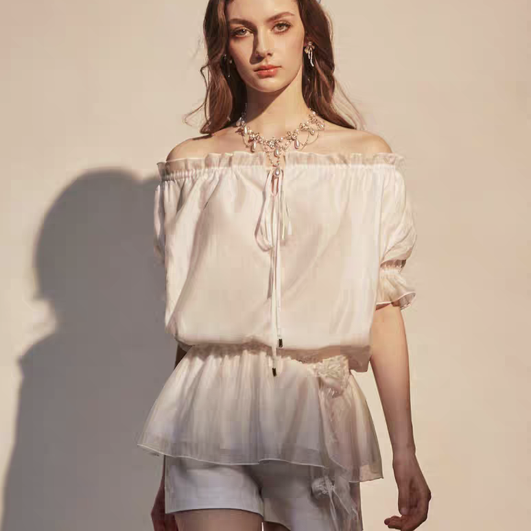 KINGWEN 2506 一字肩抽绳长袖衬衫+系带短裤