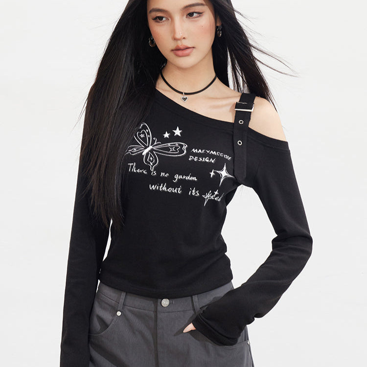 MacyMccoy 2509 蝴蝶露肩长袖T恤 黑