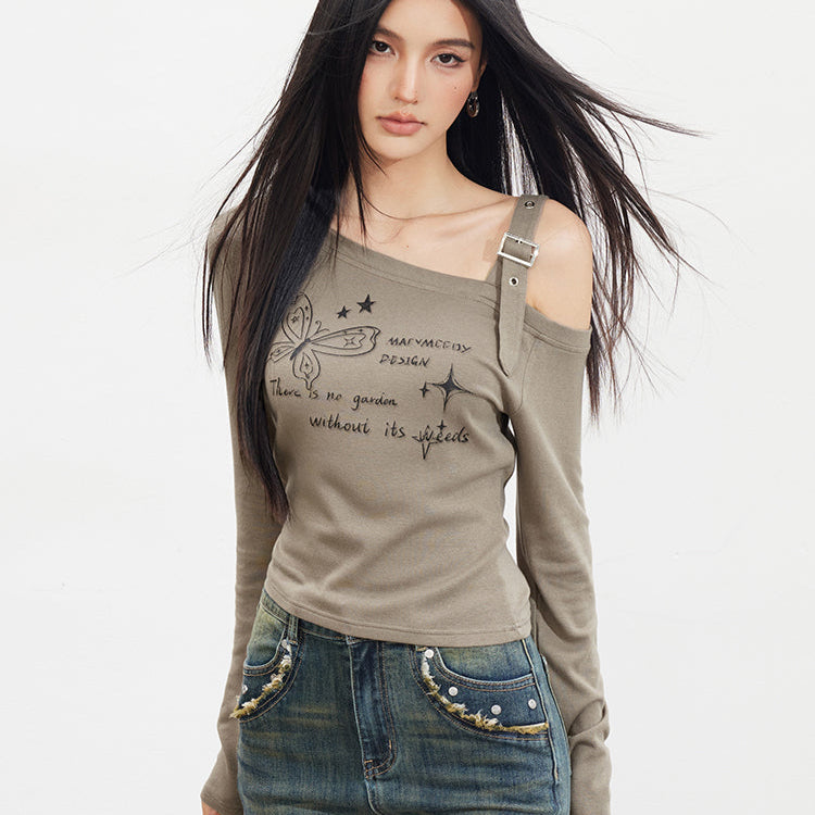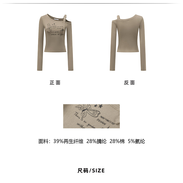 MacyMccoy 2509 蝴蝶露肩长袖T恤 咖