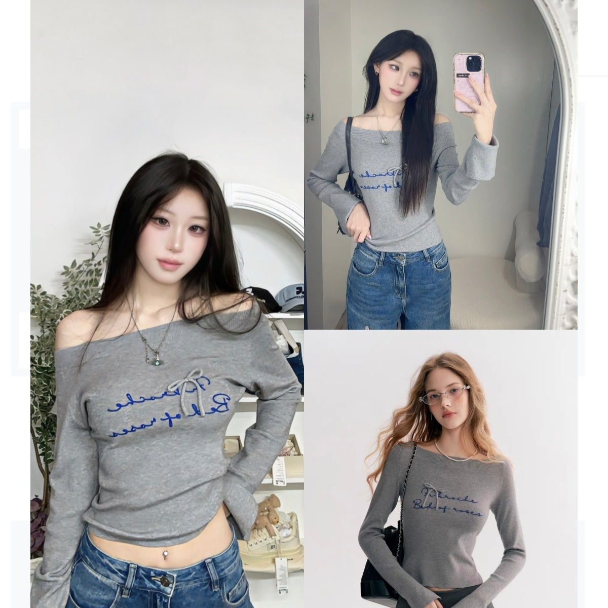 Kroche 2511 重工刺绣 两穿一字领修身长袖针织衫 灰