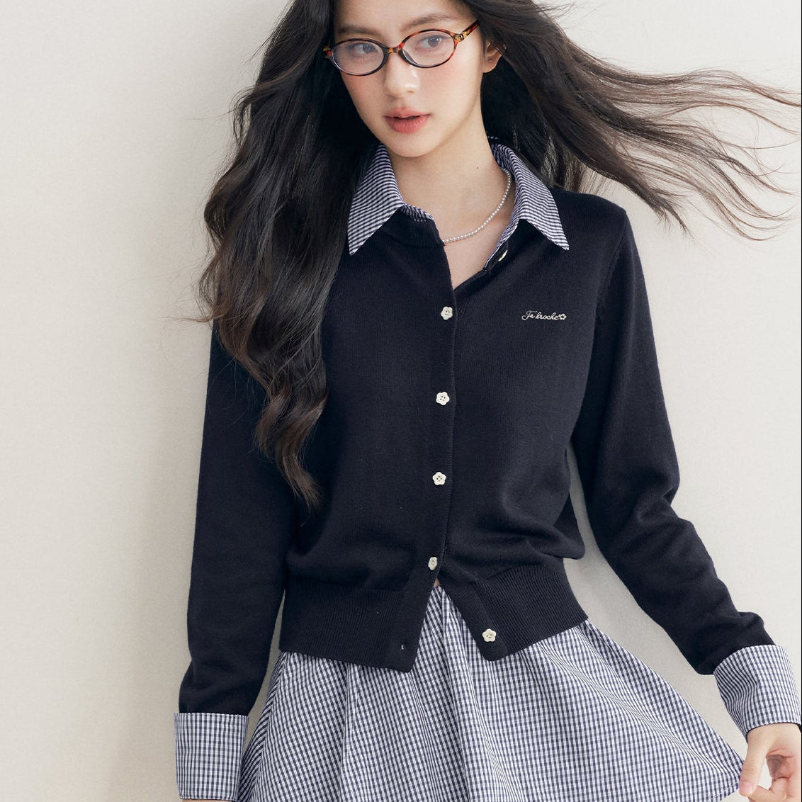 Kroche 2512 羊毛混纺 格纹翻领拼接假两件针织开衫