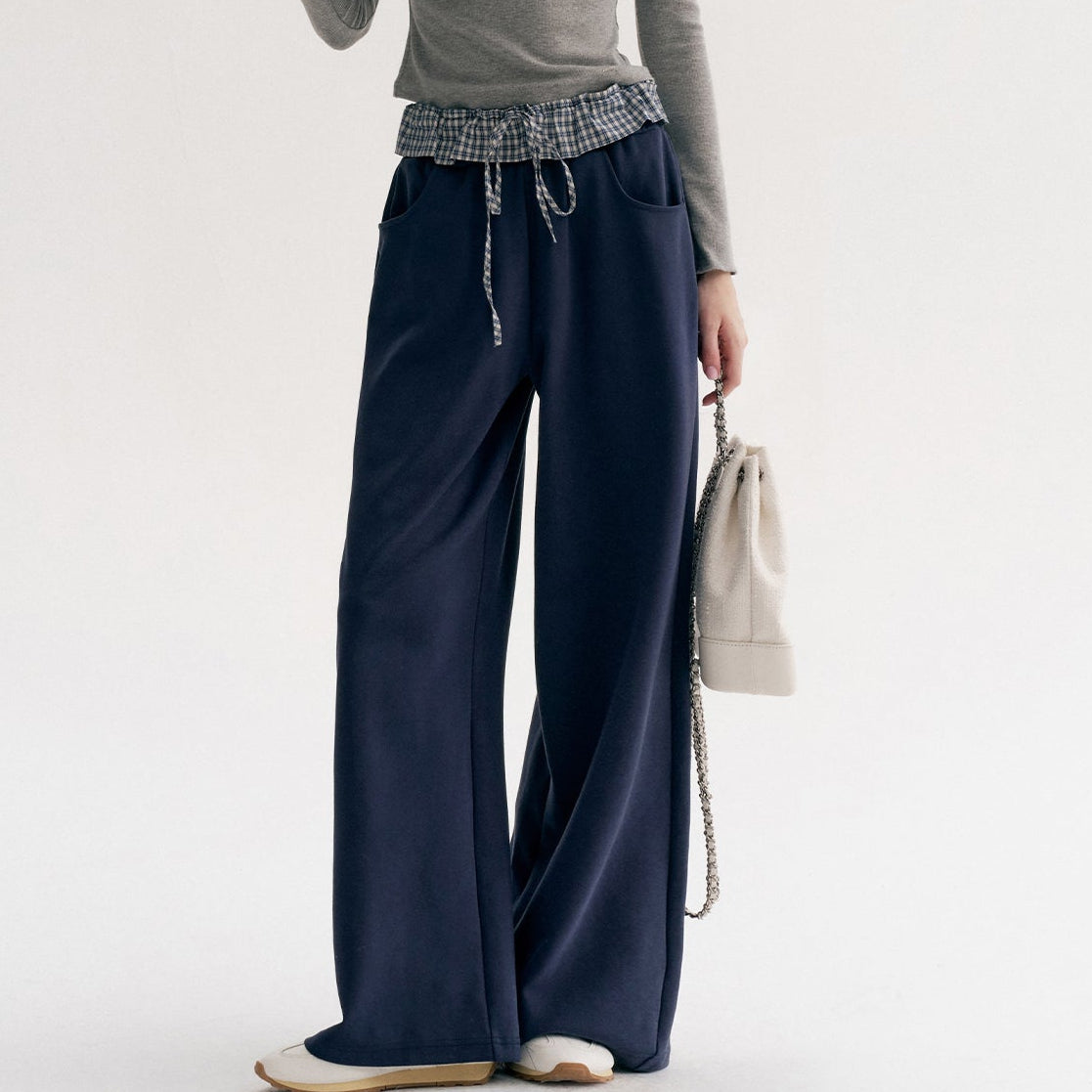 Kroche 2509 格纹花边拼接抽绳阔腿休闲卫裤 藏青