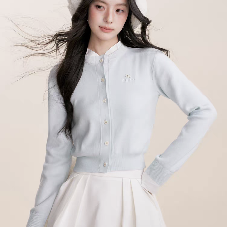 Kroche 2512 羊毛混纺撞色假两件拼接短款针织开衫