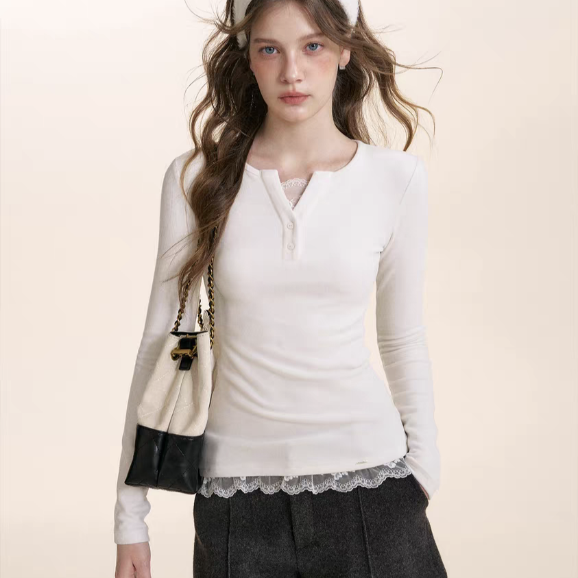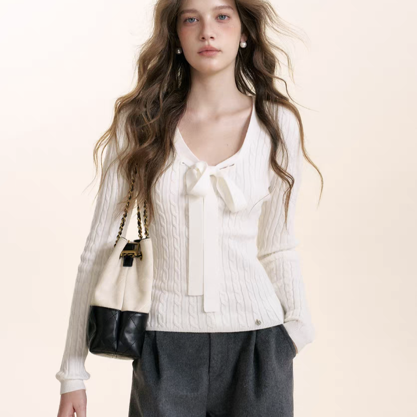 Kroche 2511 设计感飘带蝴蝶结V领长袖修身T恤 白