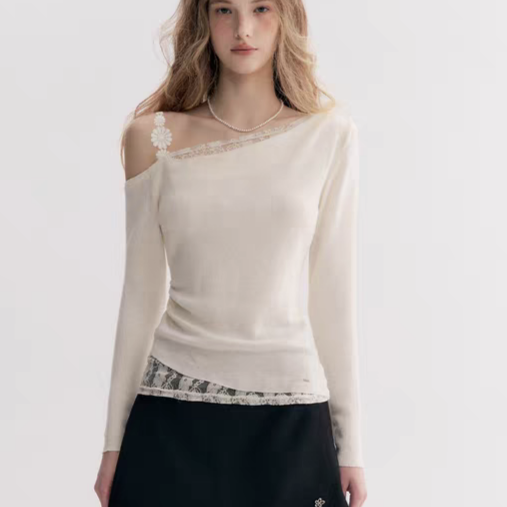 Kroche 2509 假两件蕾丝拼接斜肩长袖