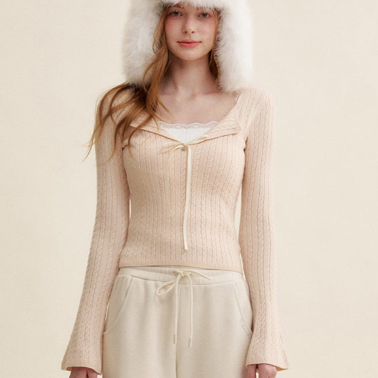 Kroche 2510 定染蕾丝花边 海军领系带披肩撞色毛衣开衫