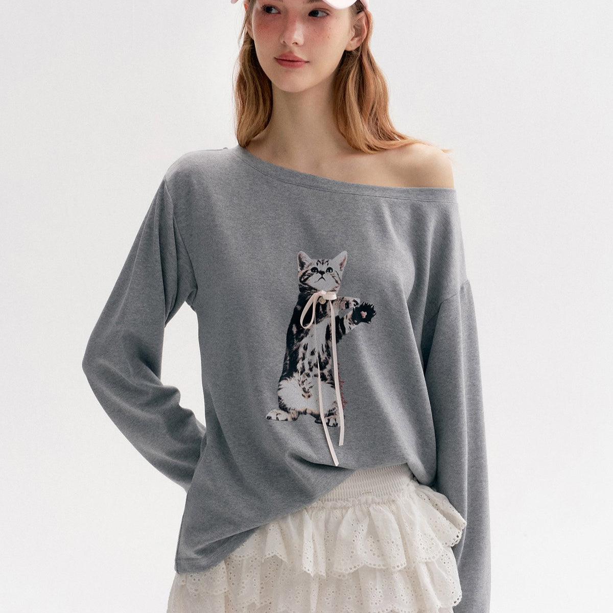 Kroche 2510 一字肩/斜肩两穿小猫印花长袖