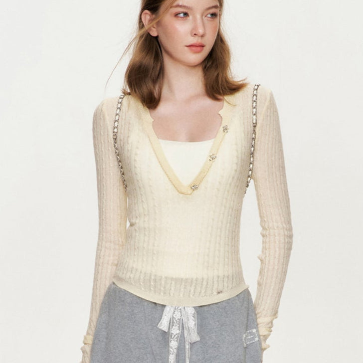 Kroche 2510 撞色花朵扣绞花假两件针织衫 奶黄