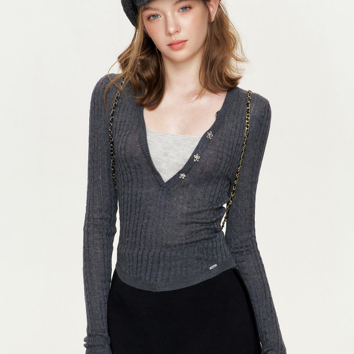 Kroche 2510 撞色花朵扣绞花假两件针织衫 深灰