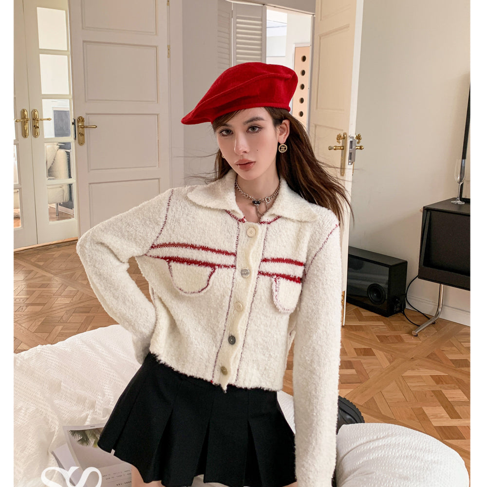 SOMESOWE 小香风撞色大V领口袋针织短上衣