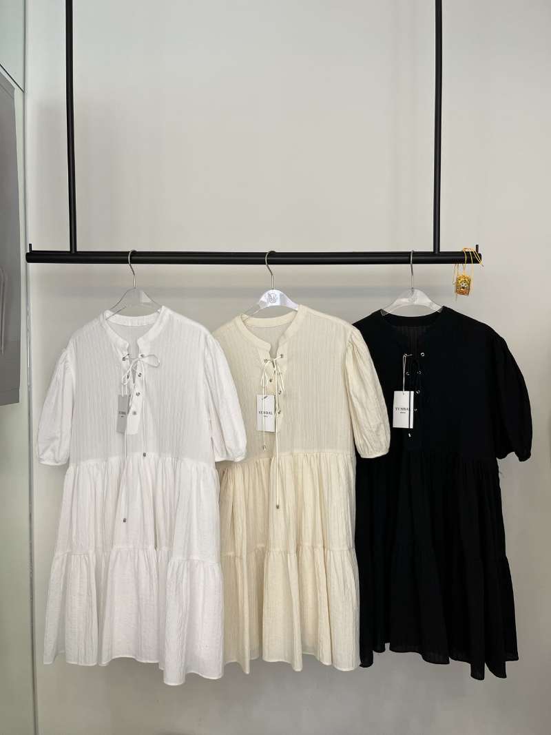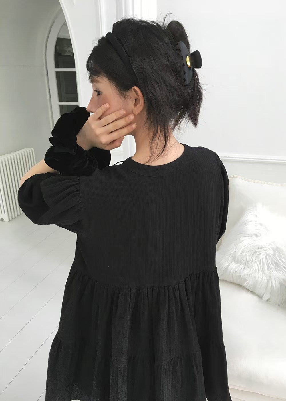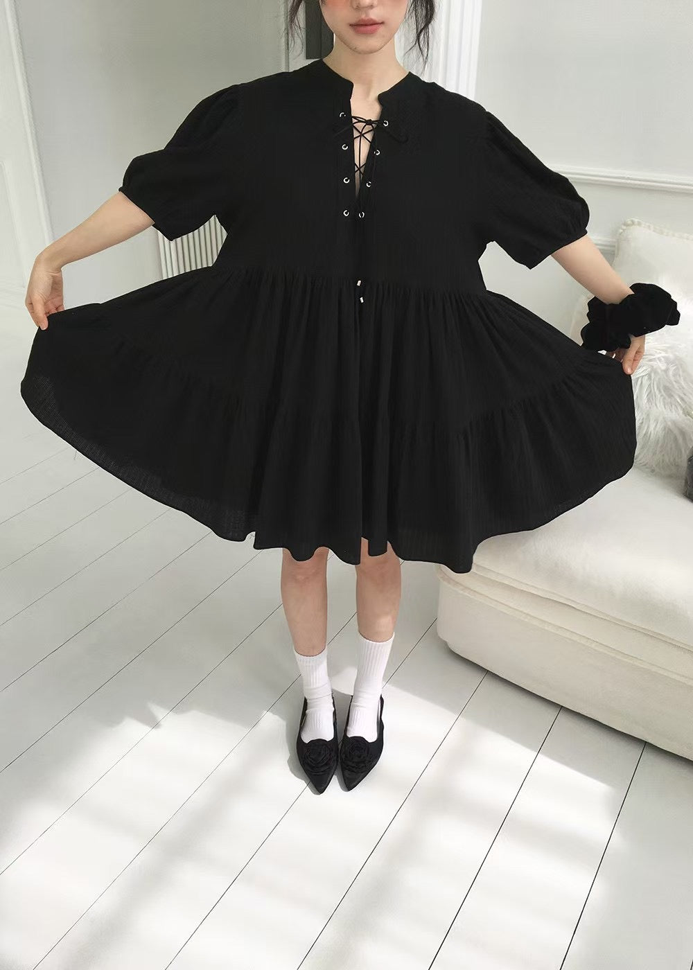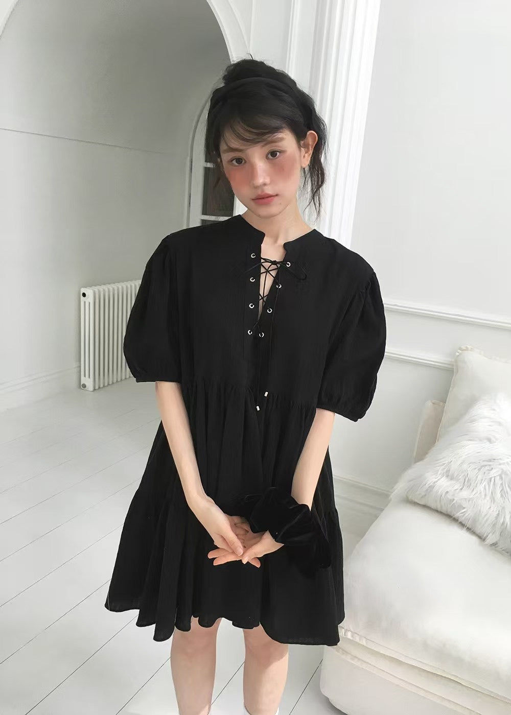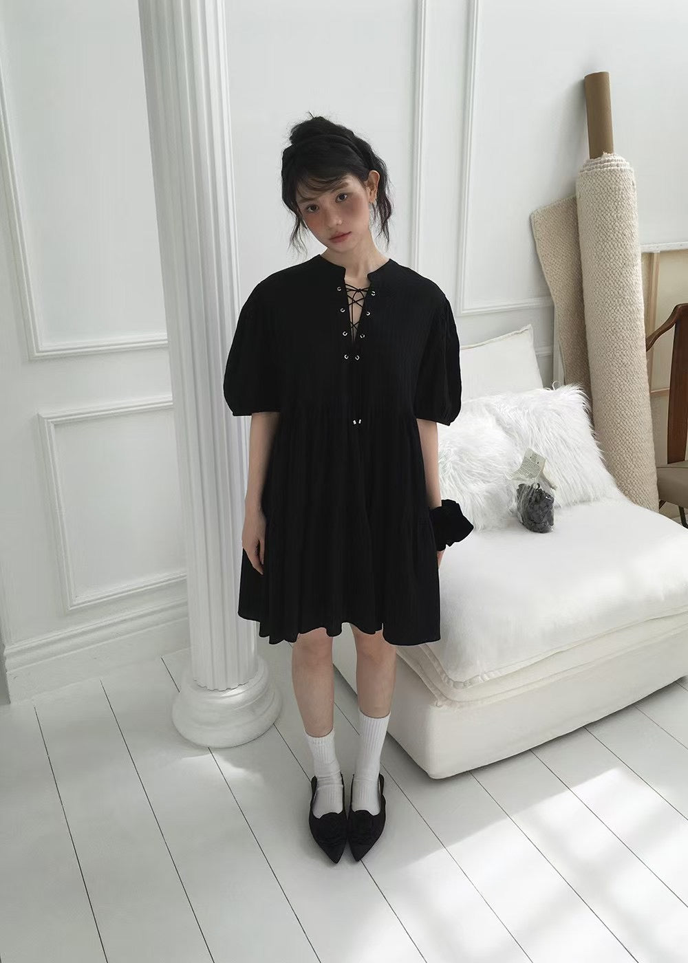 KOREAN COLLECTION 2505 交叉系带泡泡袖连衣裙 黑