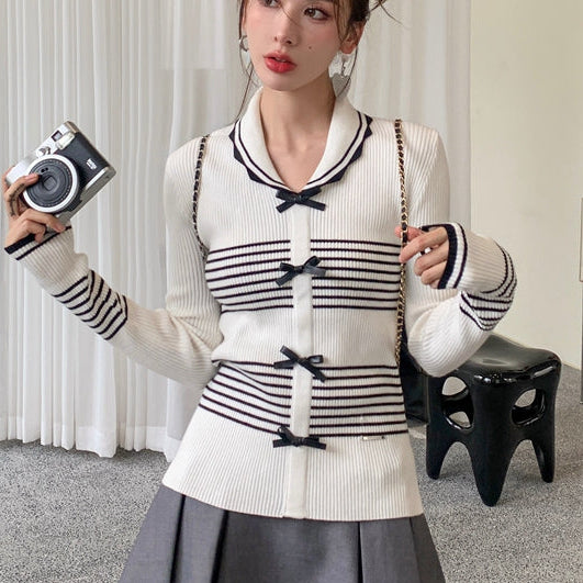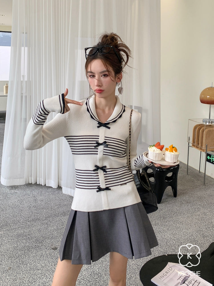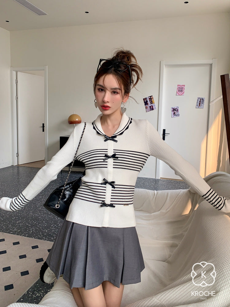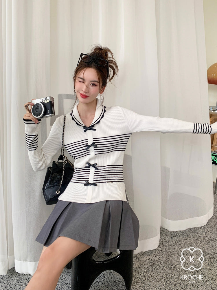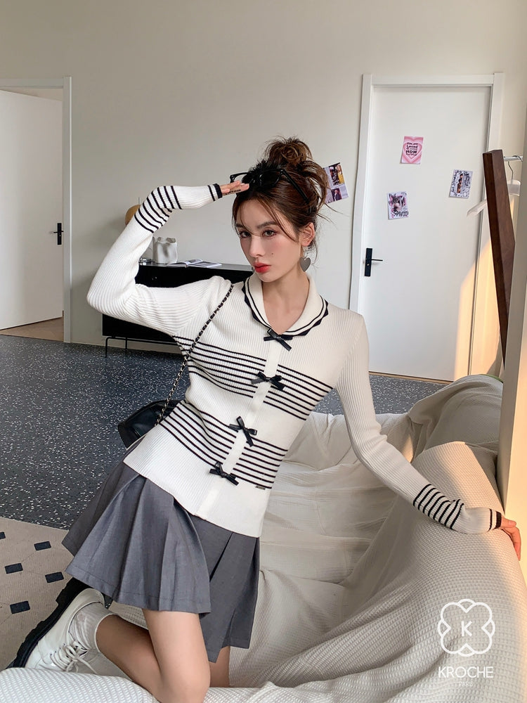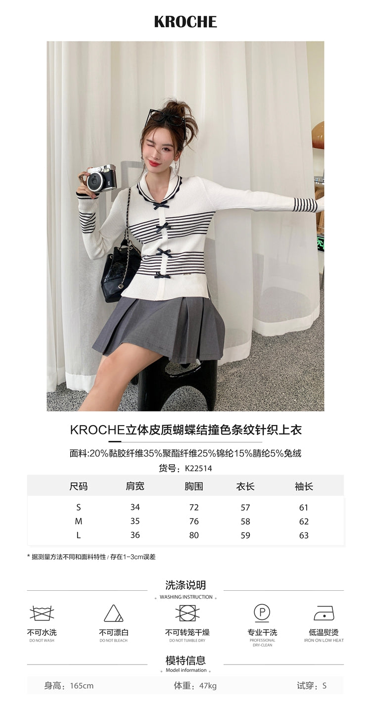 Kroche 立体皮质蝴蝶结撞色条纹针织
