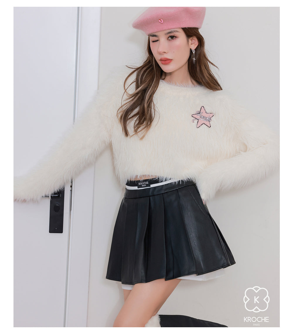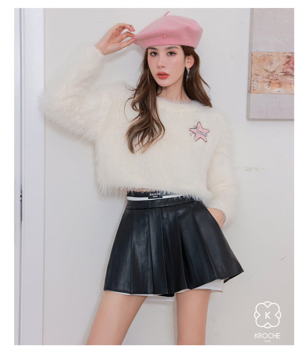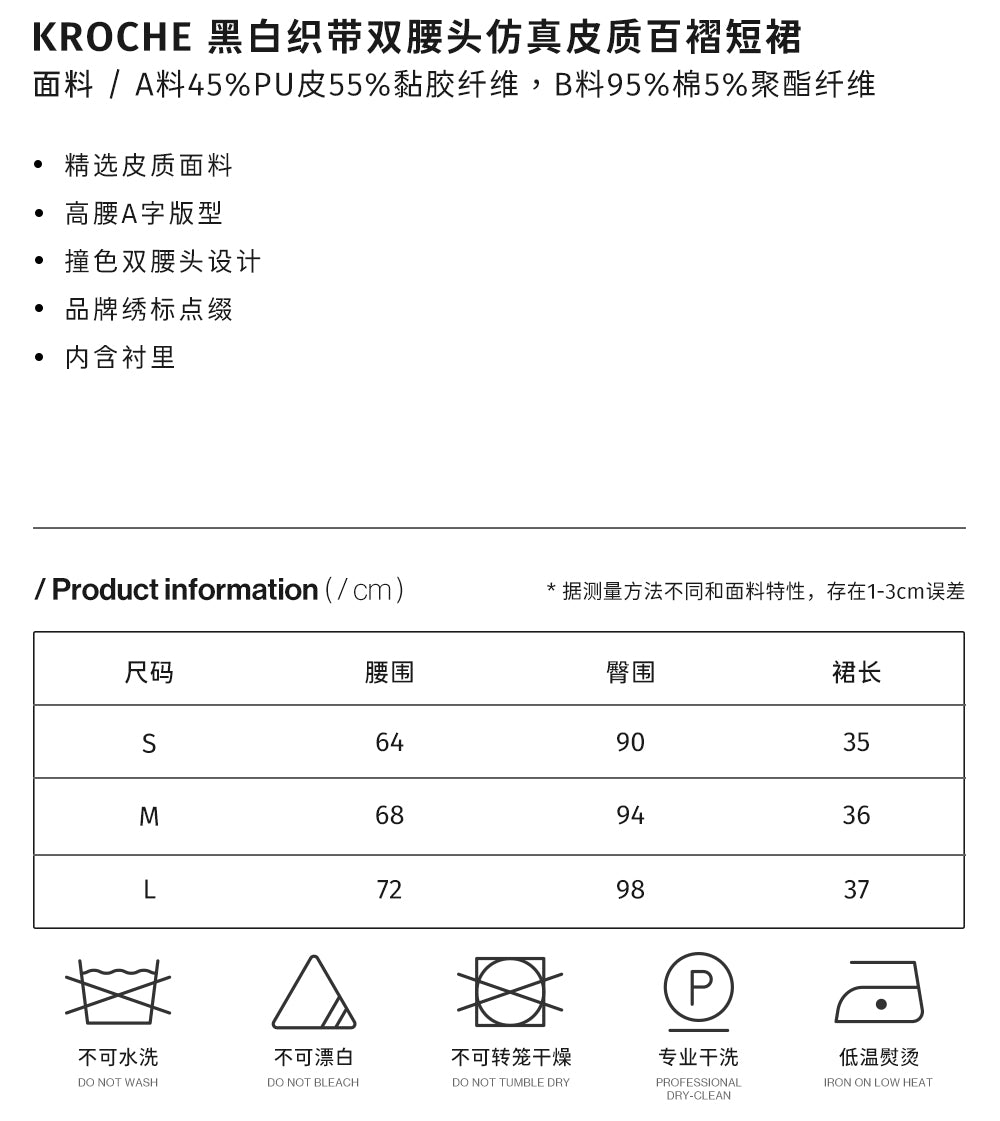 Kroche 黑白织带双腰头仿真皮质百褶短裙