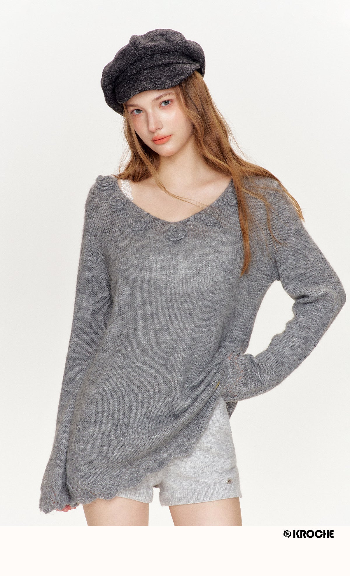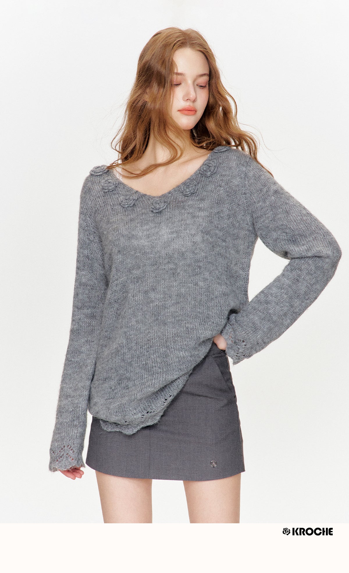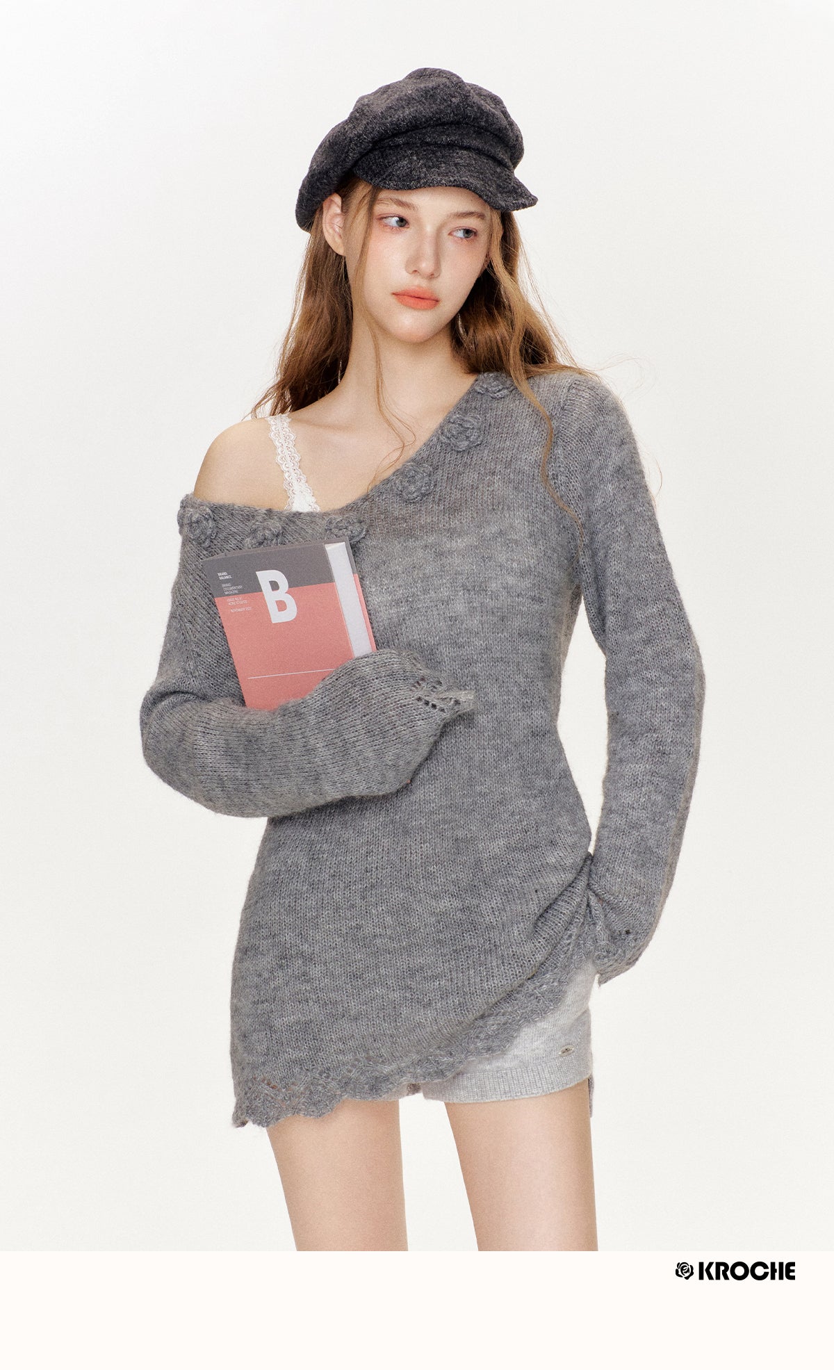Kroche 2410 V领镂空毛衣斜肩设计毛衫 灰