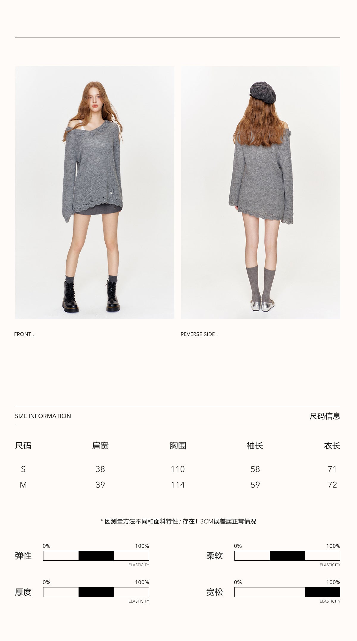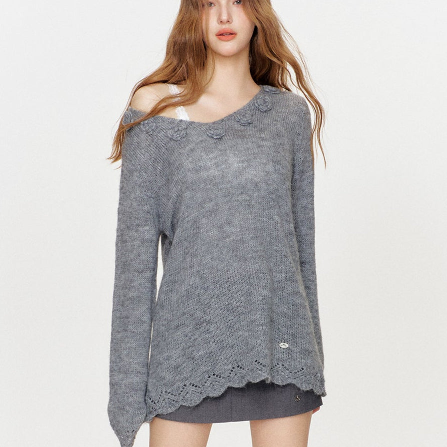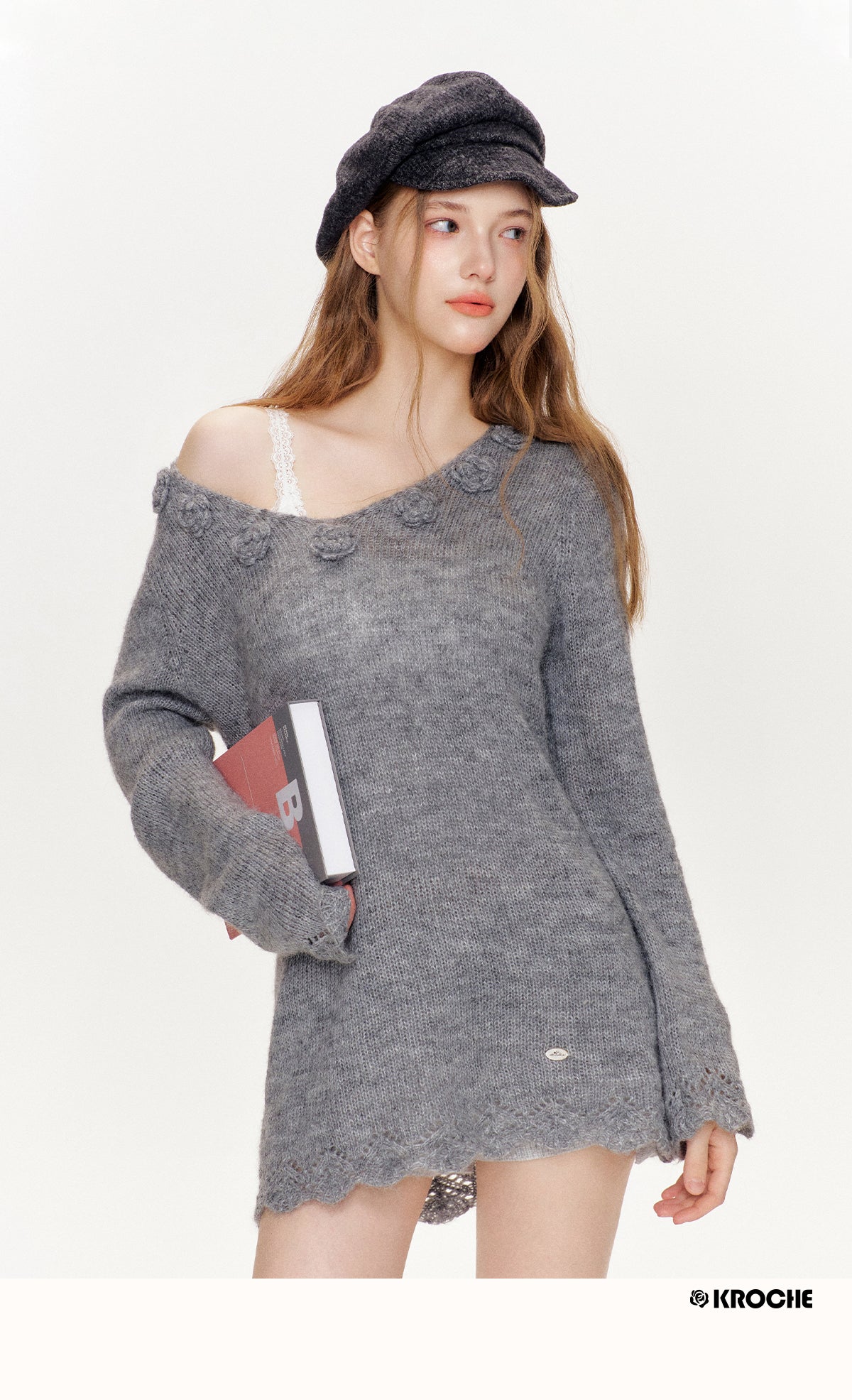 Kroche 2410 V领镂空毛衣斜肩设计毛衫 灰