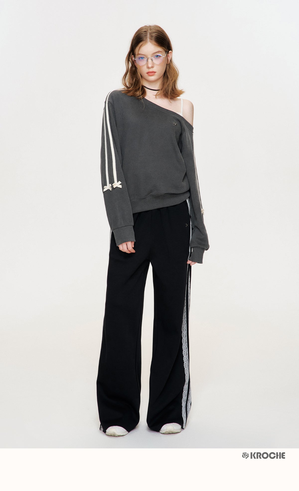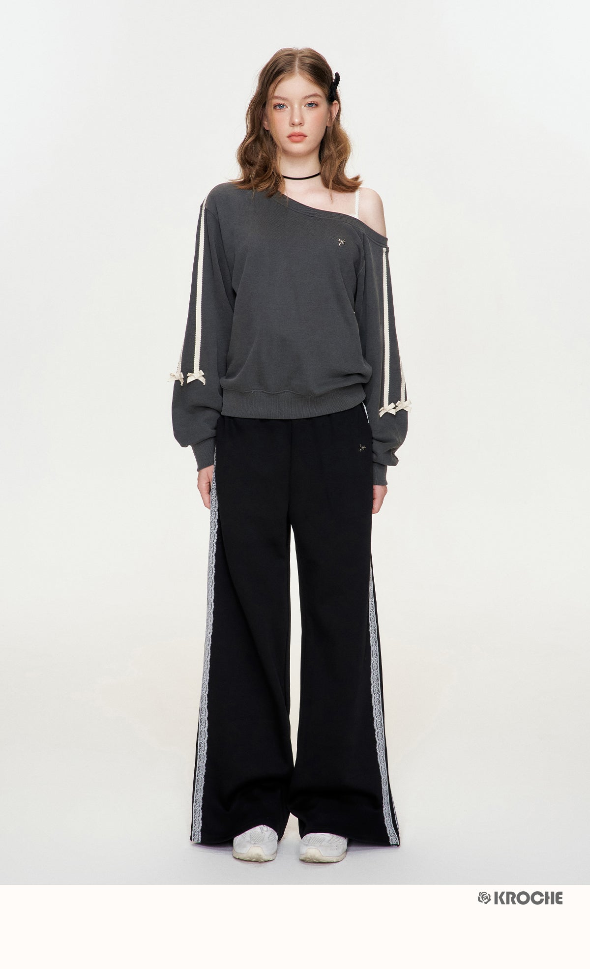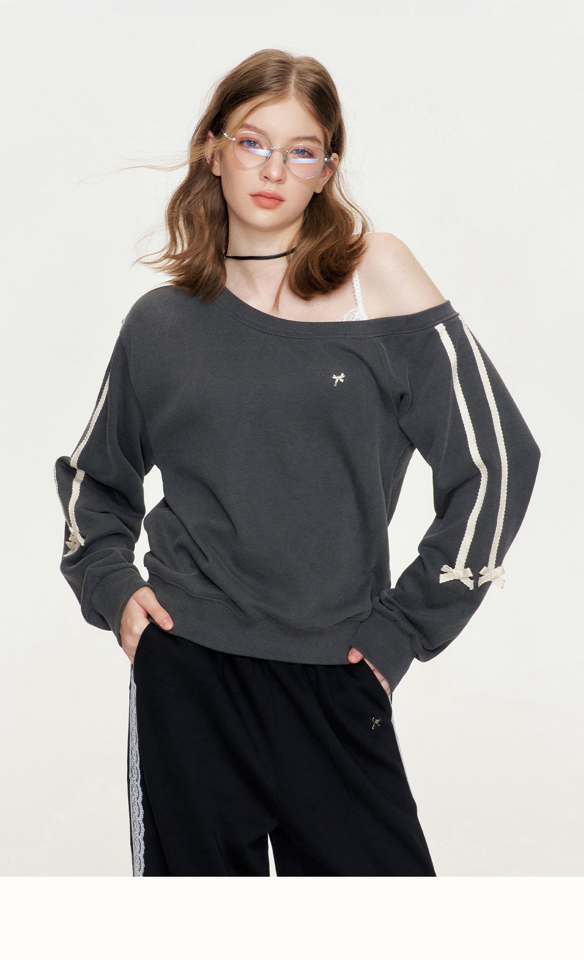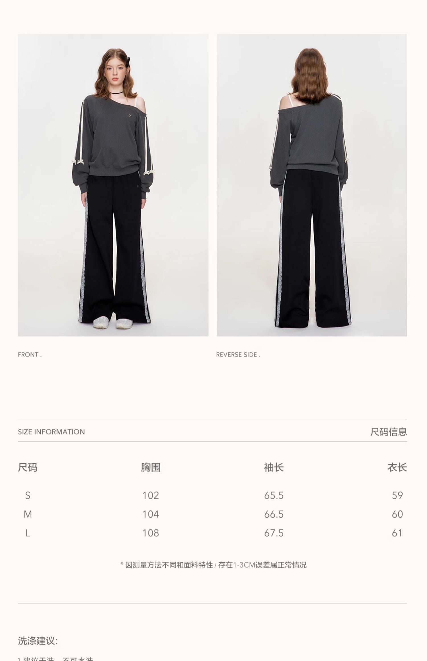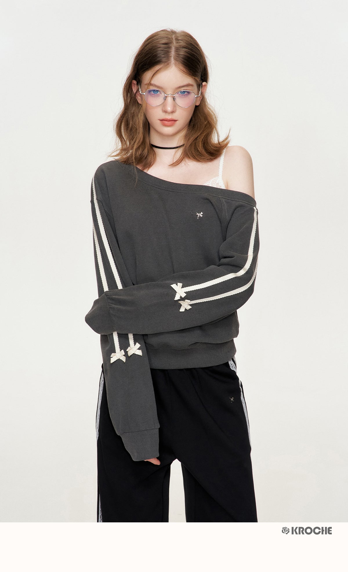 Kroche 2503 撞色花边 休闲宽松蝴蝶结斜肩卫衣