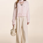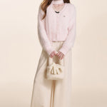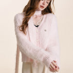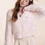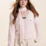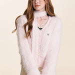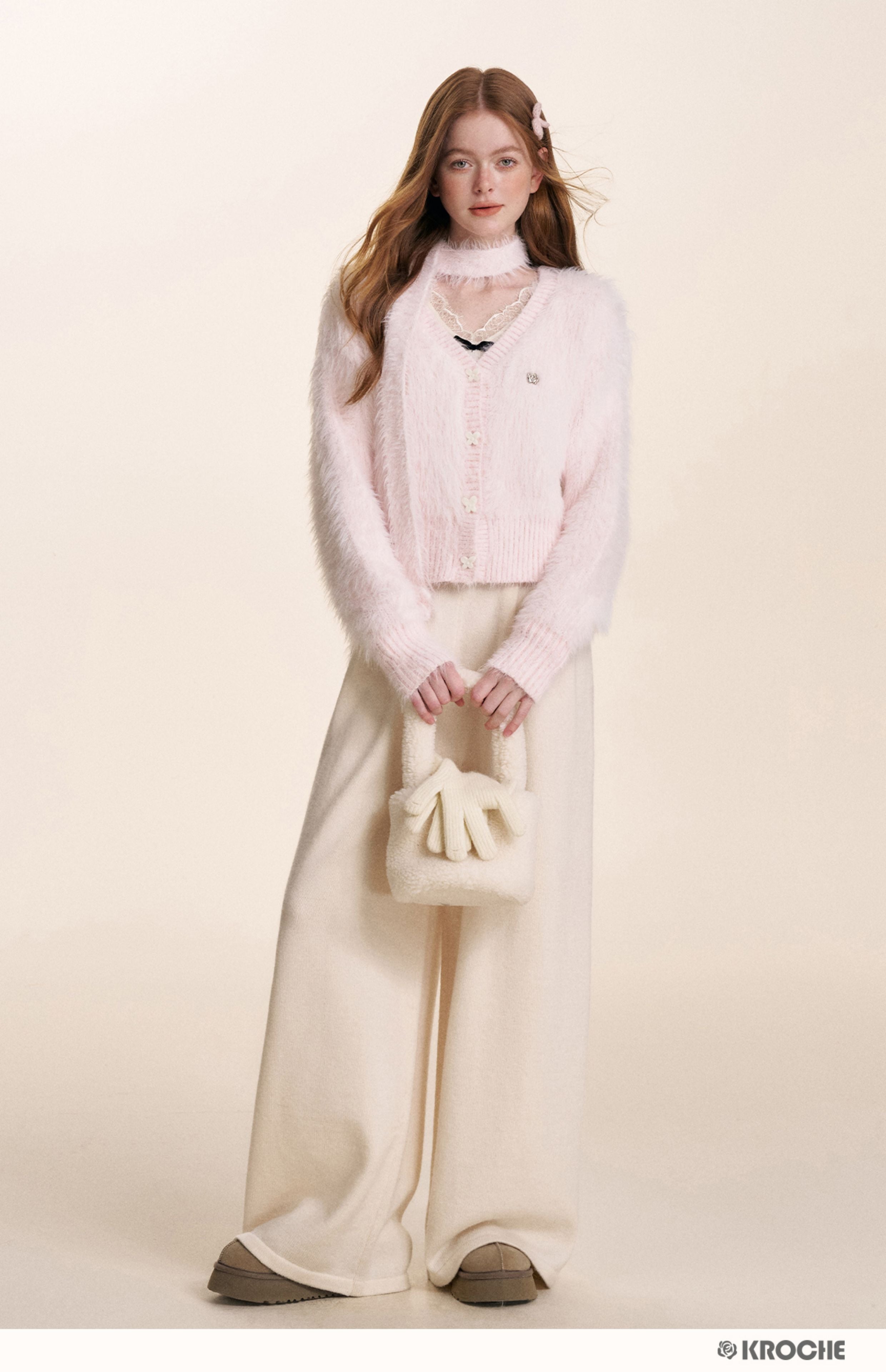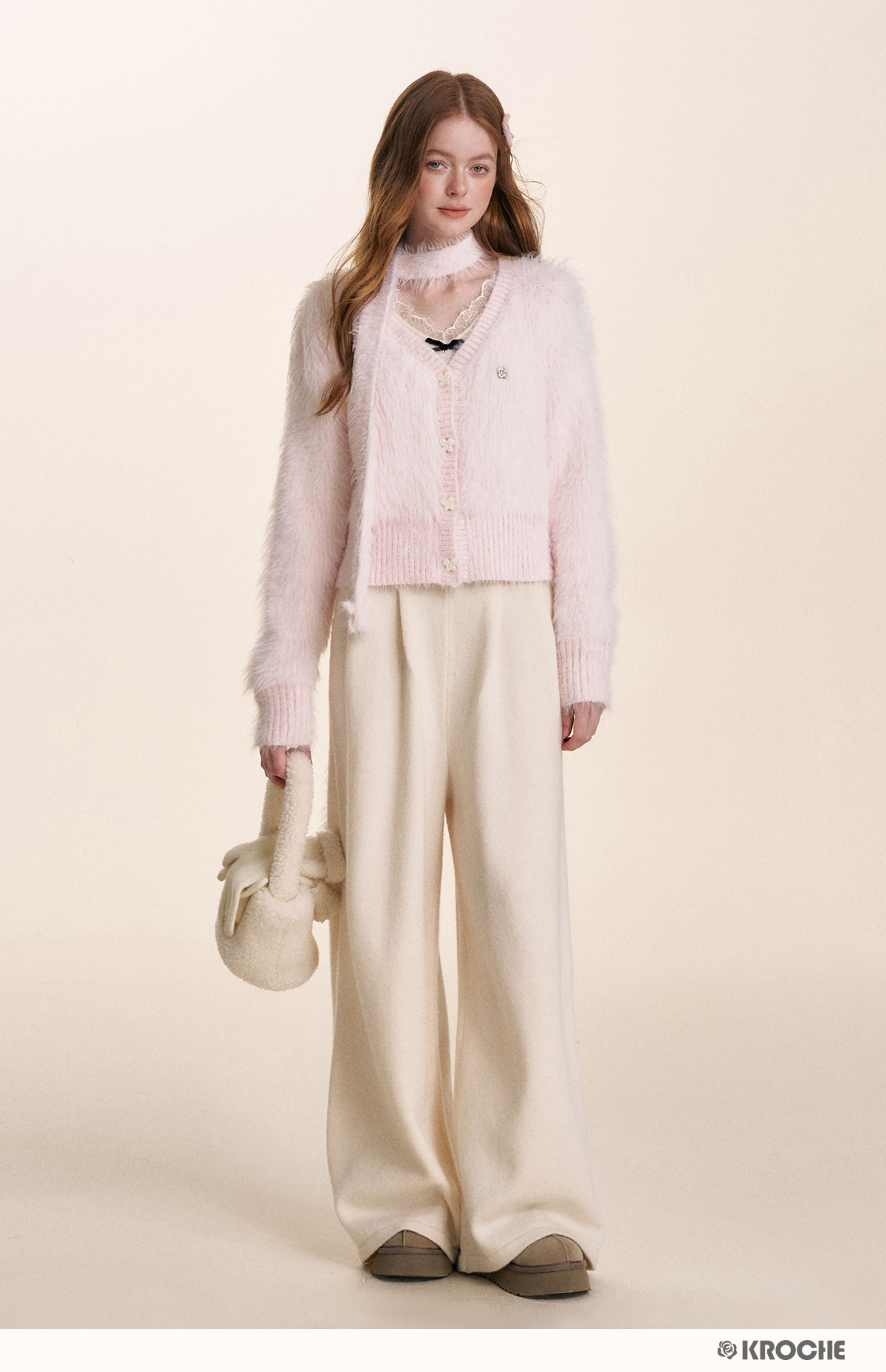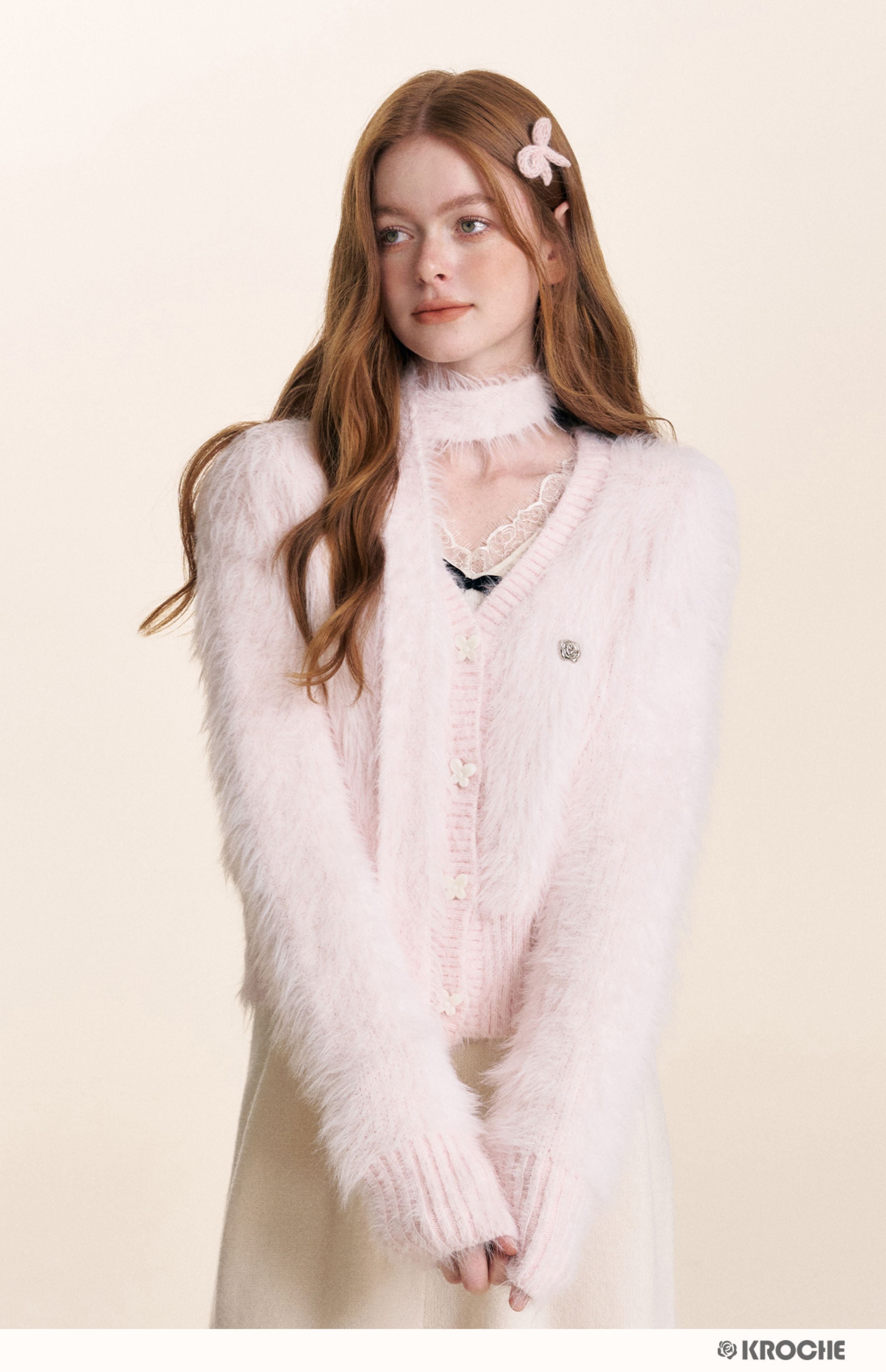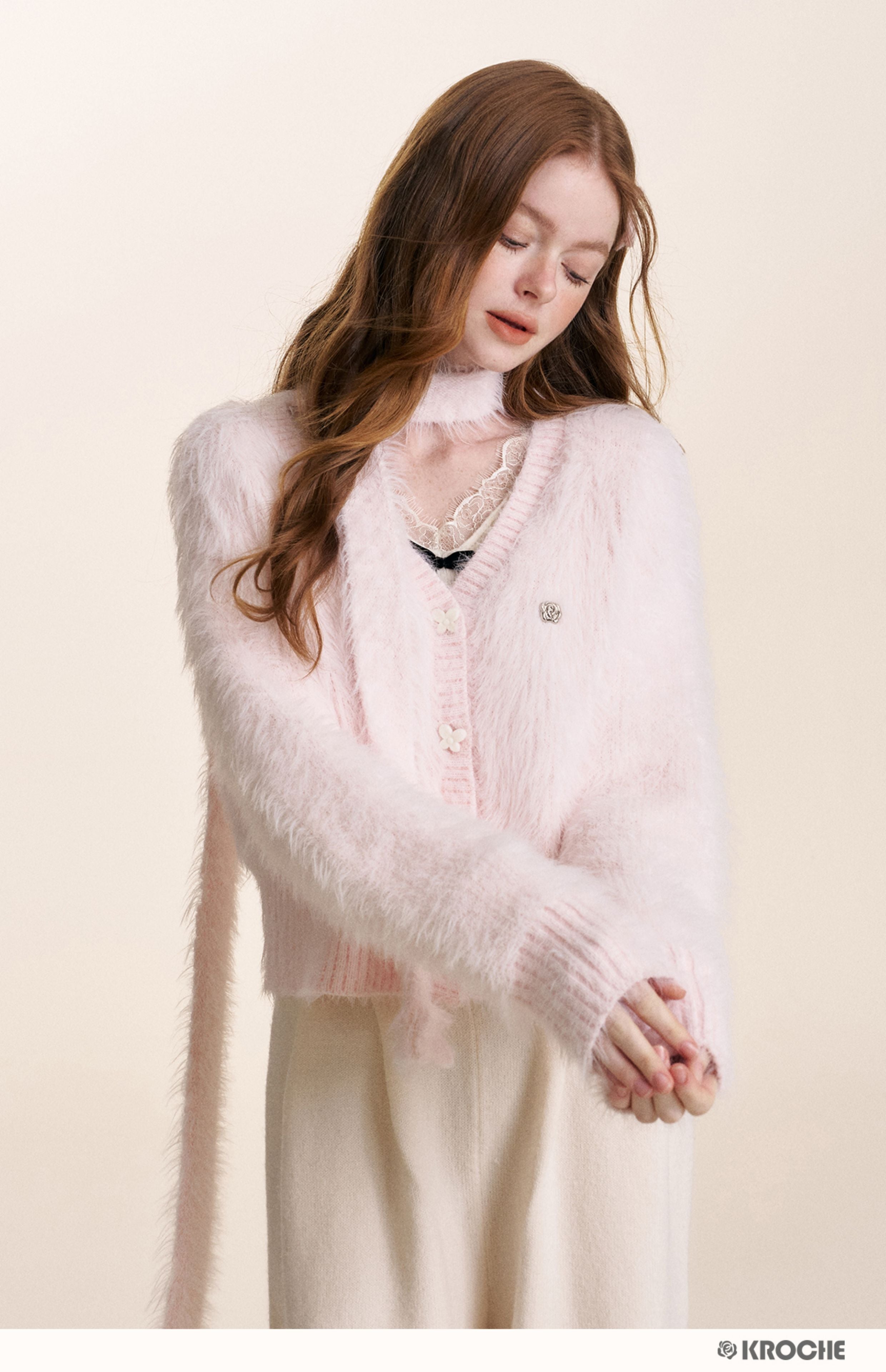 Kroche 2510 仿貂绒长毛V领丝绒扣针织开衫+围巾两件套