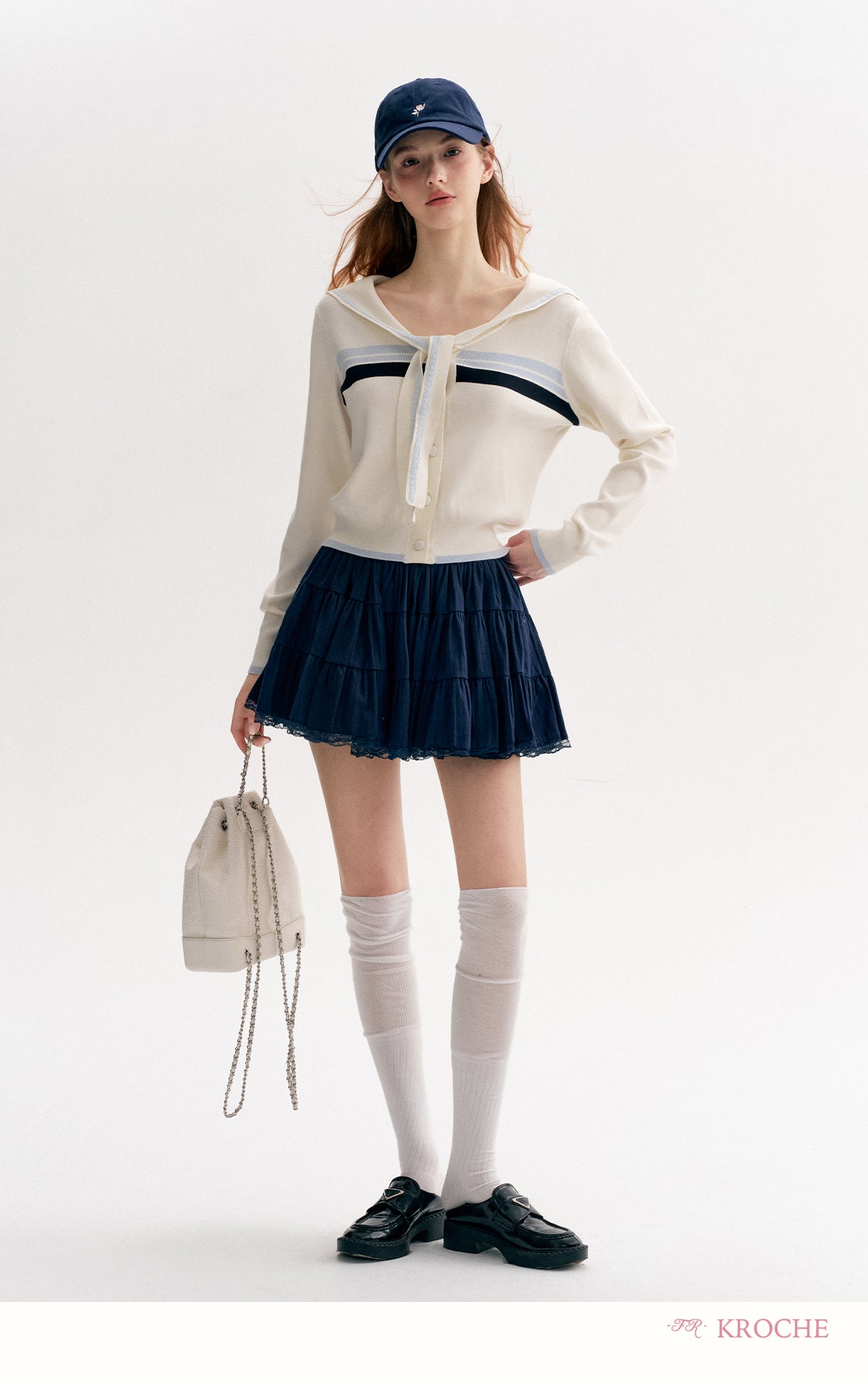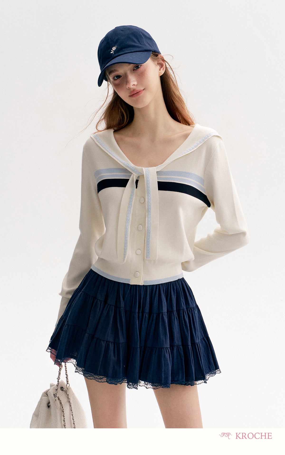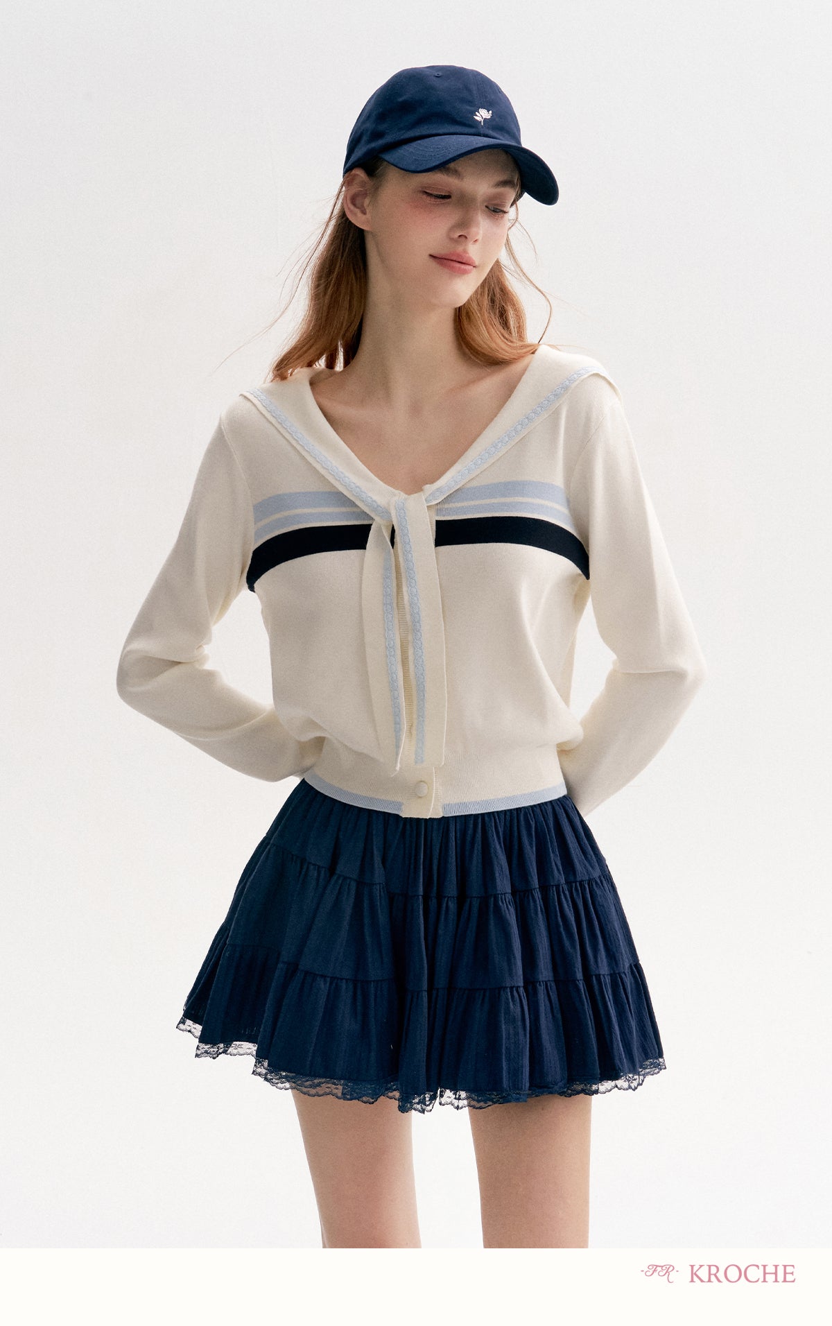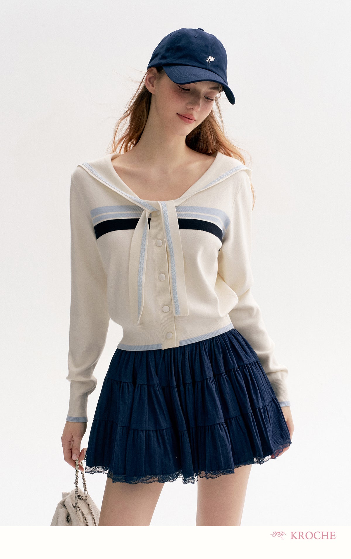Kroche 2510 定染蕾丝花边 海军领系带披肩撞色毛衣开衫