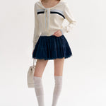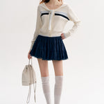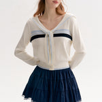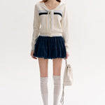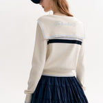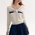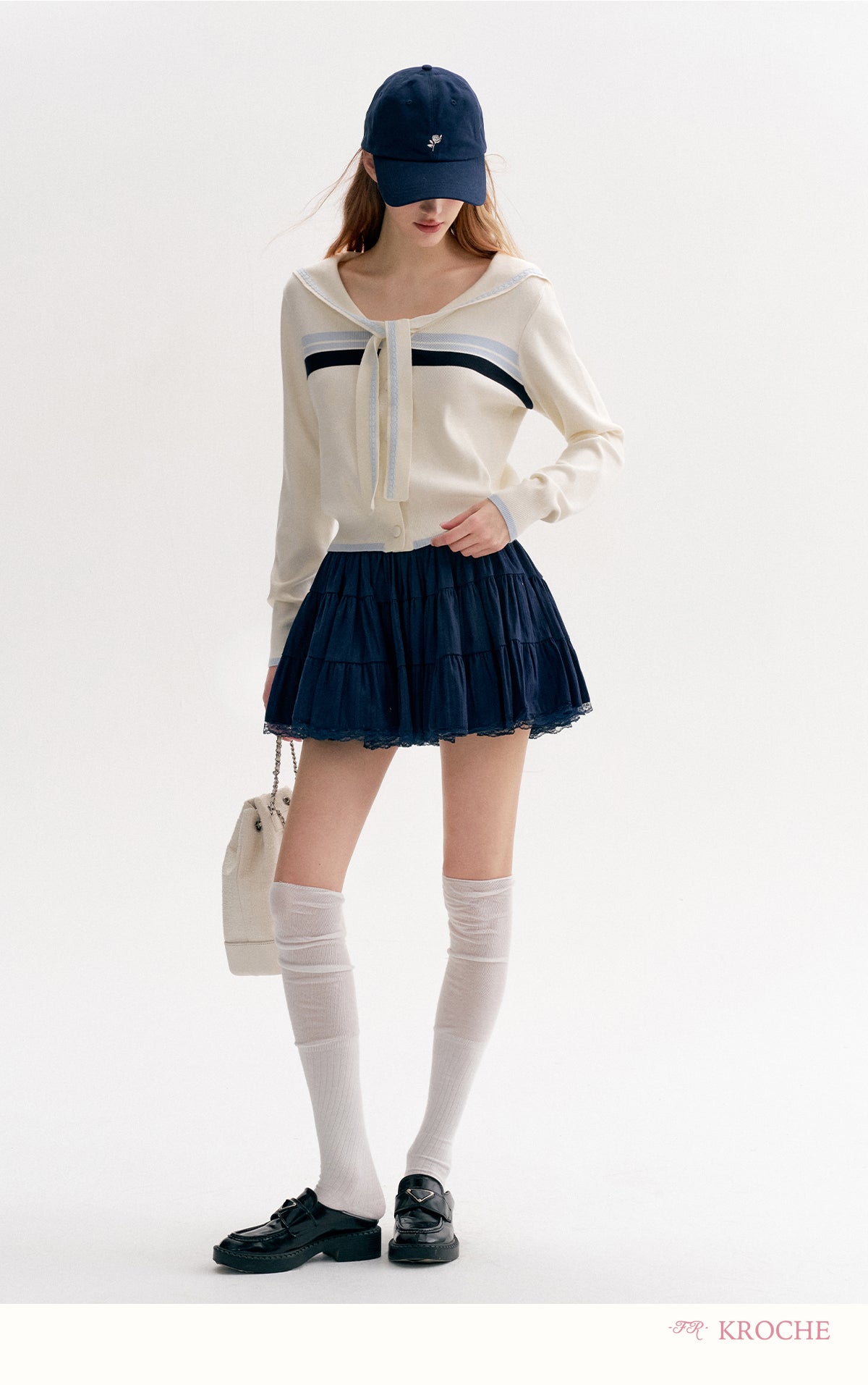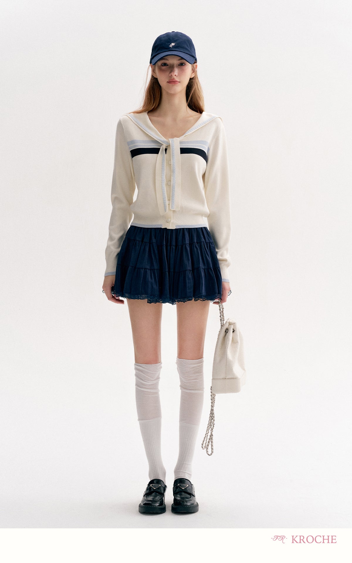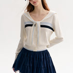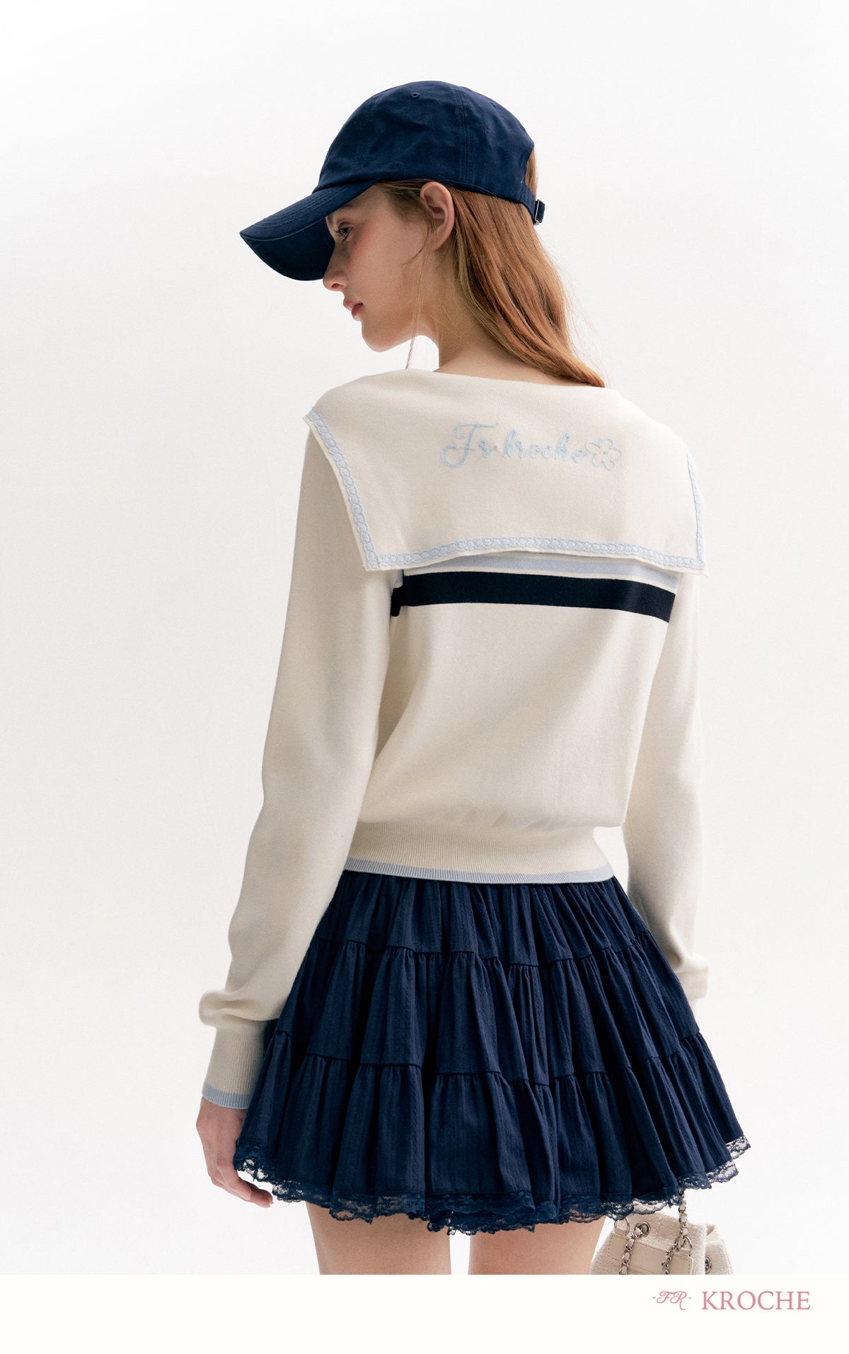 Kroche 2510 定染蕾丝花边 海军领系带披肩撞色毛衣开衫