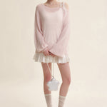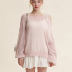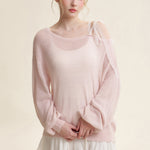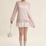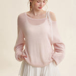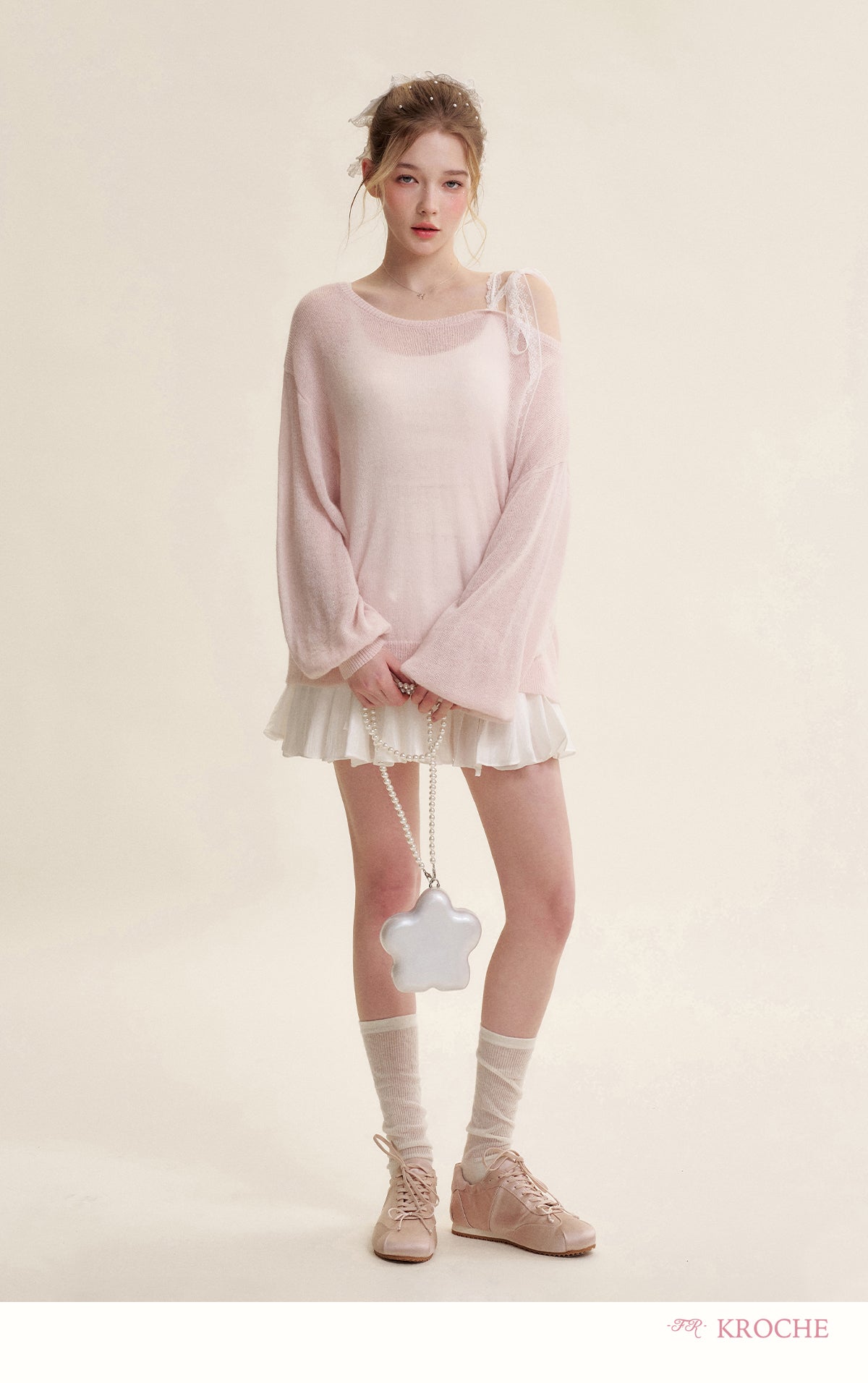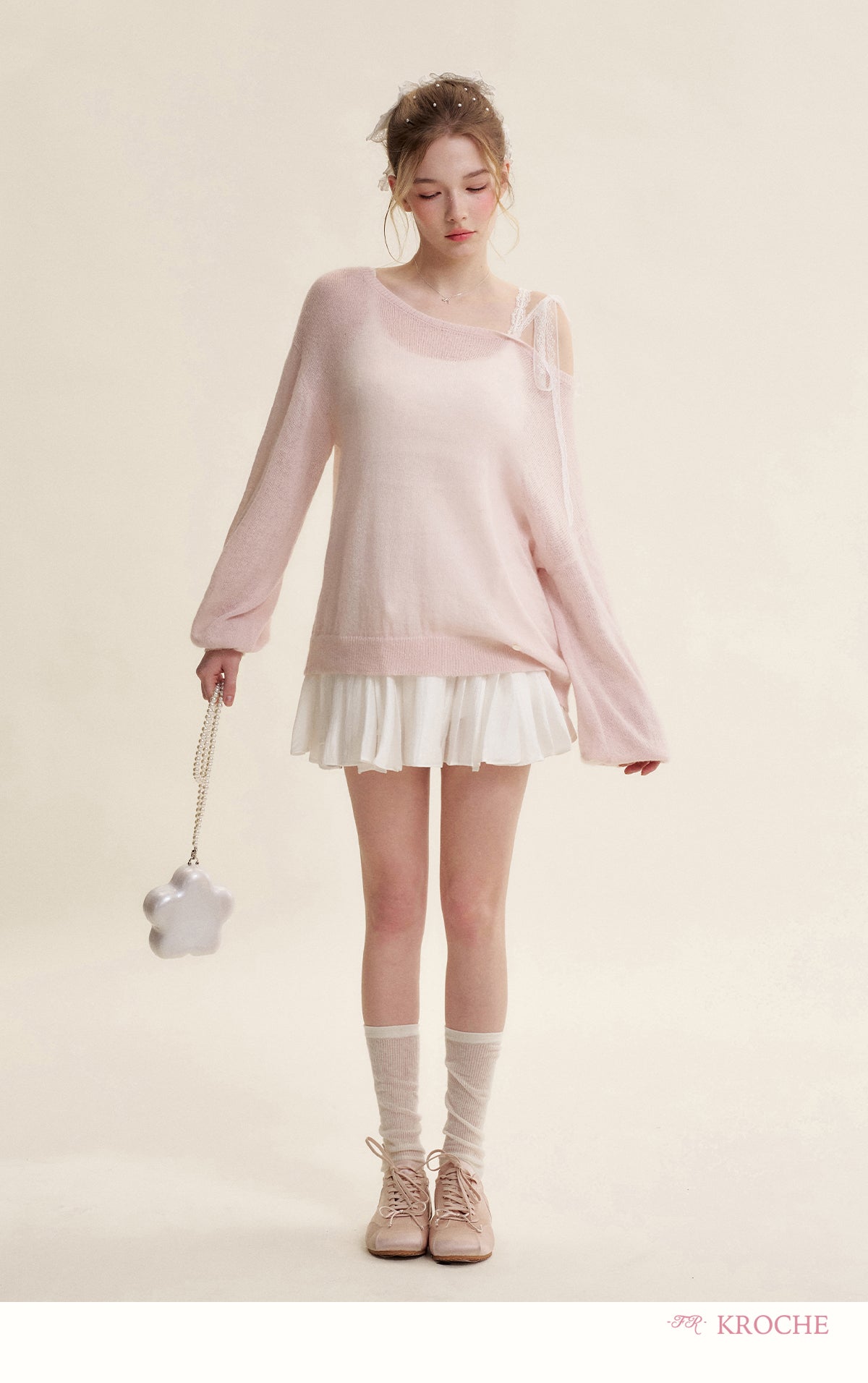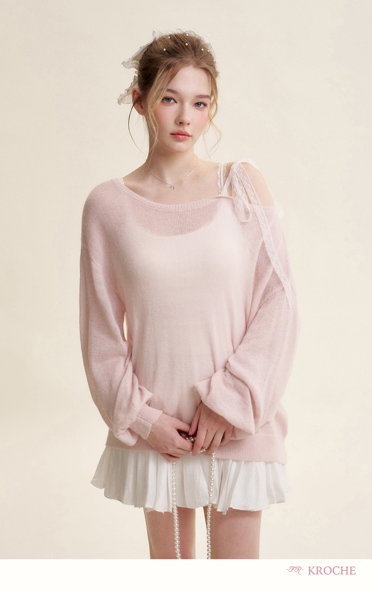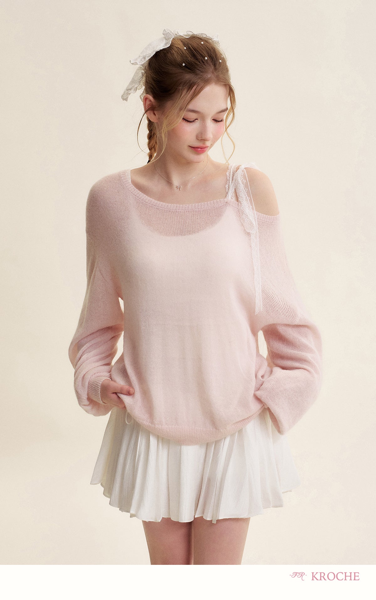 Kroche 2510 海毛羊毛混纺 镂空蕾丝系带斜肩针织衫