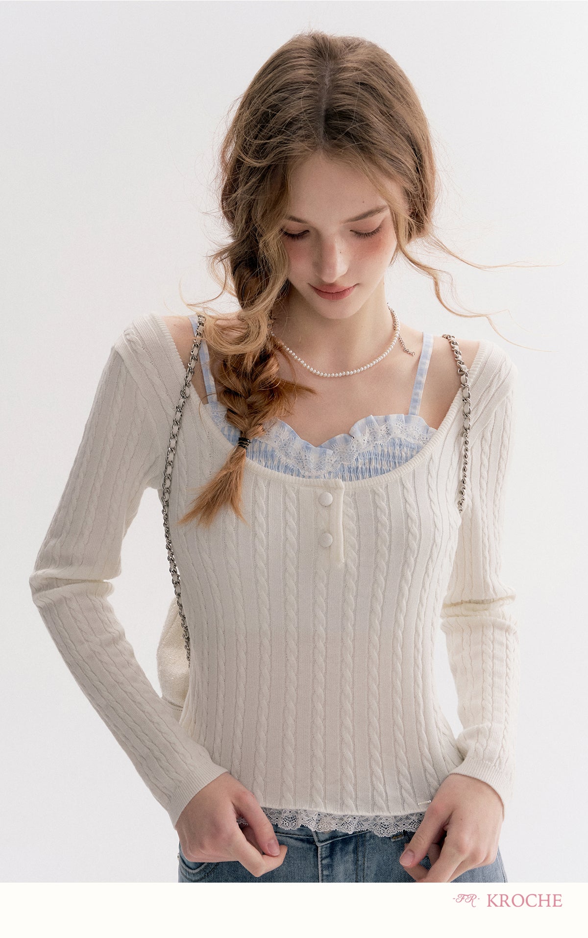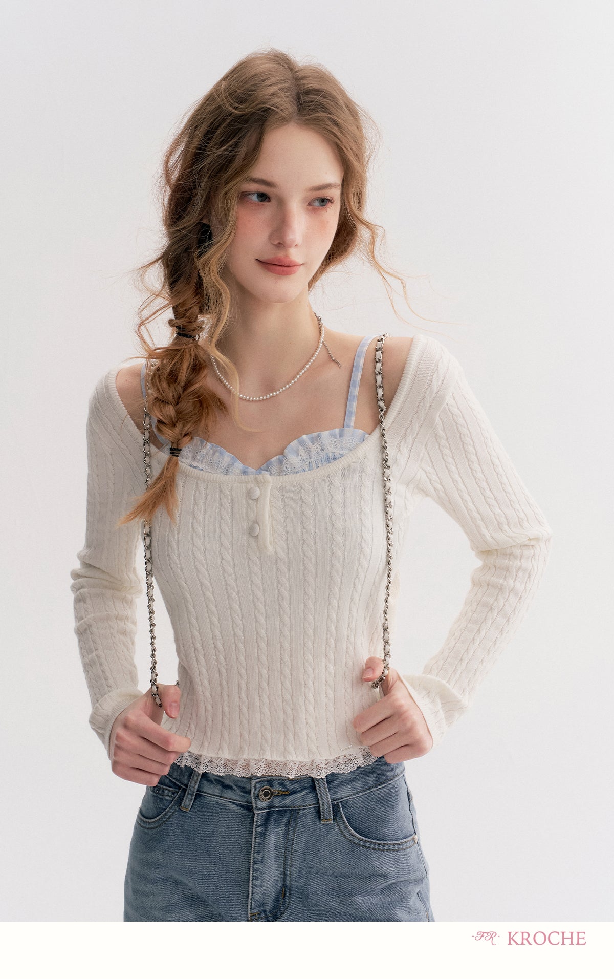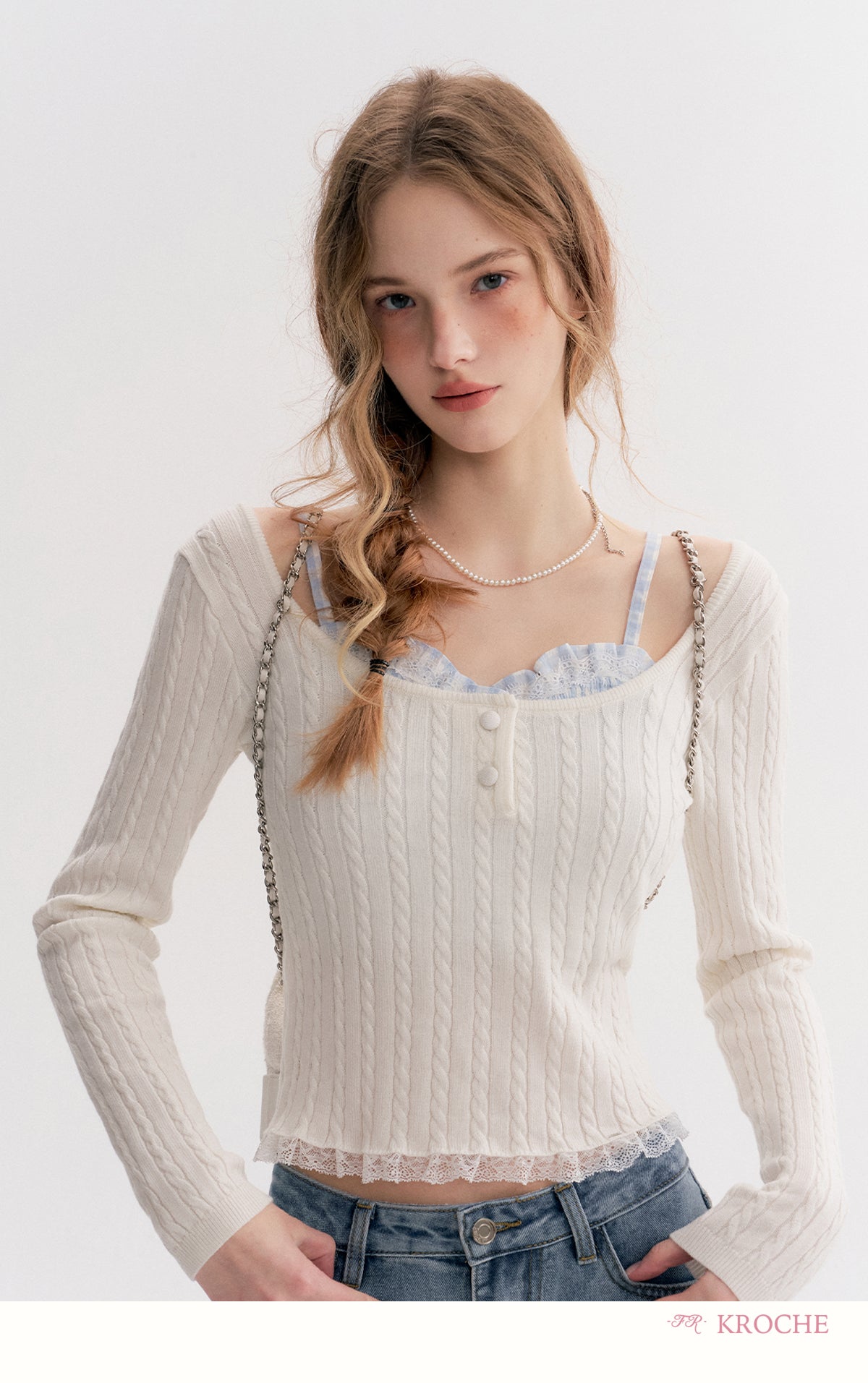 Kroche 2511 打揽格纹蕾丝花边假两件绞花针织衫 白