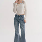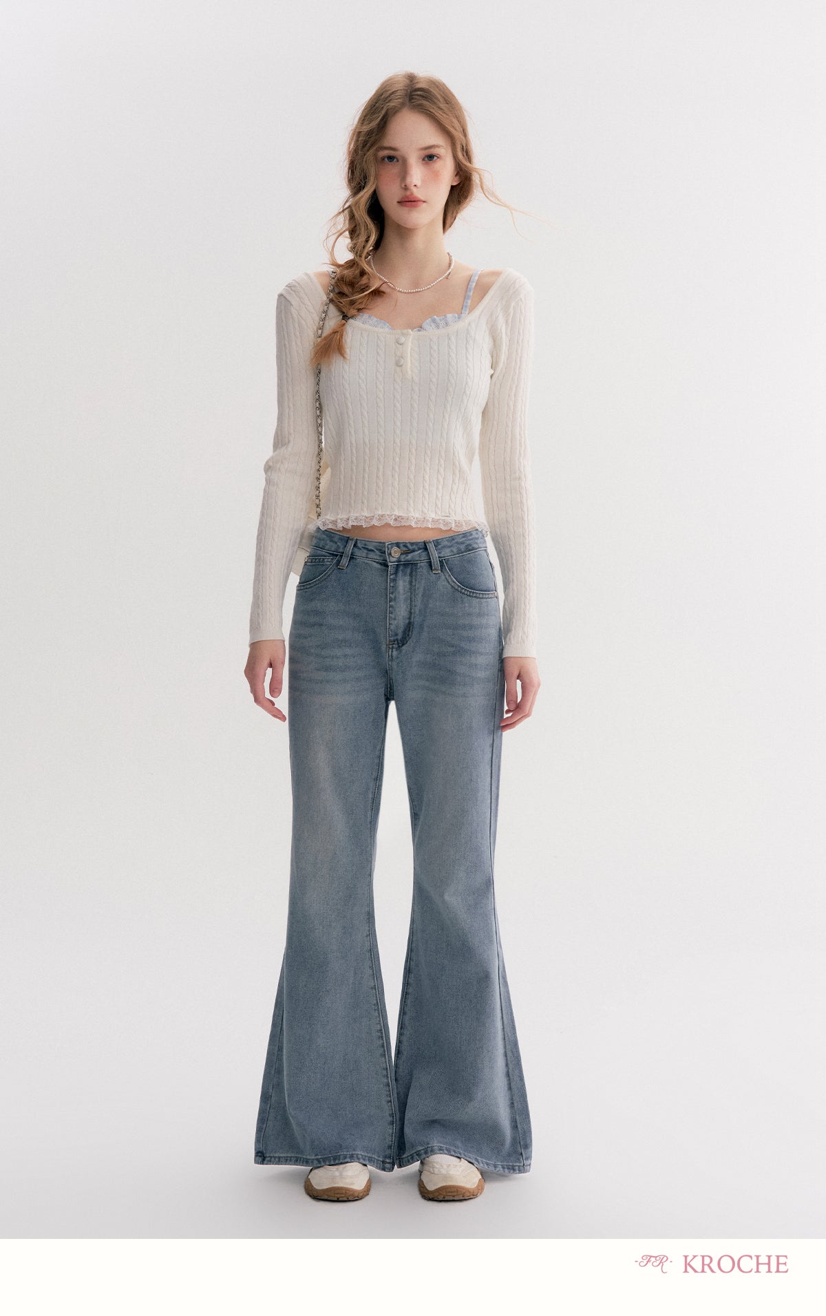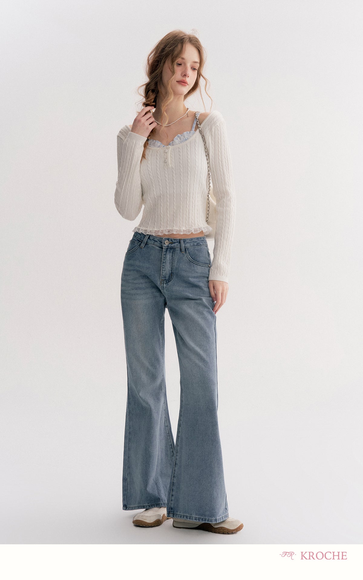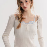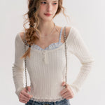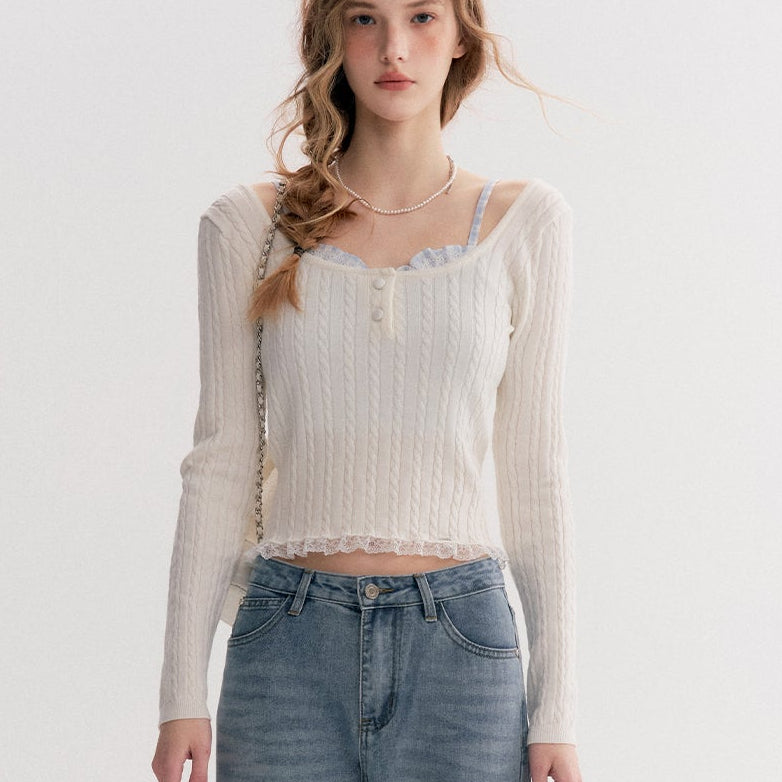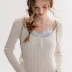Kroche 2511 打揽格纹蕾丝花边假两件绞花针织衫 白
