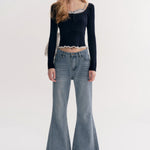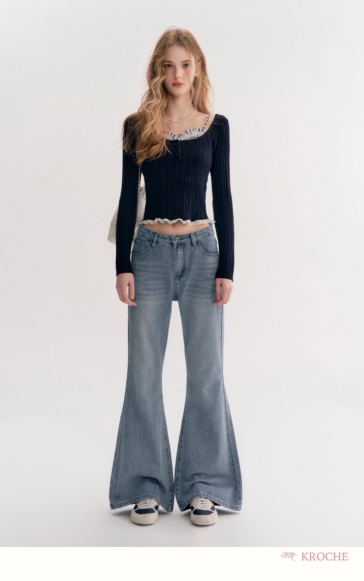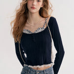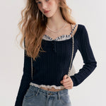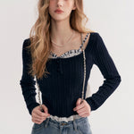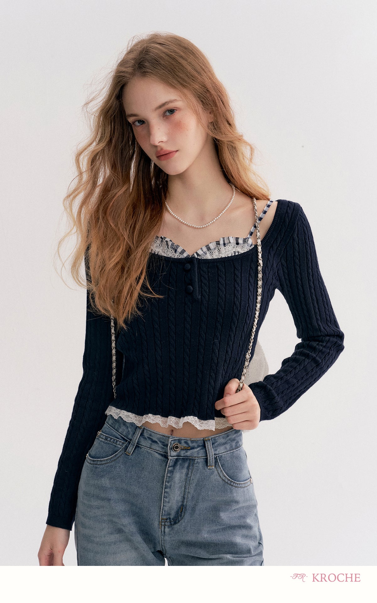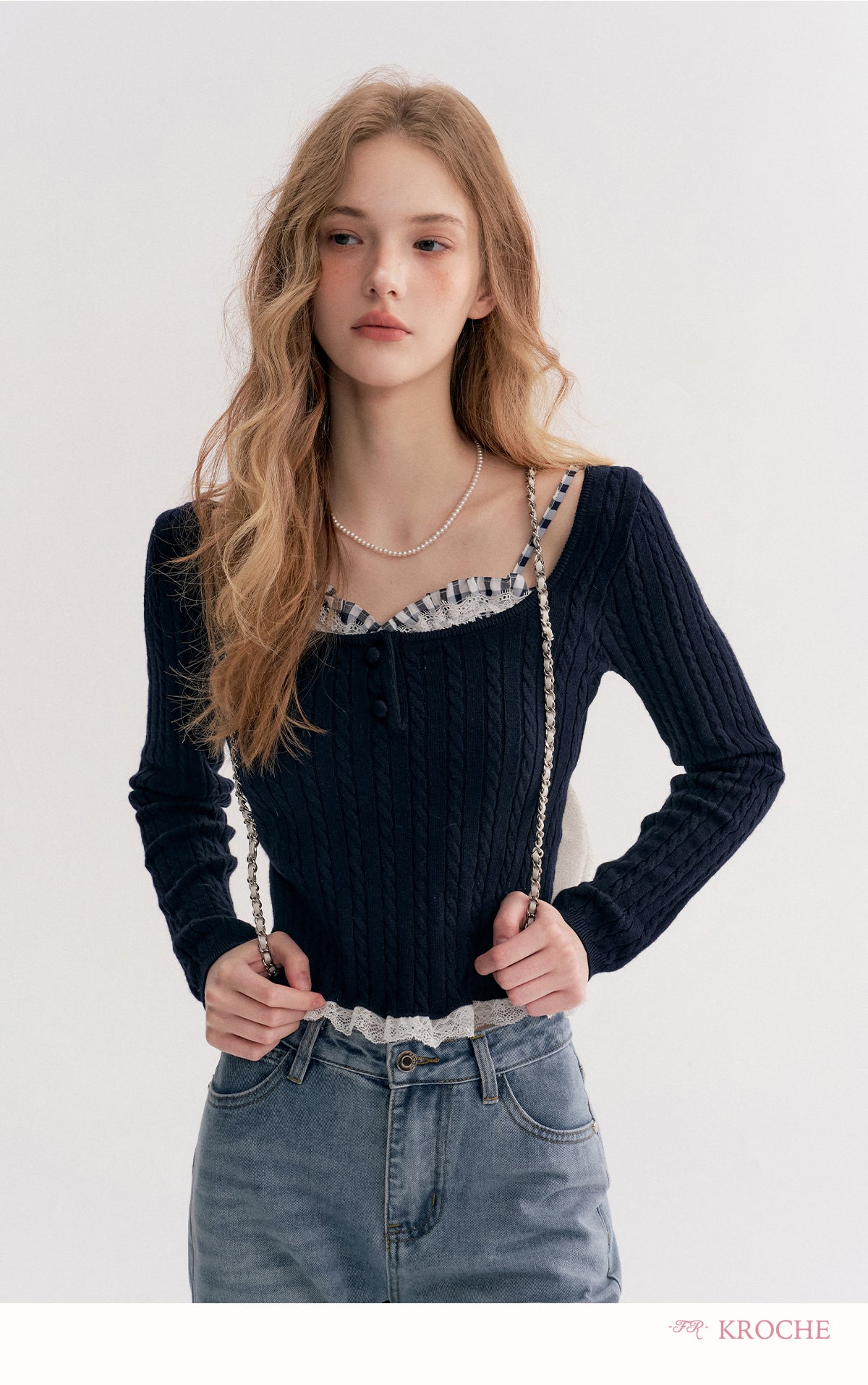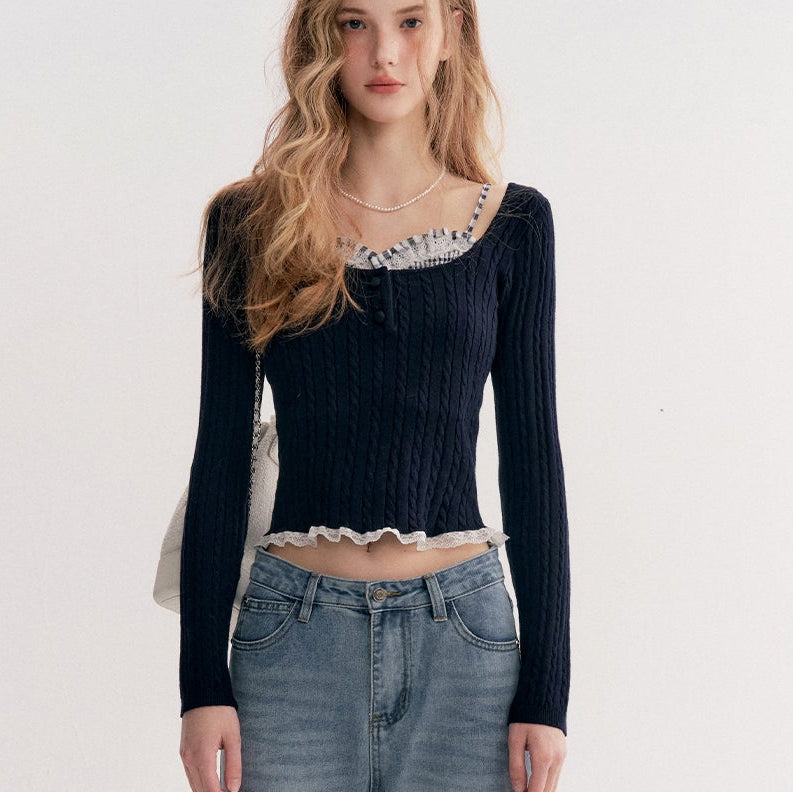 Kroche 2511 打揽格纹蕾丝花边假两件绞花针织衫 藏青