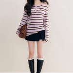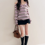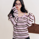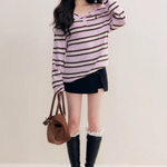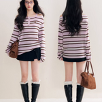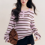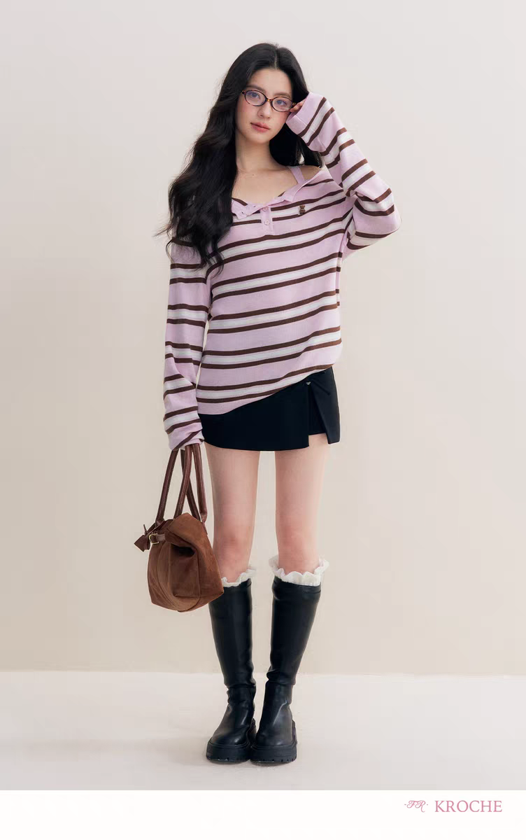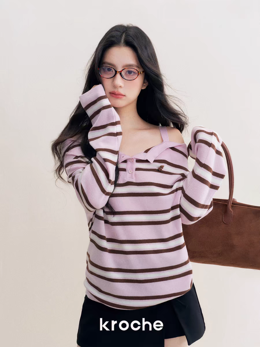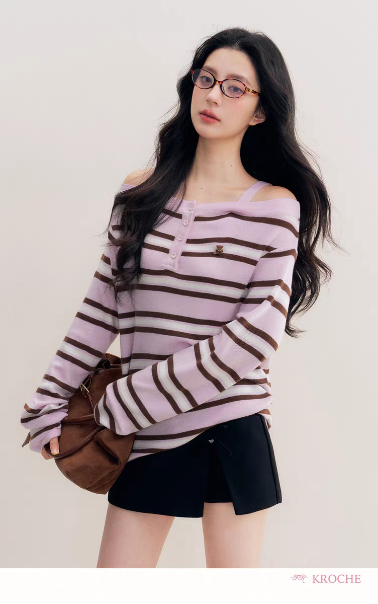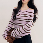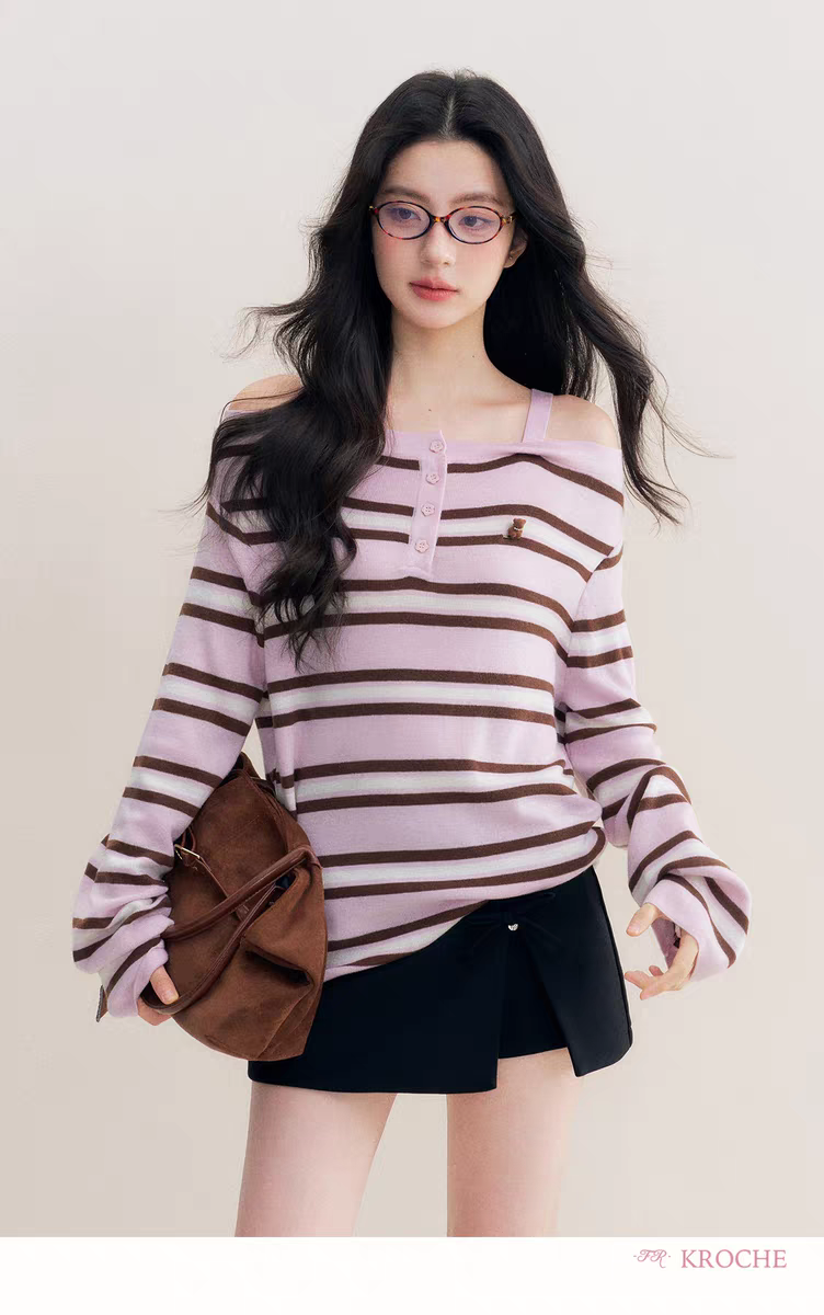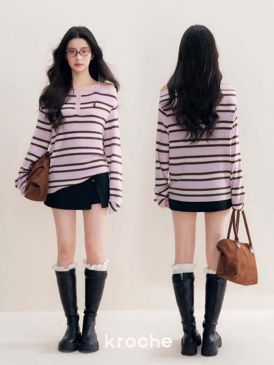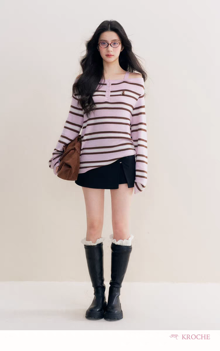 Kroche 2511 撞色一字肩条纹针织衫