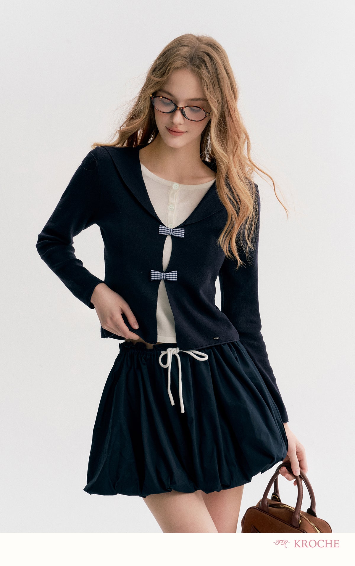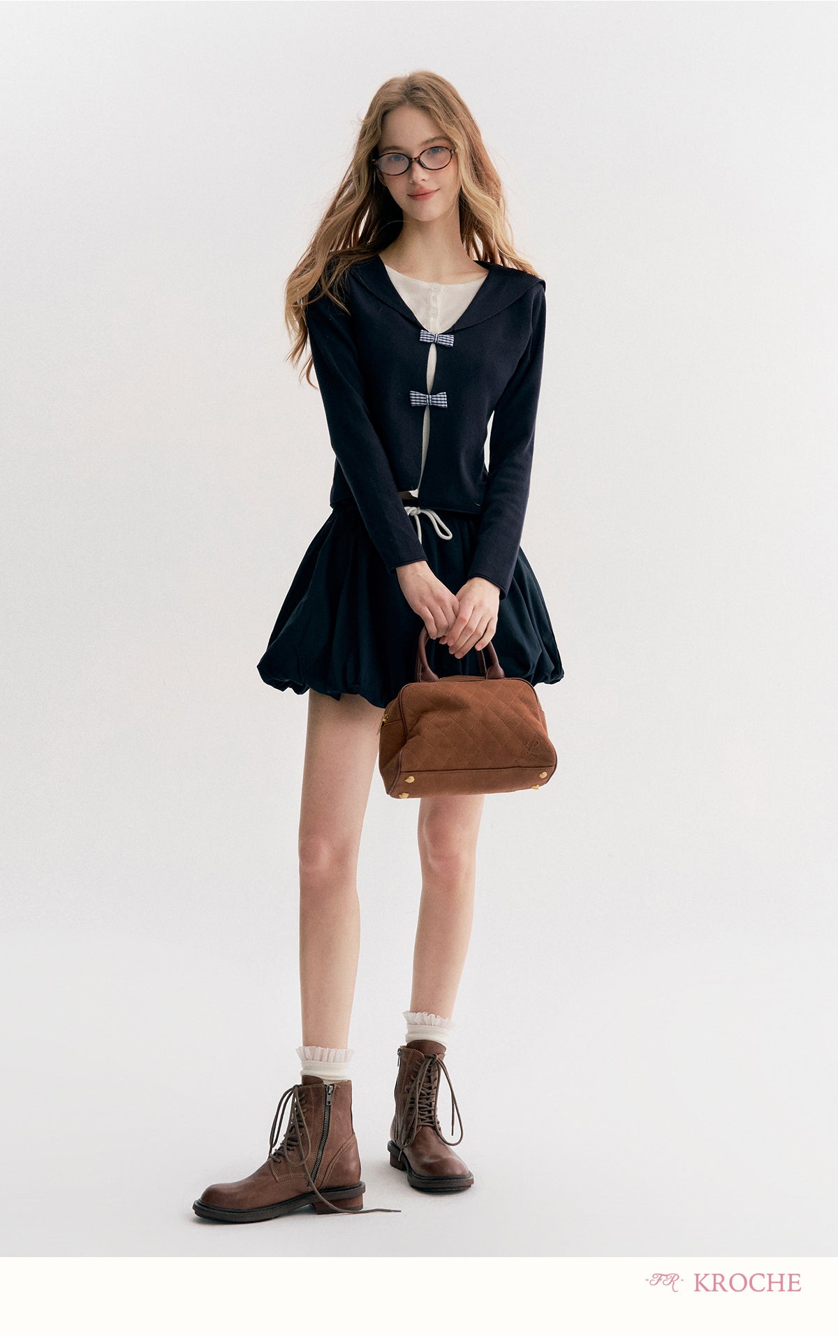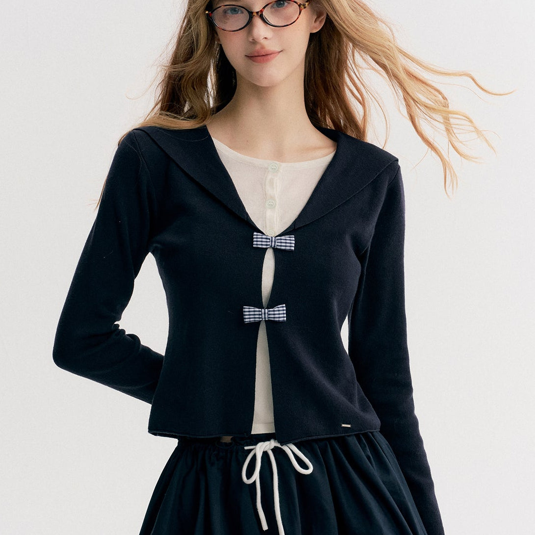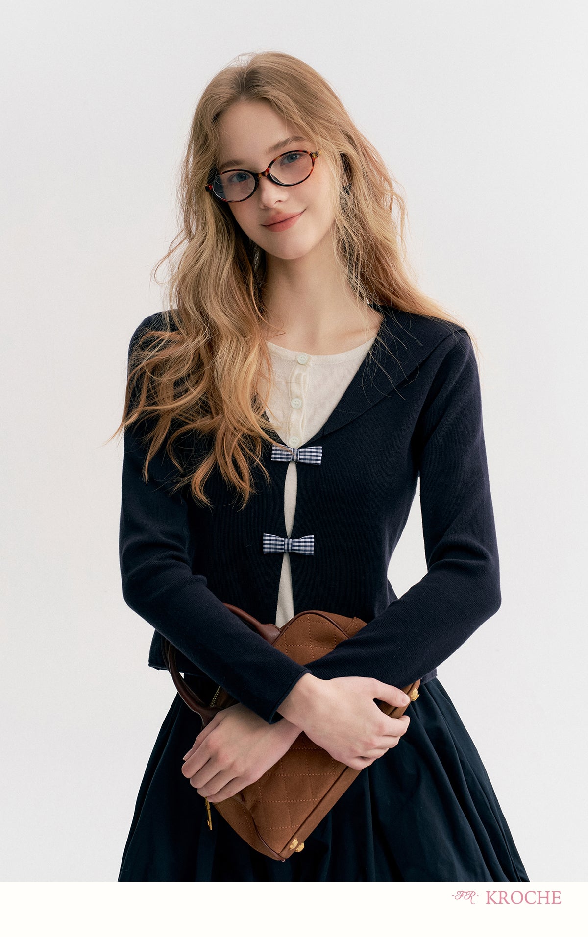 Kroche 2511 格纹蝴蝶结假两件 海军领针织衫上衣