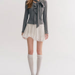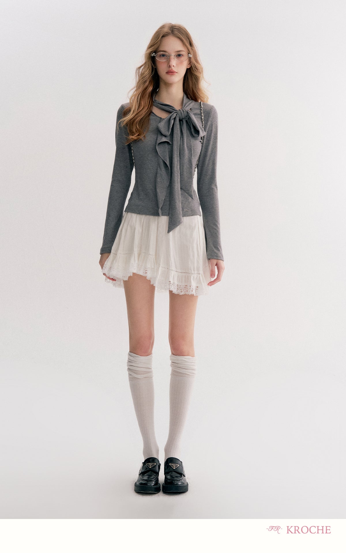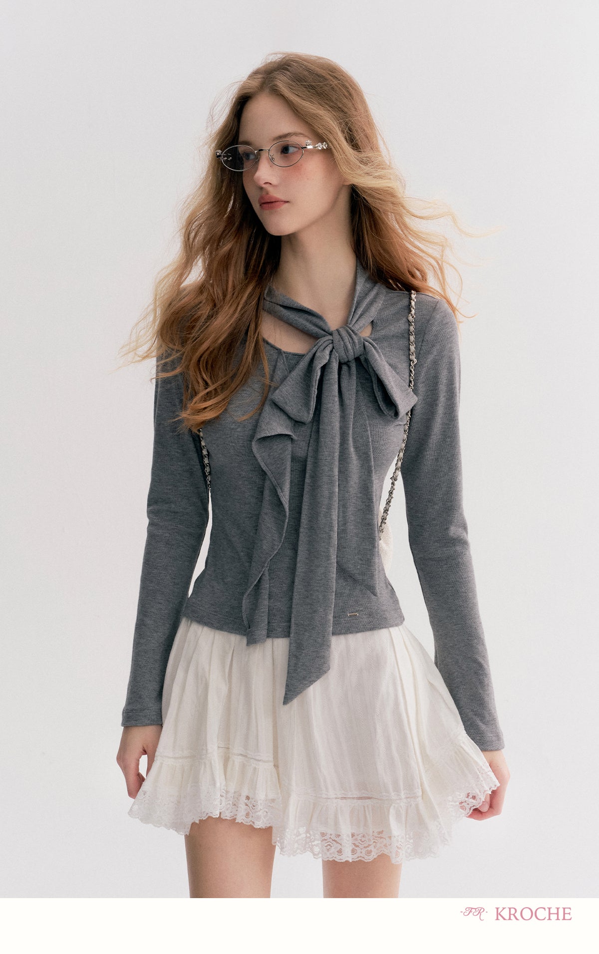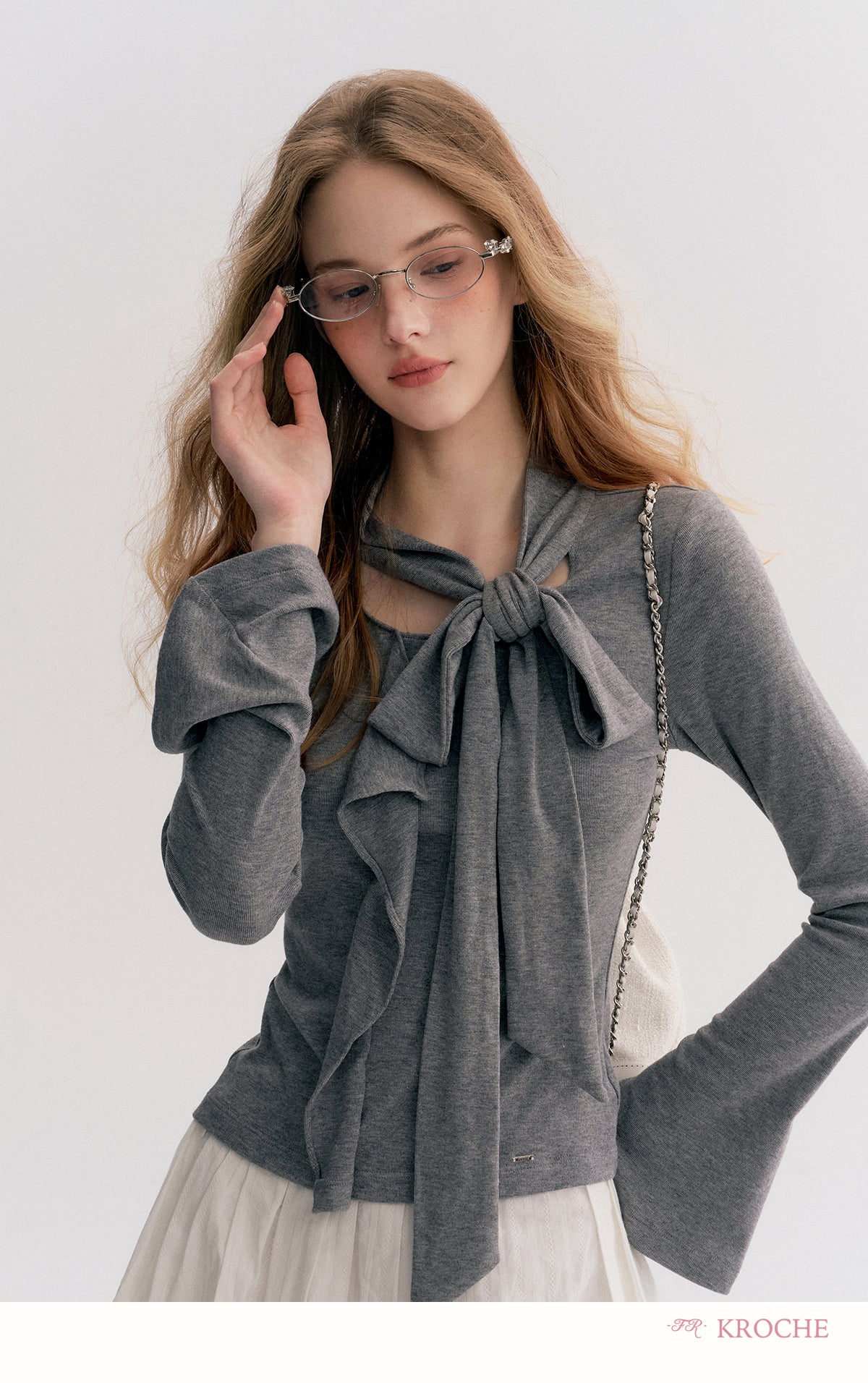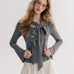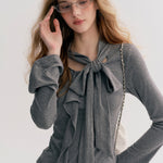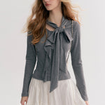 Kroche 2511 设计感飘带蝴蝶结V领长袖修身T恤 灰