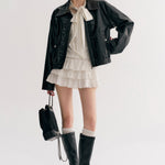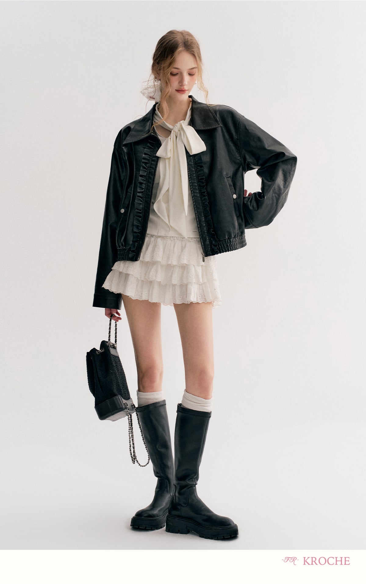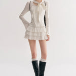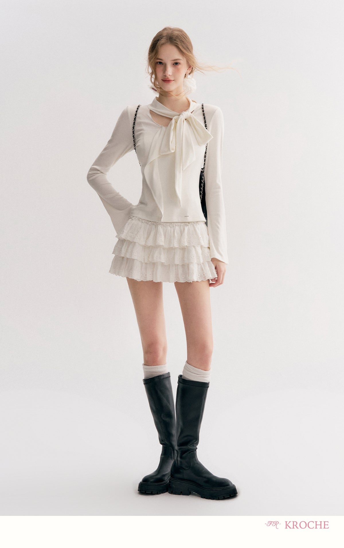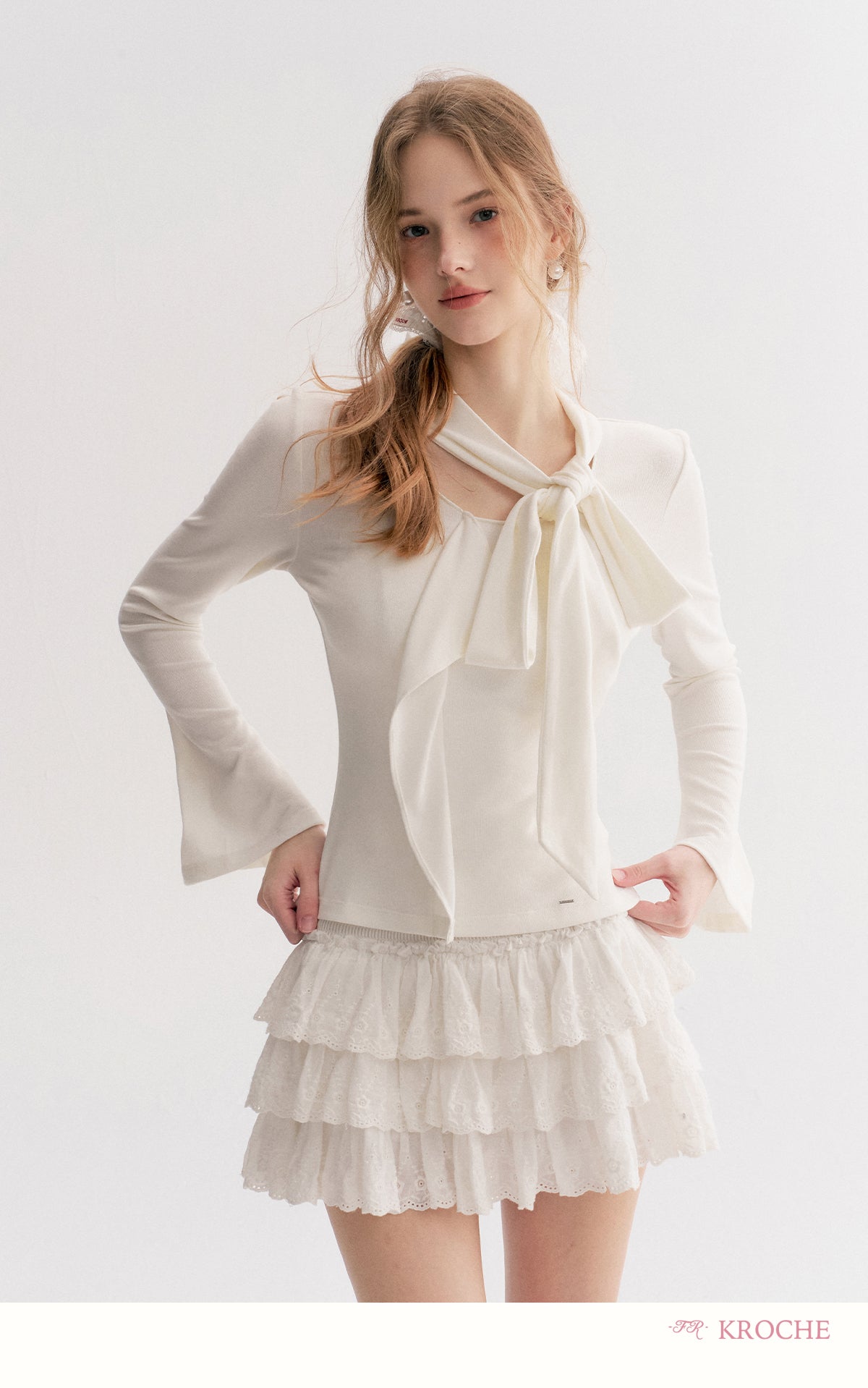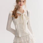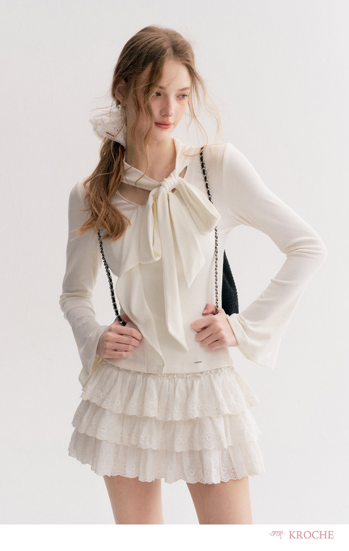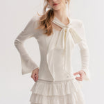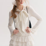 Kroche 2511 设计感飘带蝴蝶结V领长袖修身T恤 白