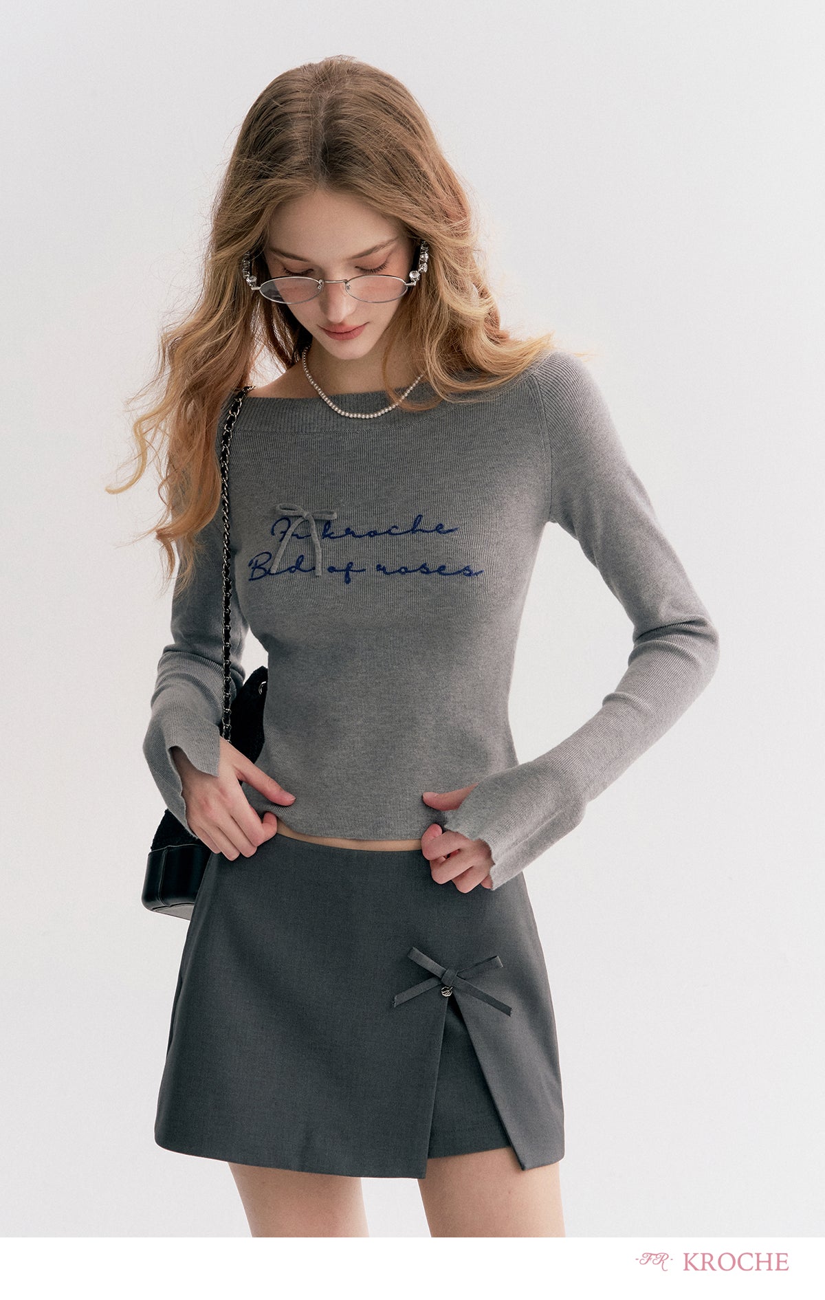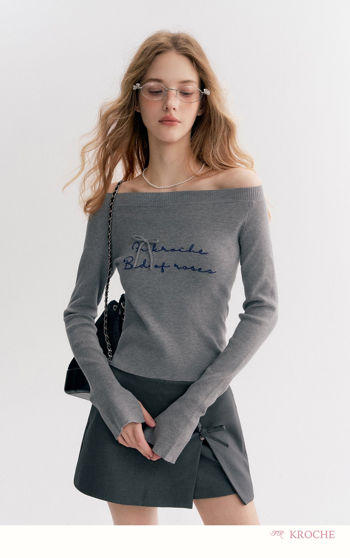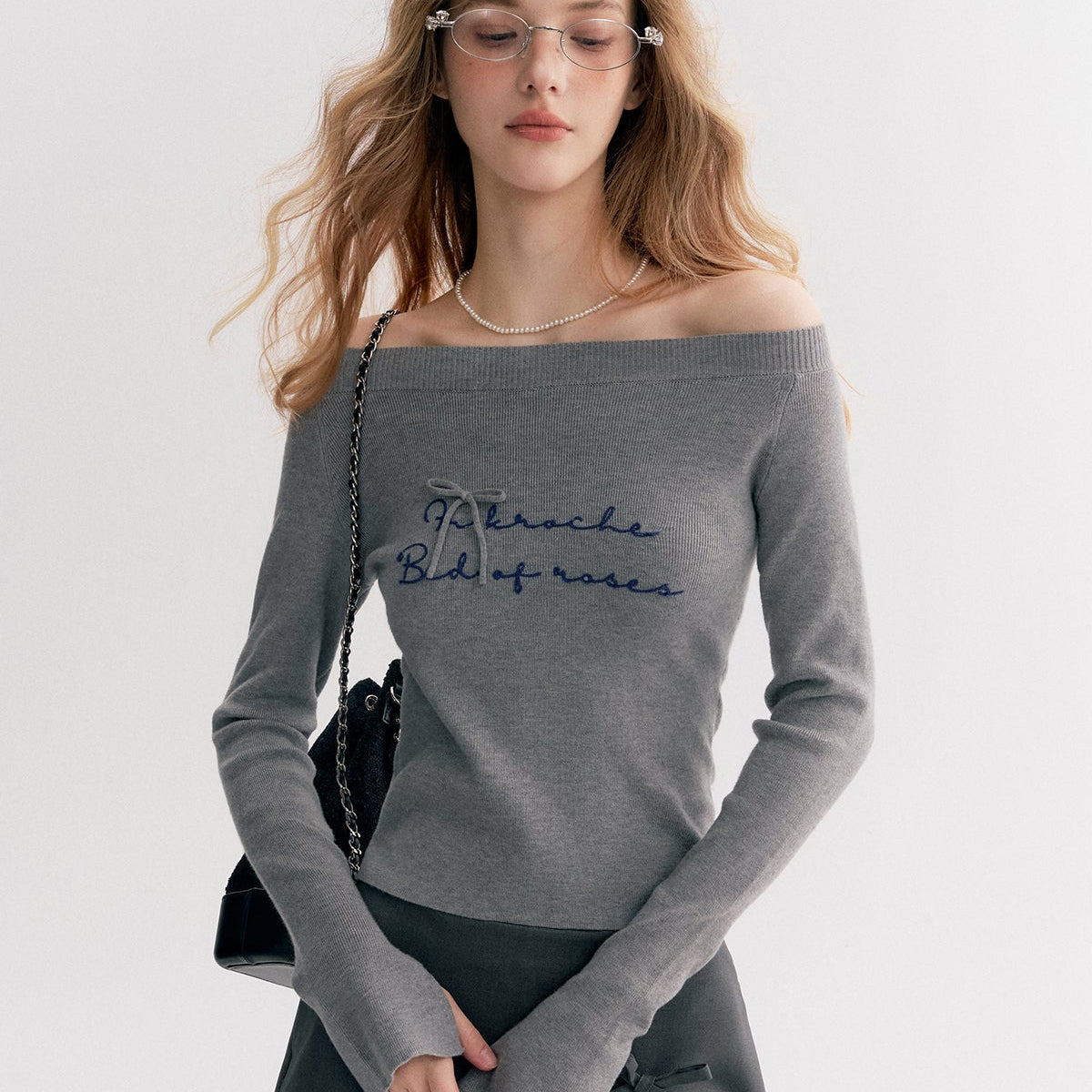 Kroche 2511 重工刺绣 两穿一字领修身长袖针织衫 灰