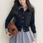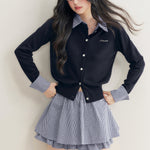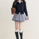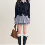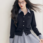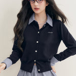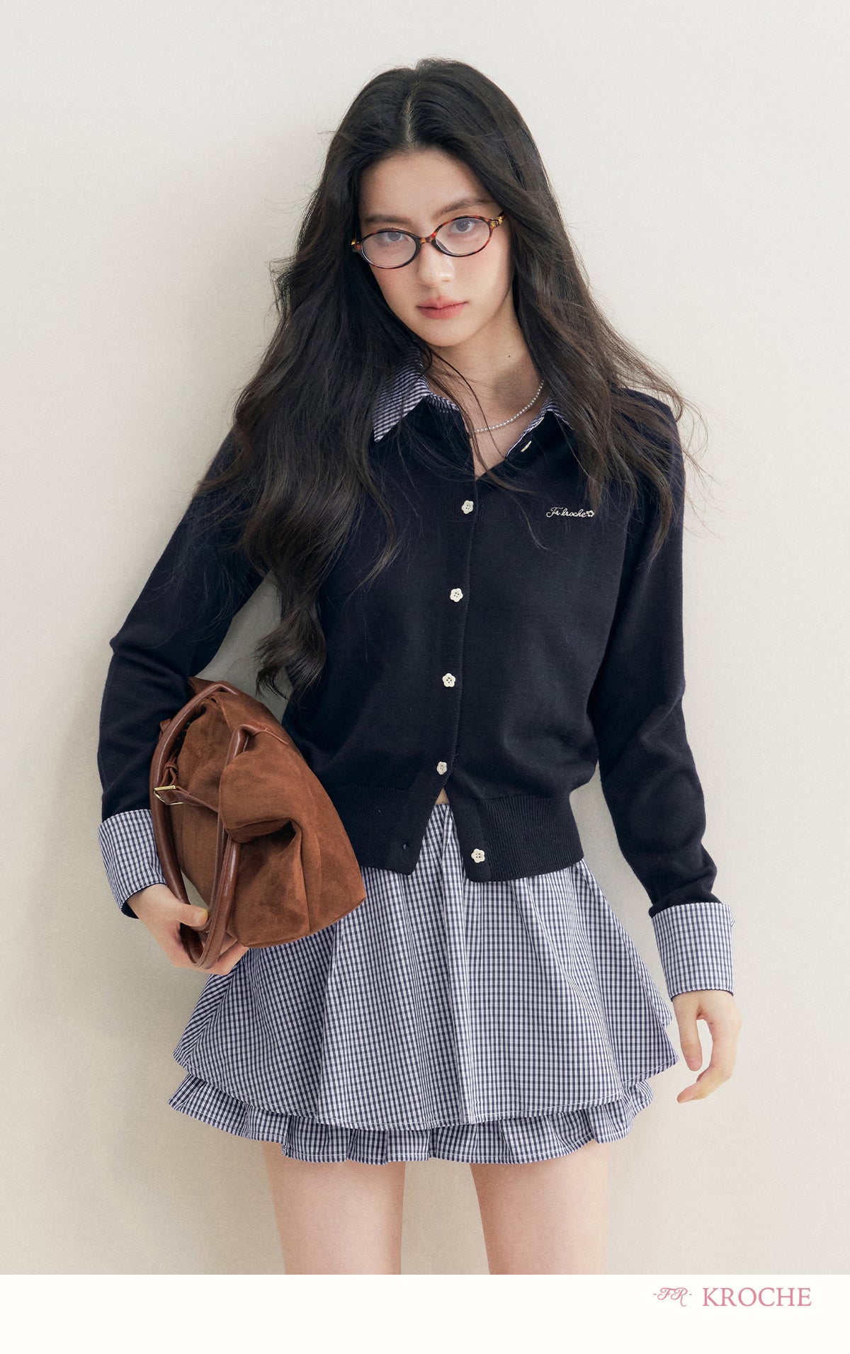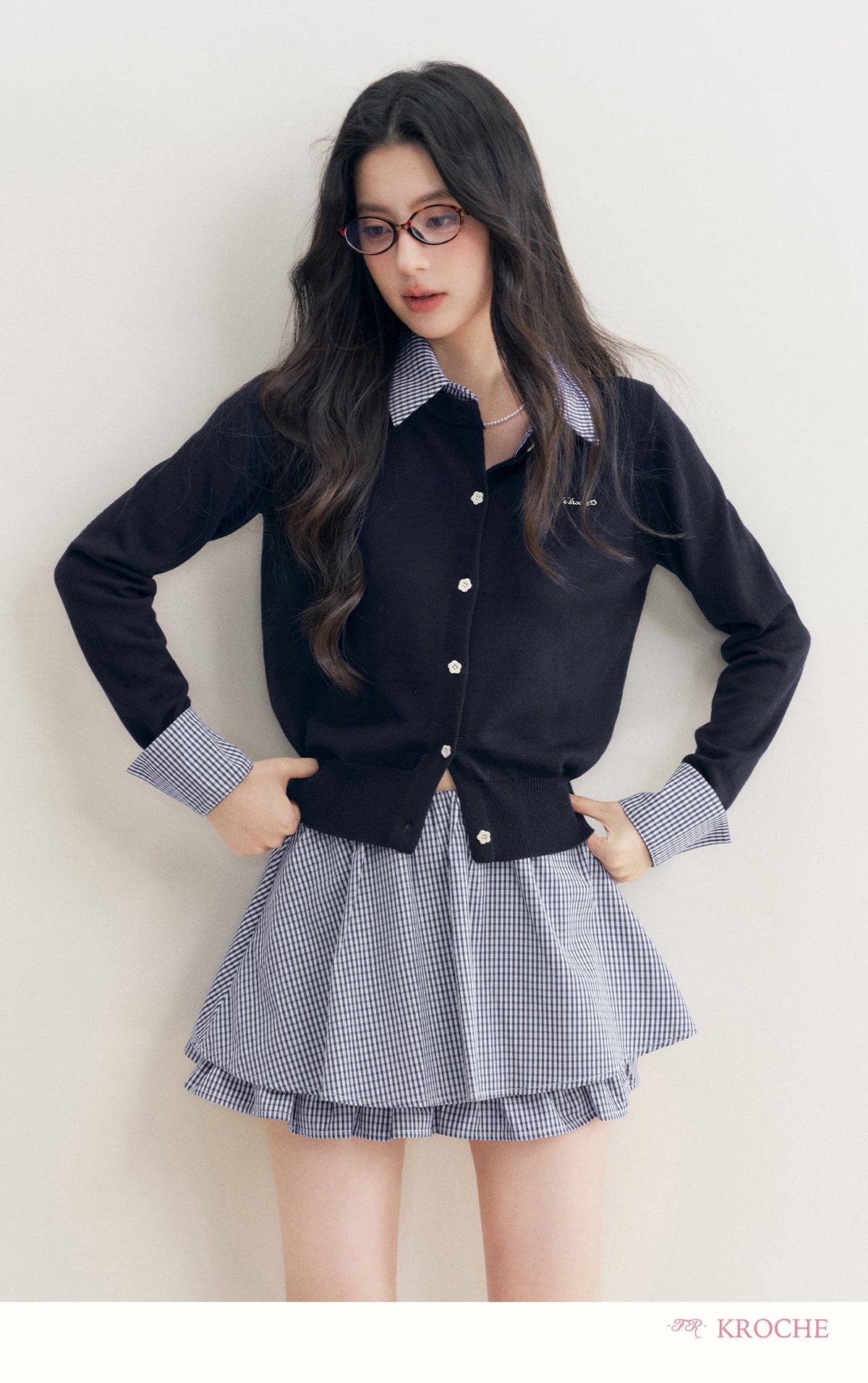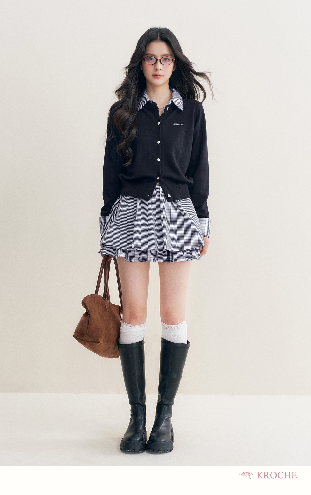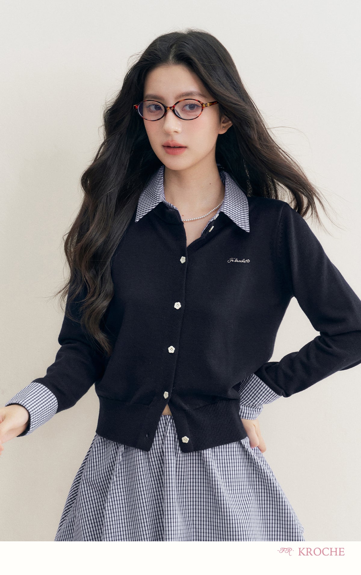 Kroche 2512 羊毛混纺 格纹翻领拼接假两件针织开衫