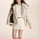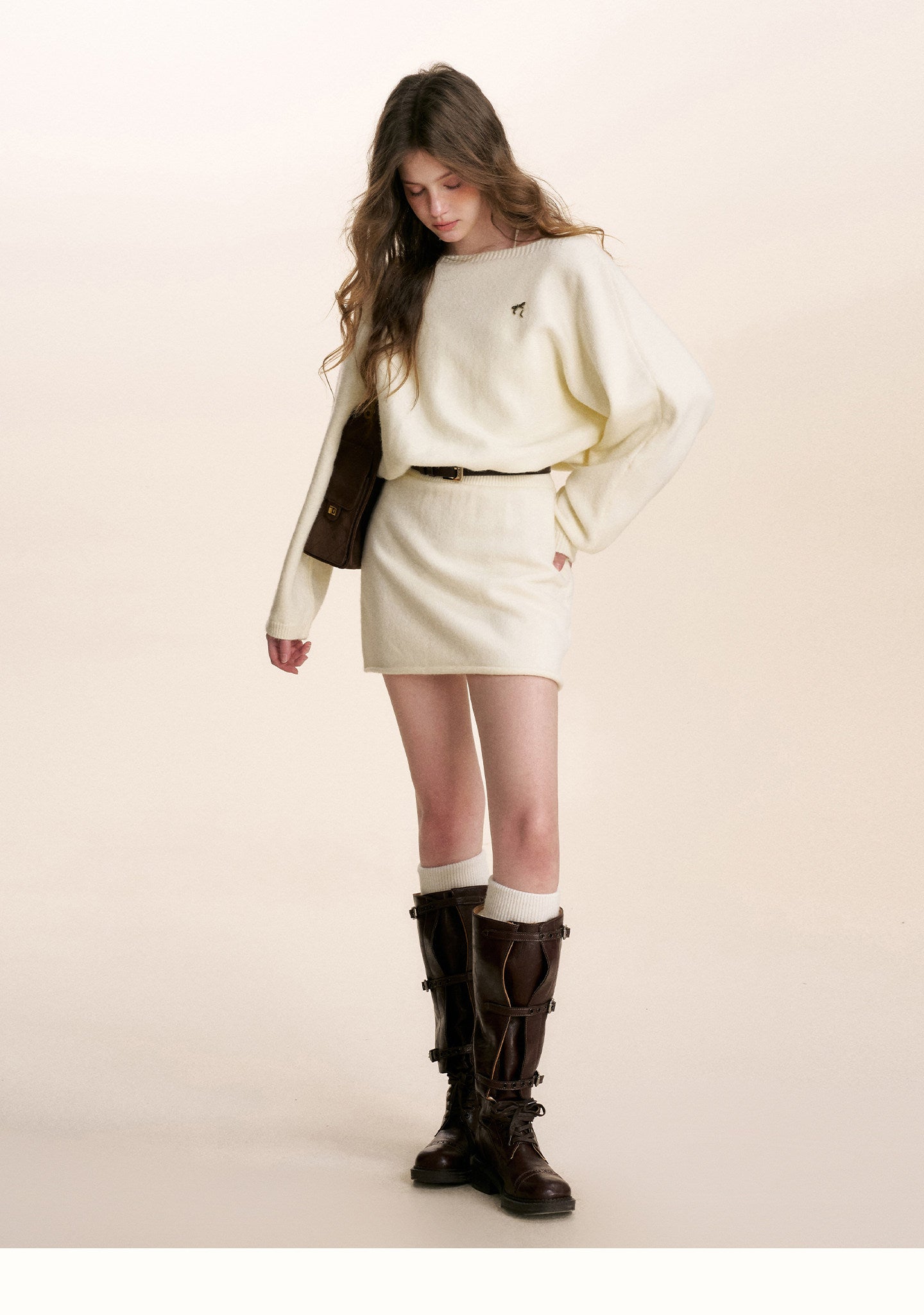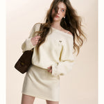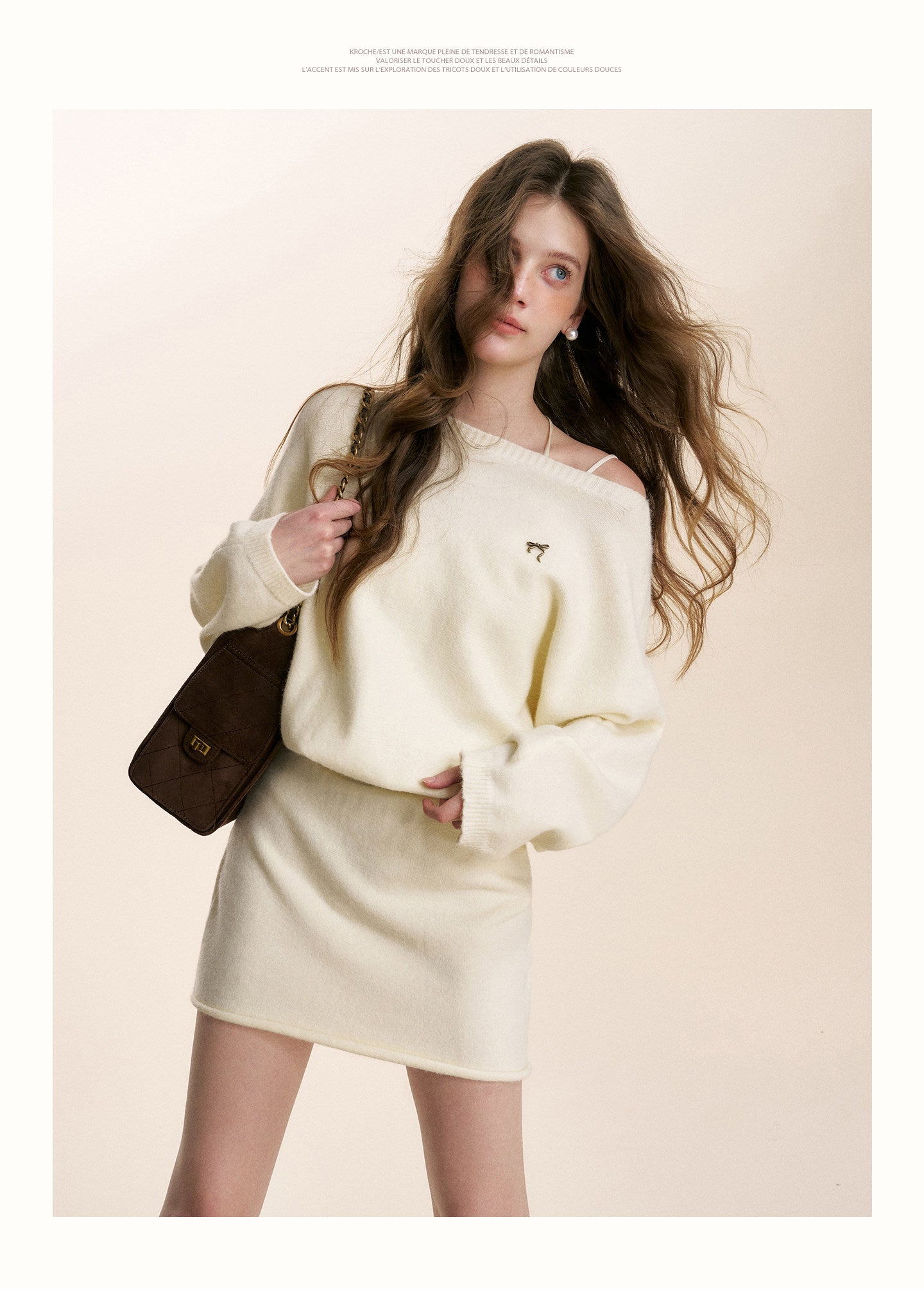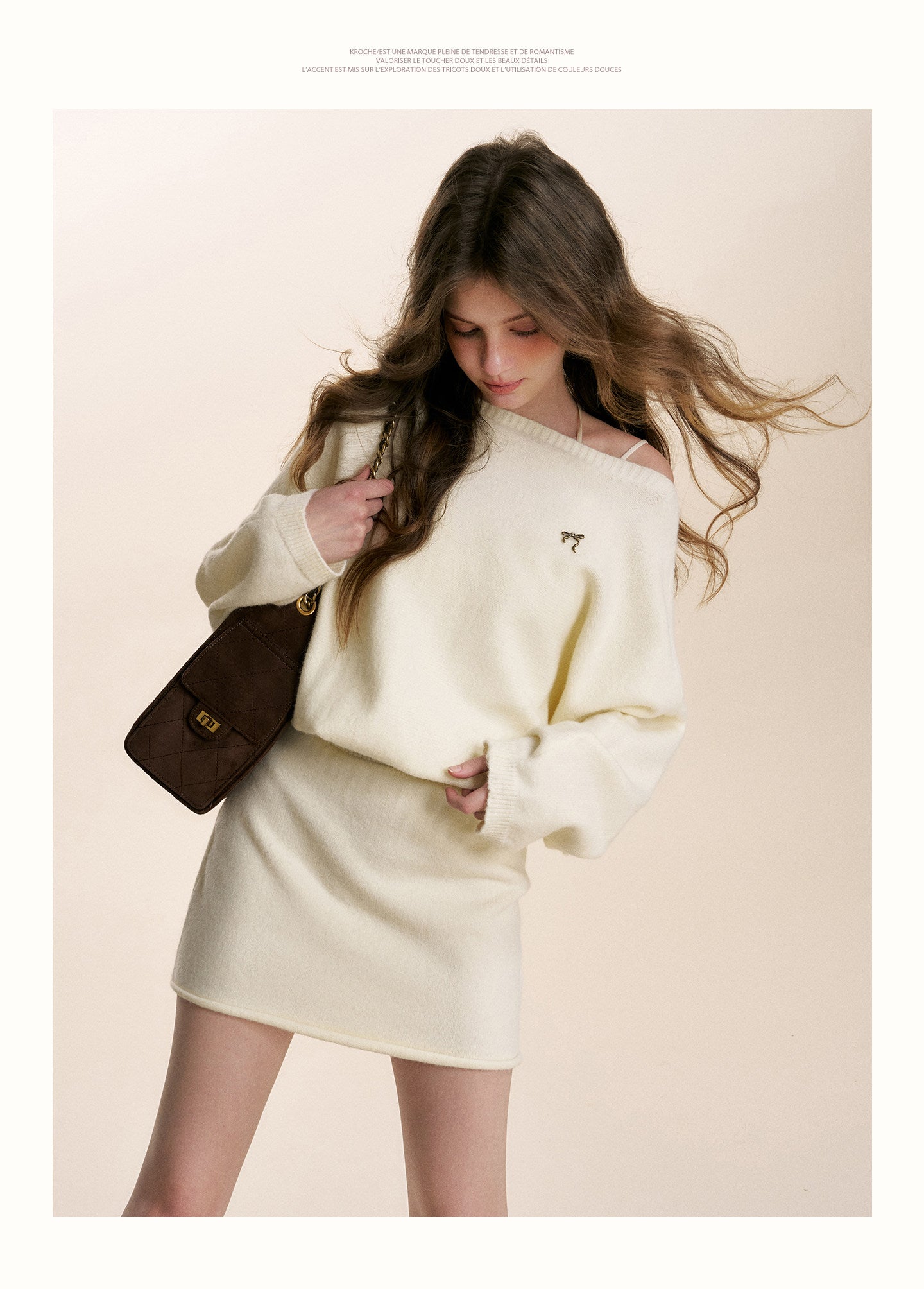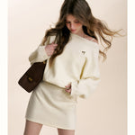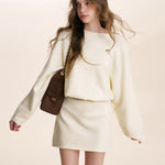 Kroche 2601 斜肩蝙蝠长袖针织A字短款收腰连衣裙