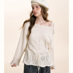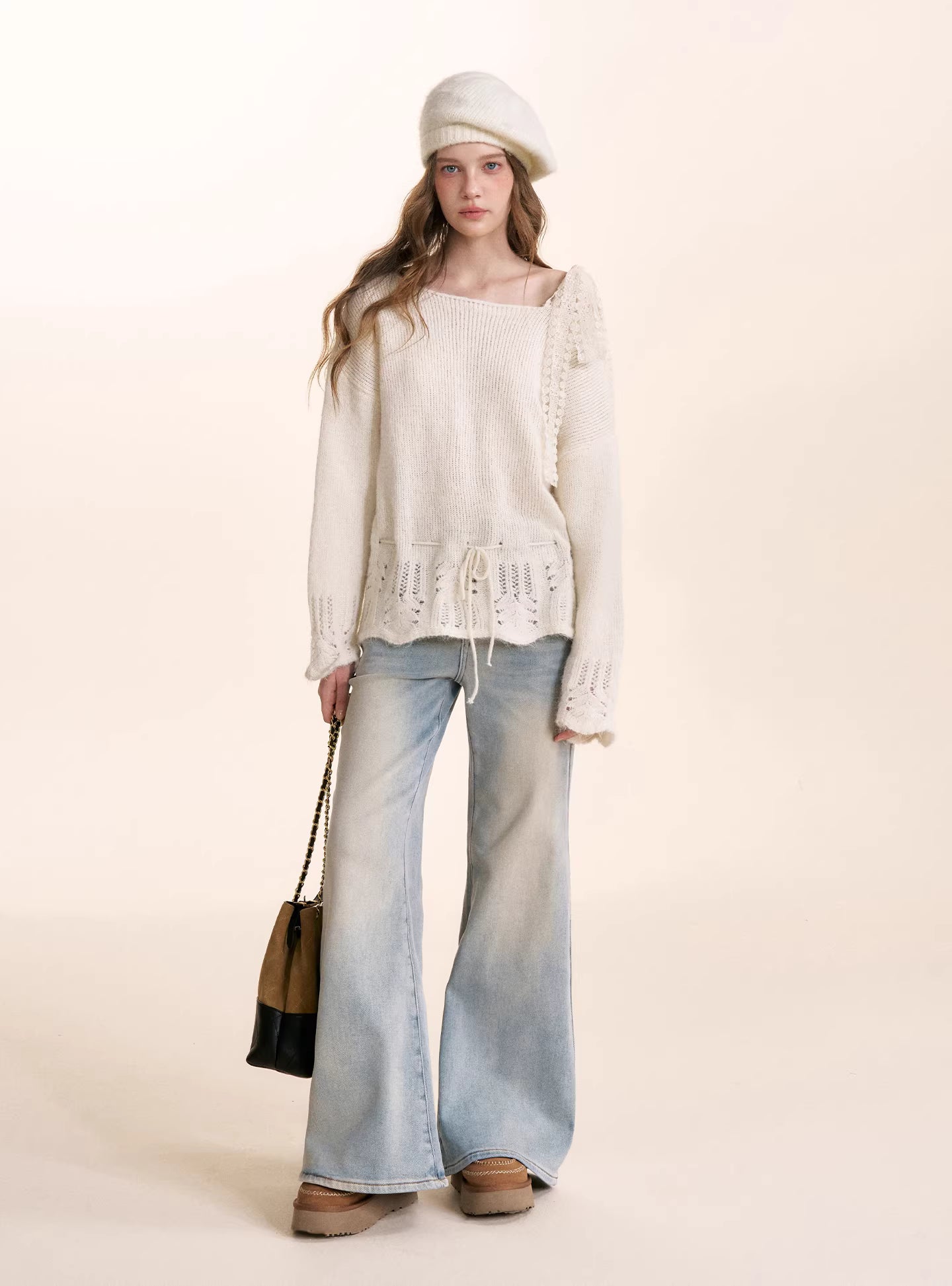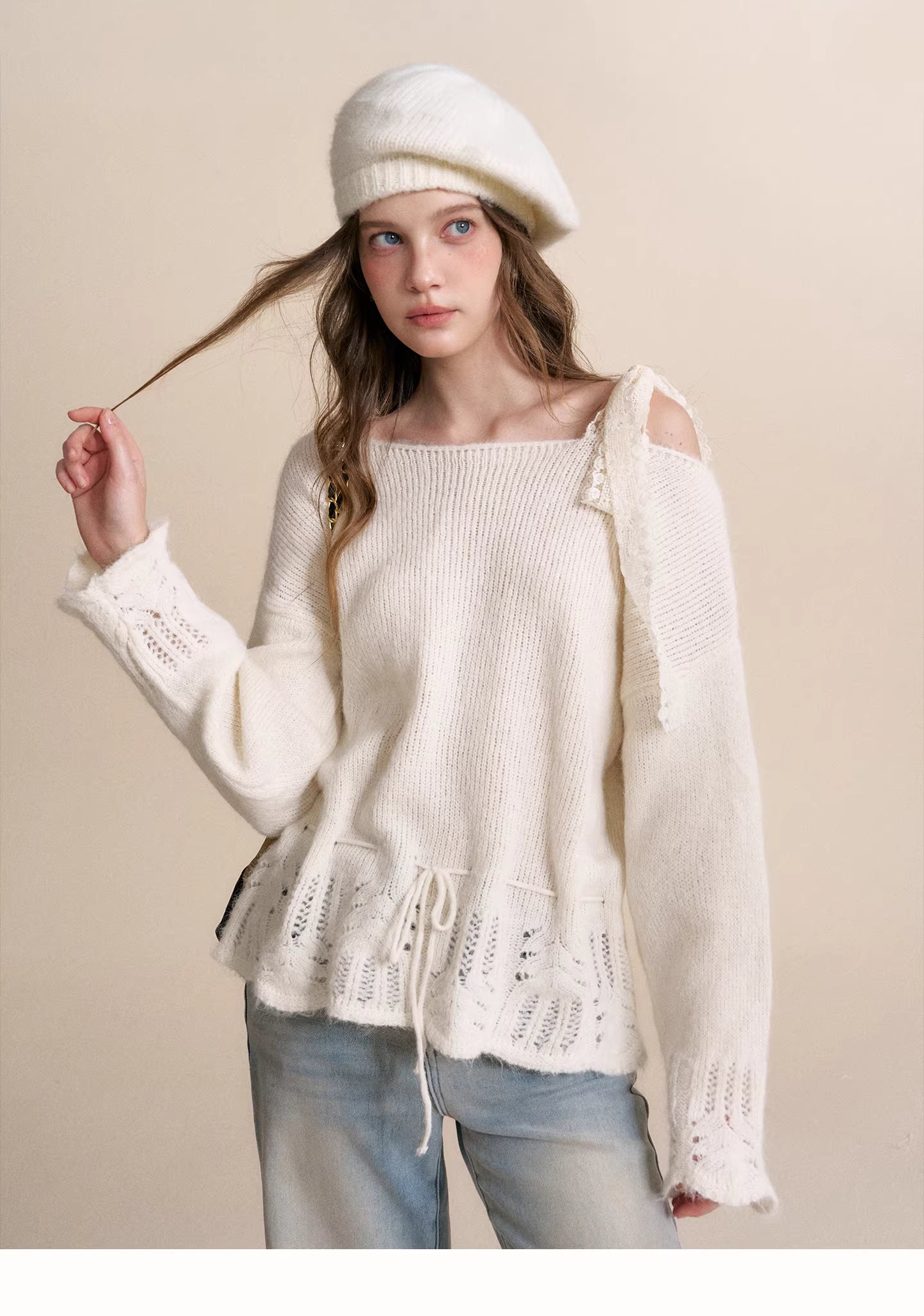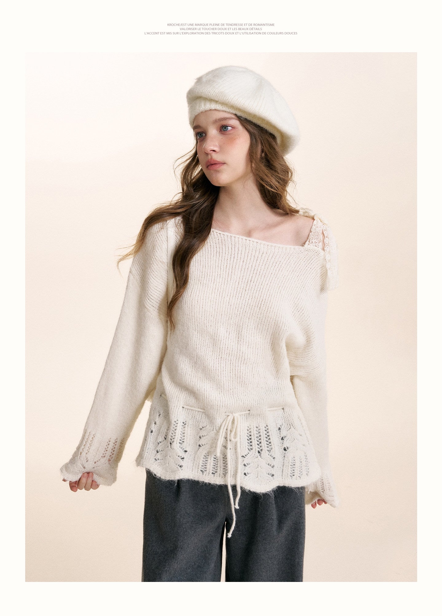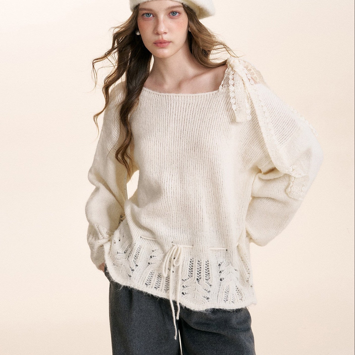 Kroche 2601 蕾丝系带抽绳花边露肩套头毛衣