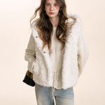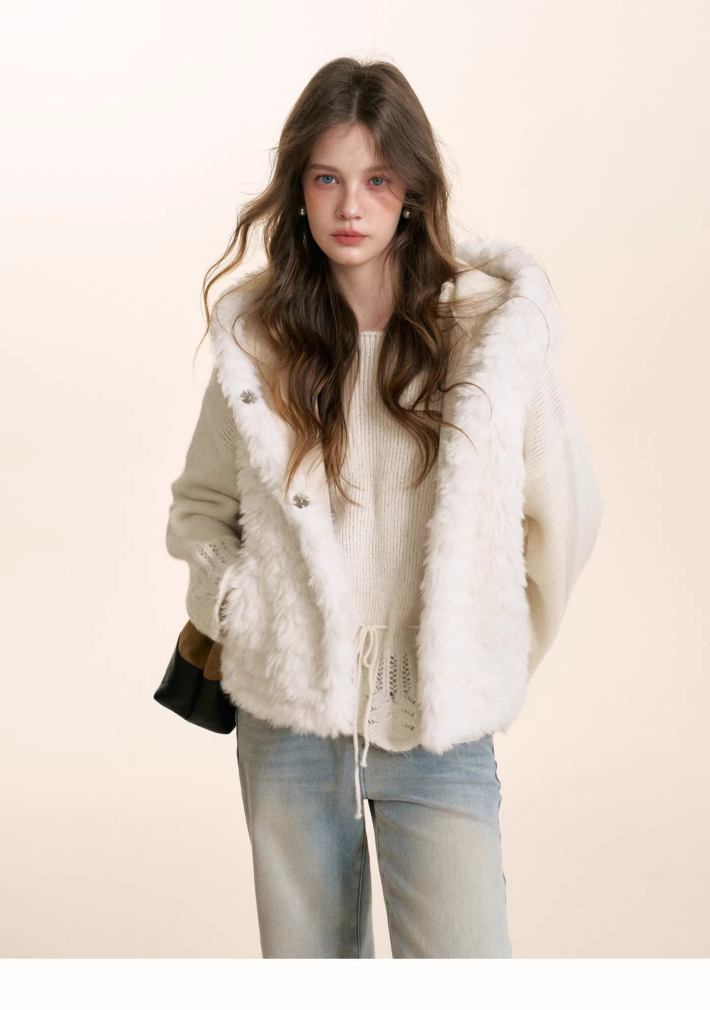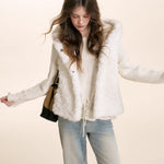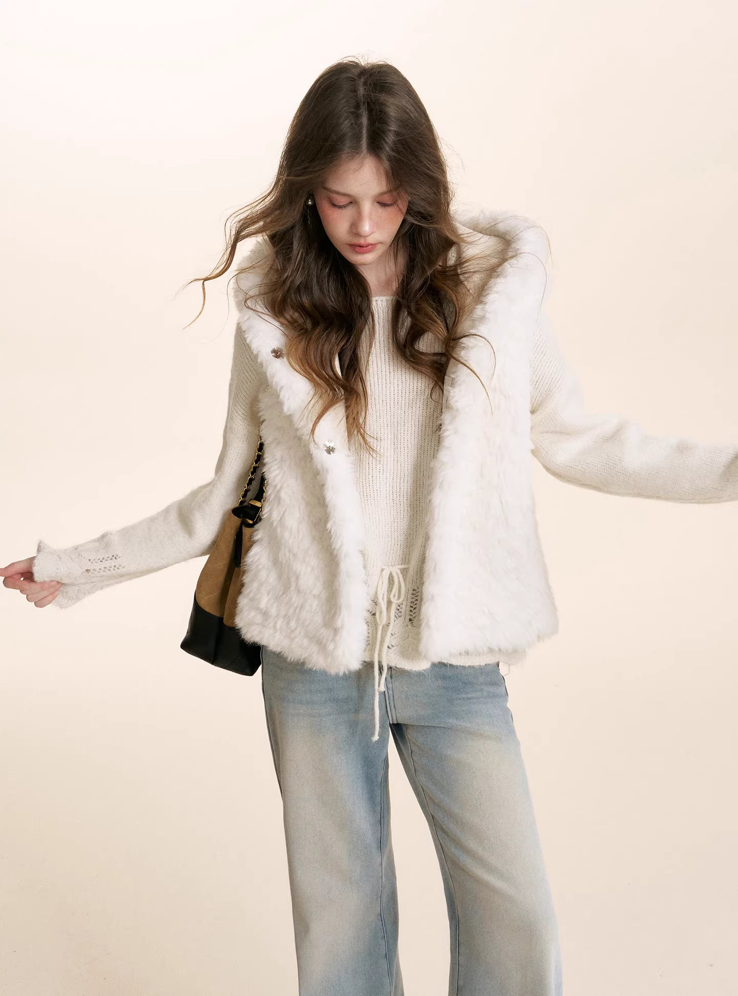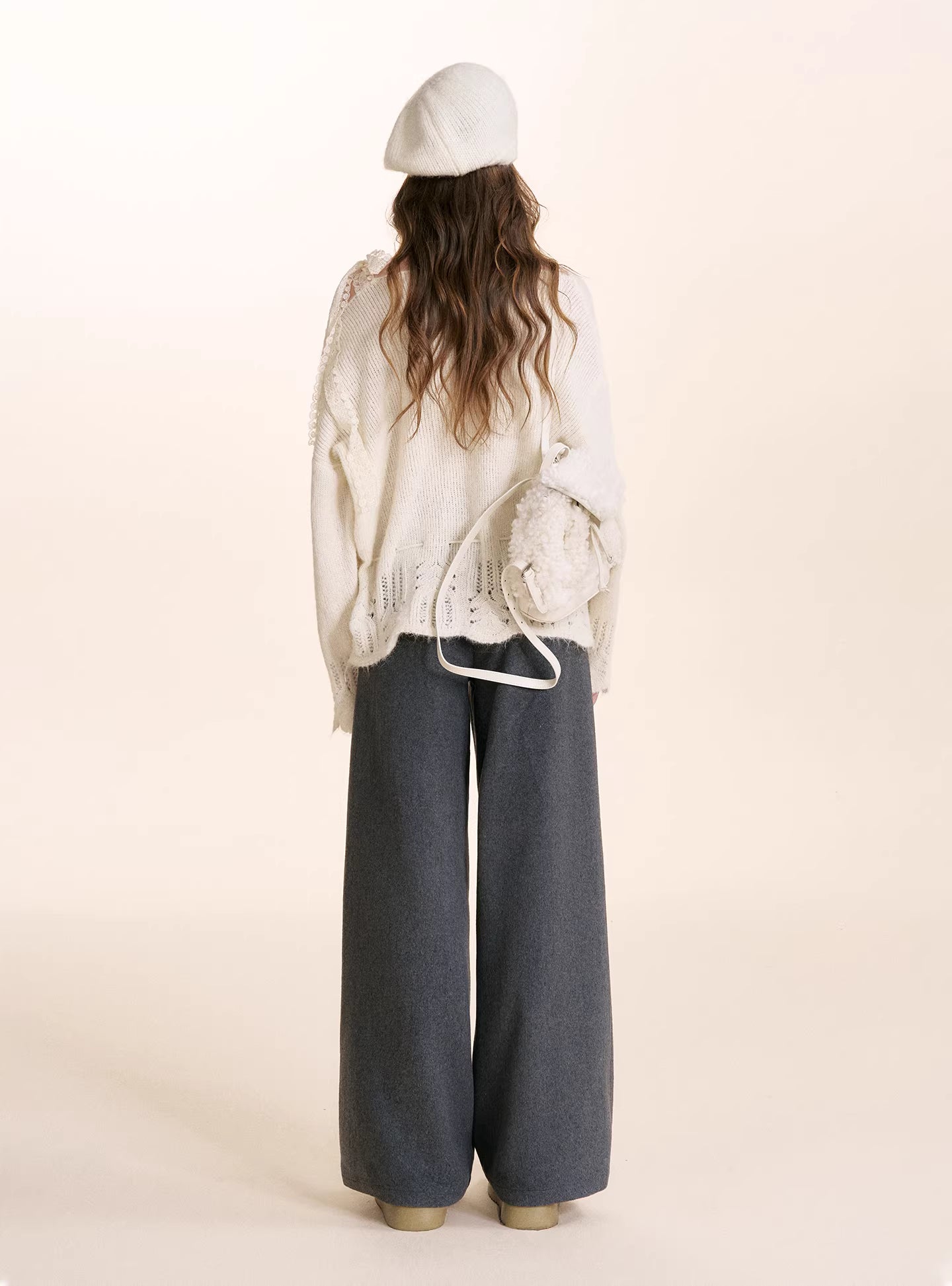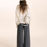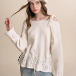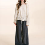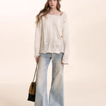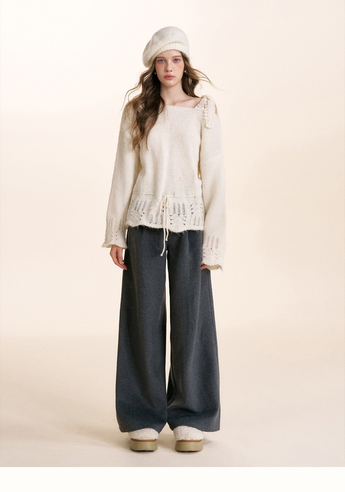Kroche 2601 蕾丝系带抽绳花边露肩套头毛衣