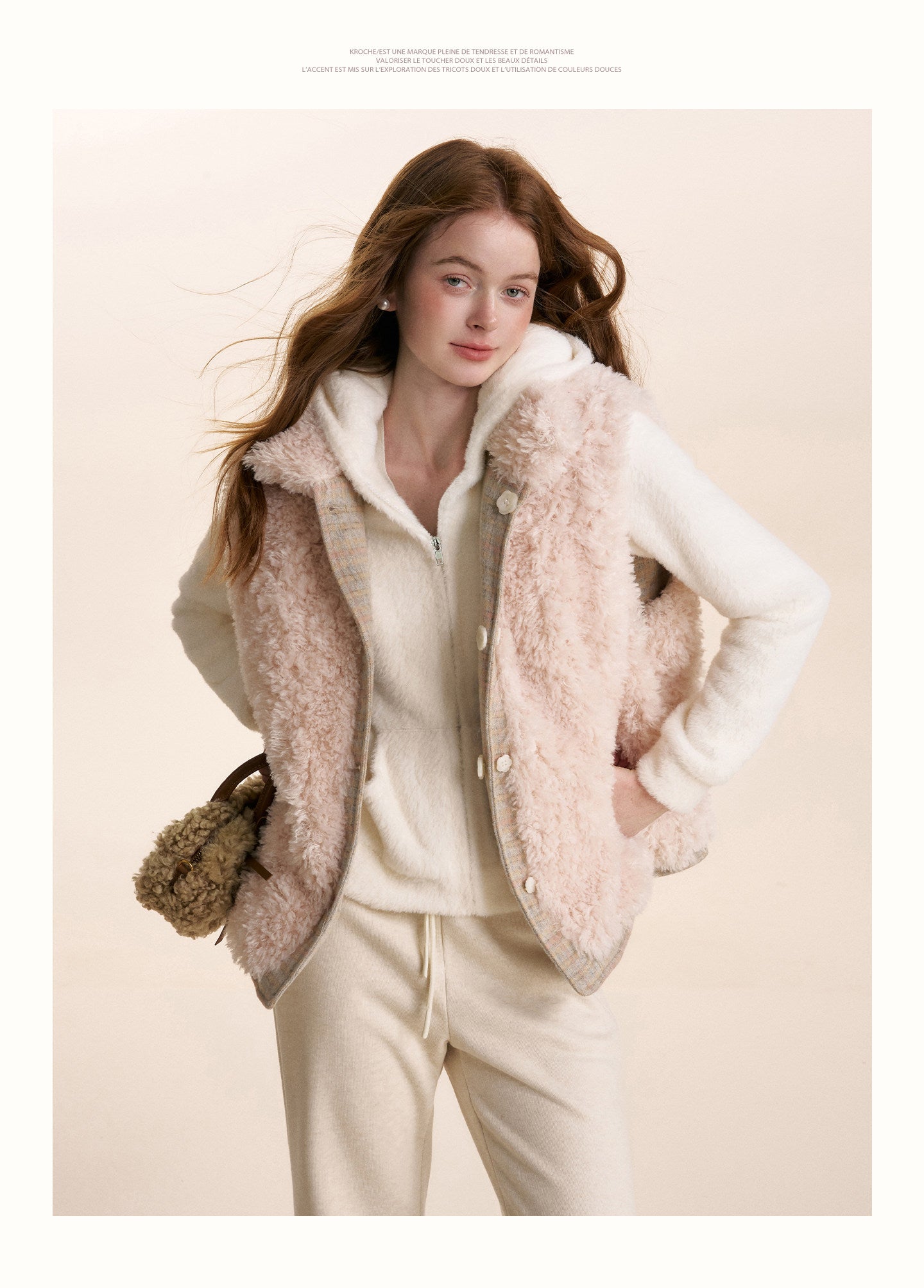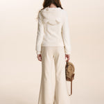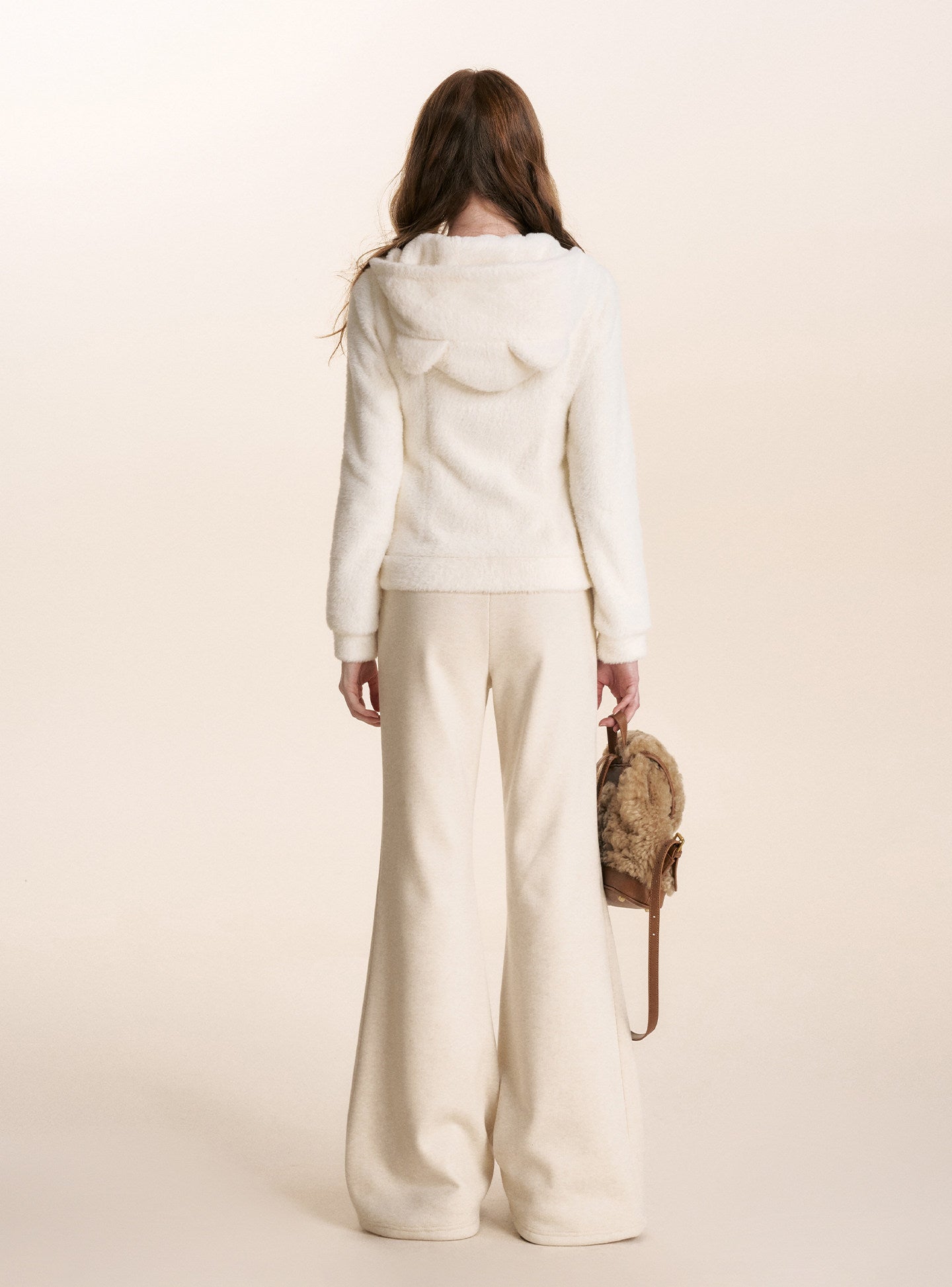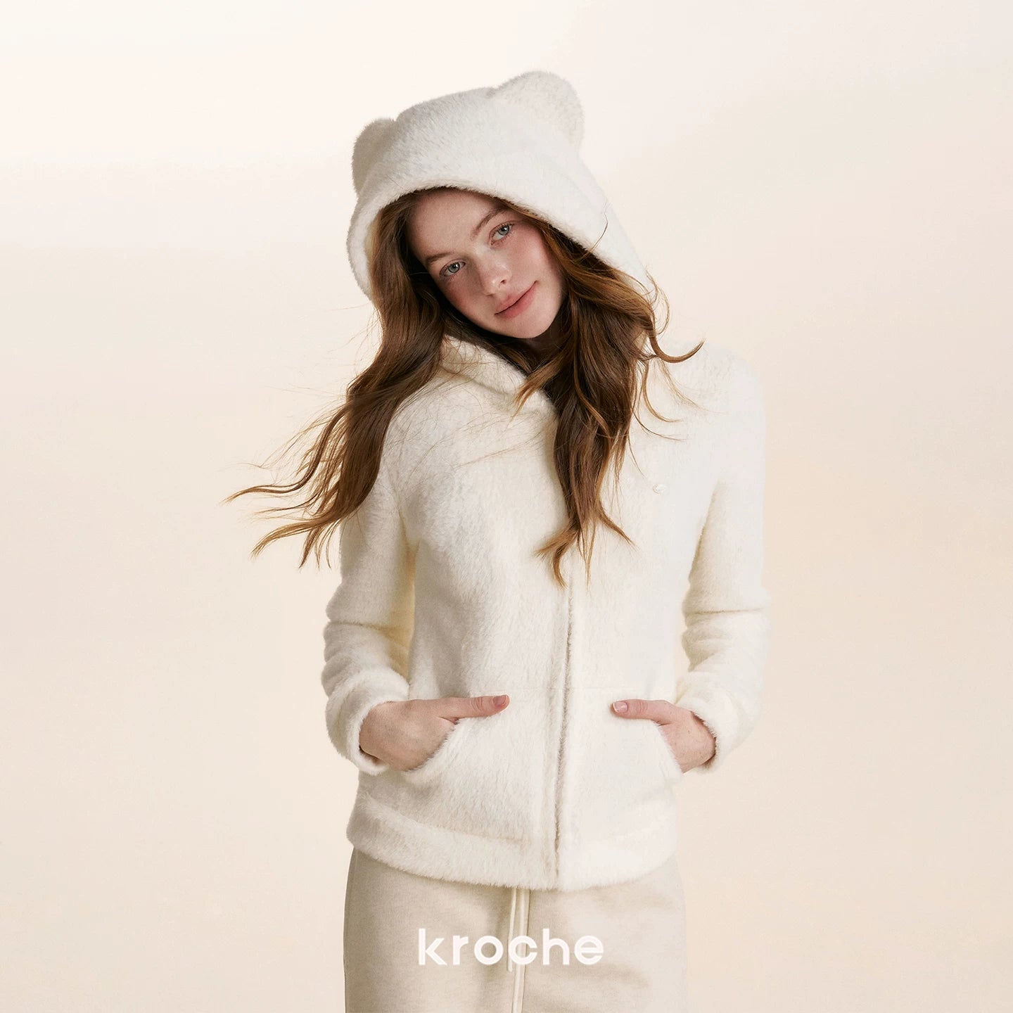 Kroche 2602 小熊耳朵连帽修身毛绒卫衣外套 白
