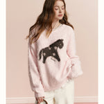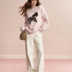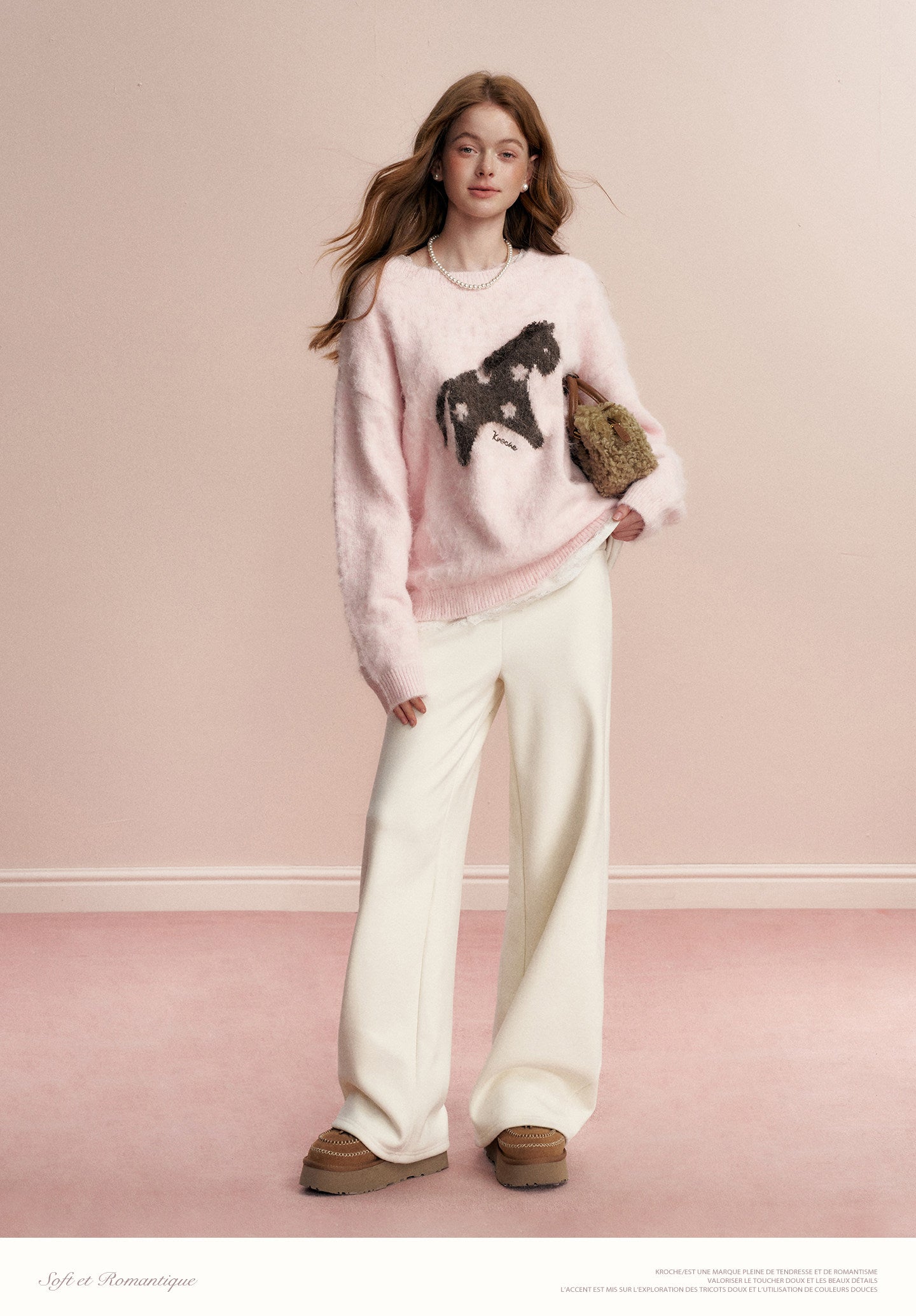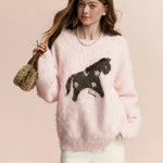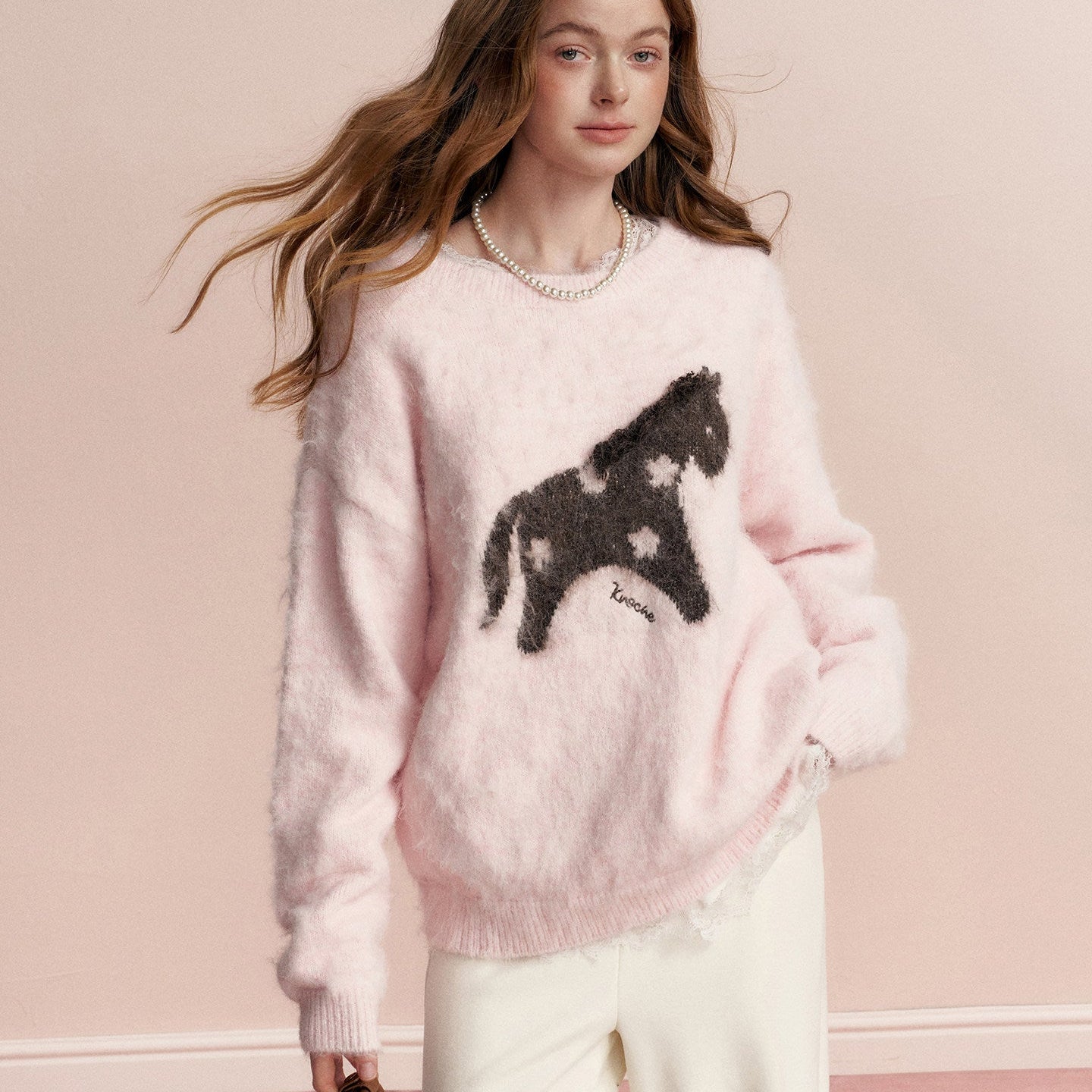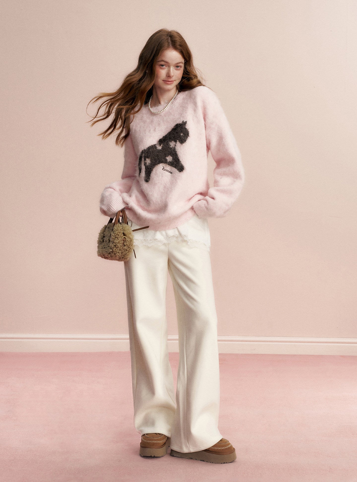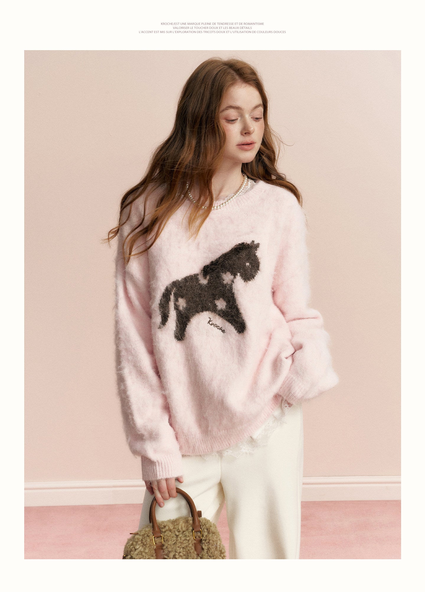 Kroche 2602 羊毛混纺 拉毛撞色小马提花宽松圆领毛衣 柔雾粉