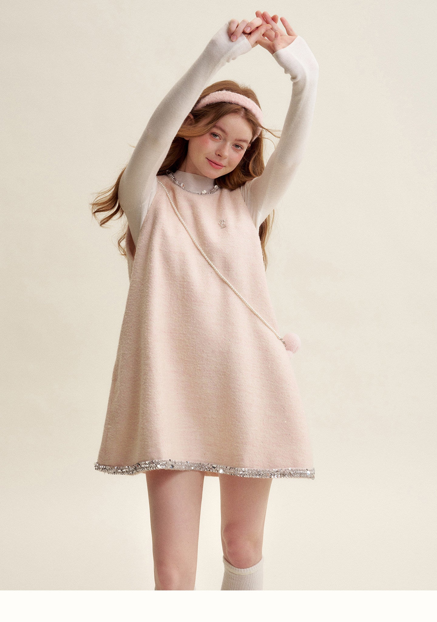 Kroche 2602 羊毛混纺 钉珠小香风宽松A字连衣裙