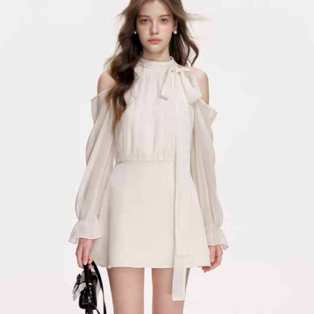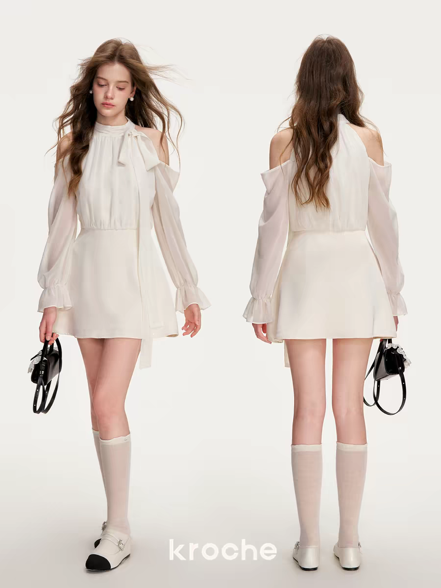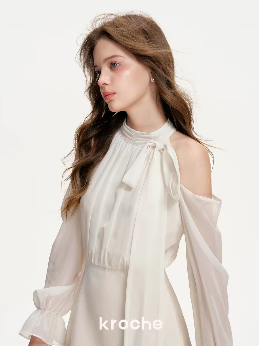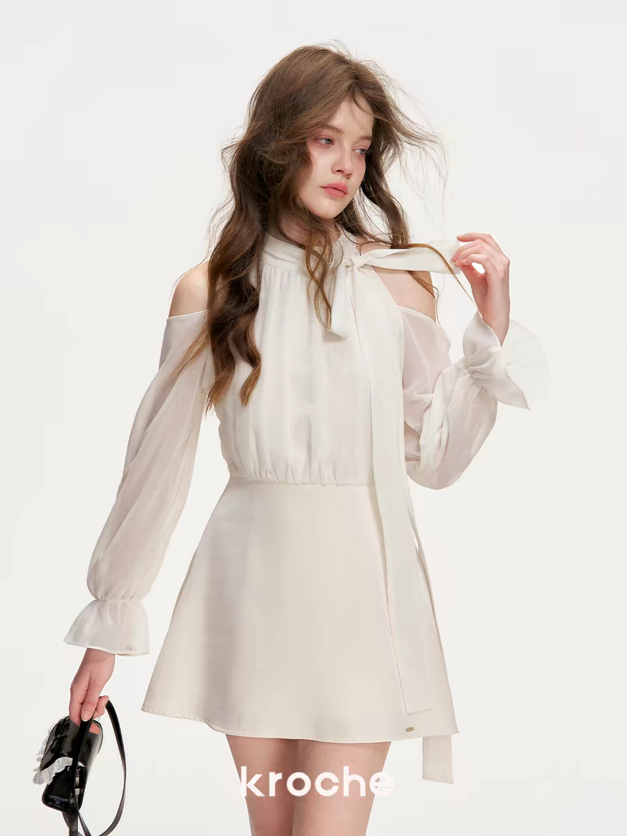 Kroche 2604 缎面拼接露肩收腰连衣裙