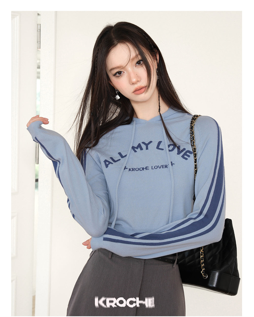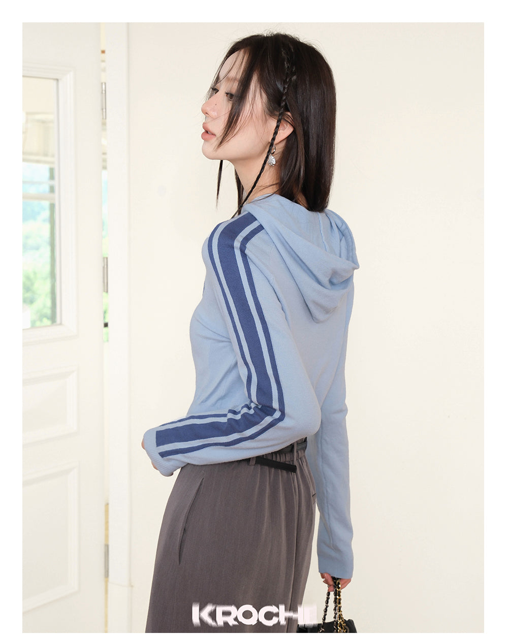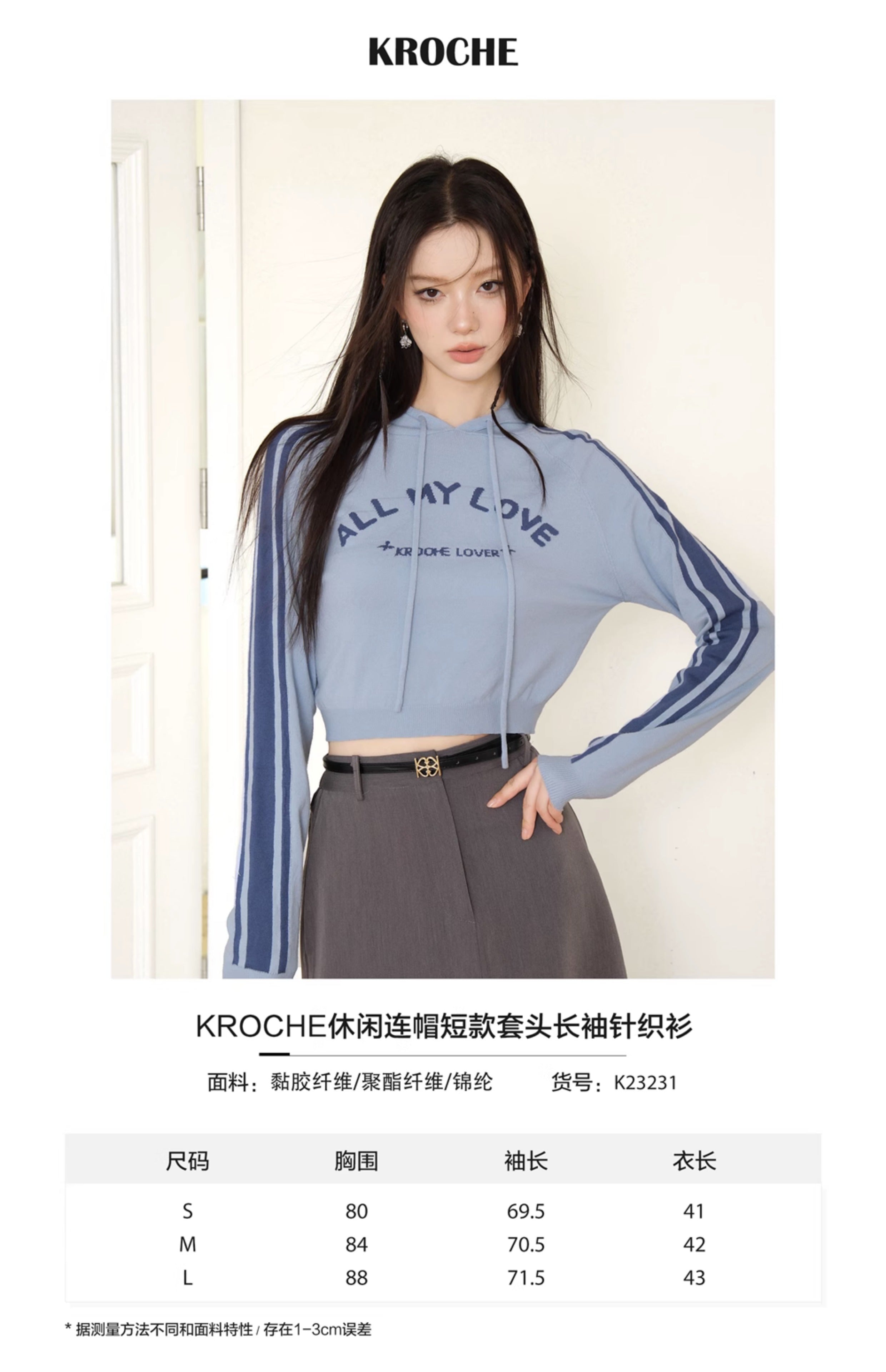 Kroche SS2309 休闲连帽短款长袖针织衫 蓝