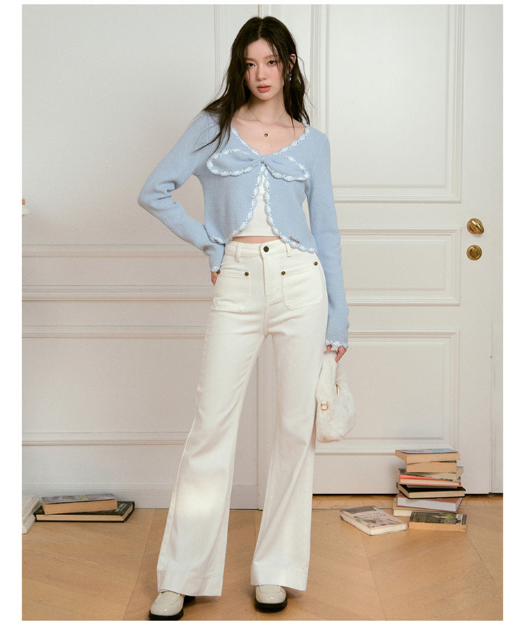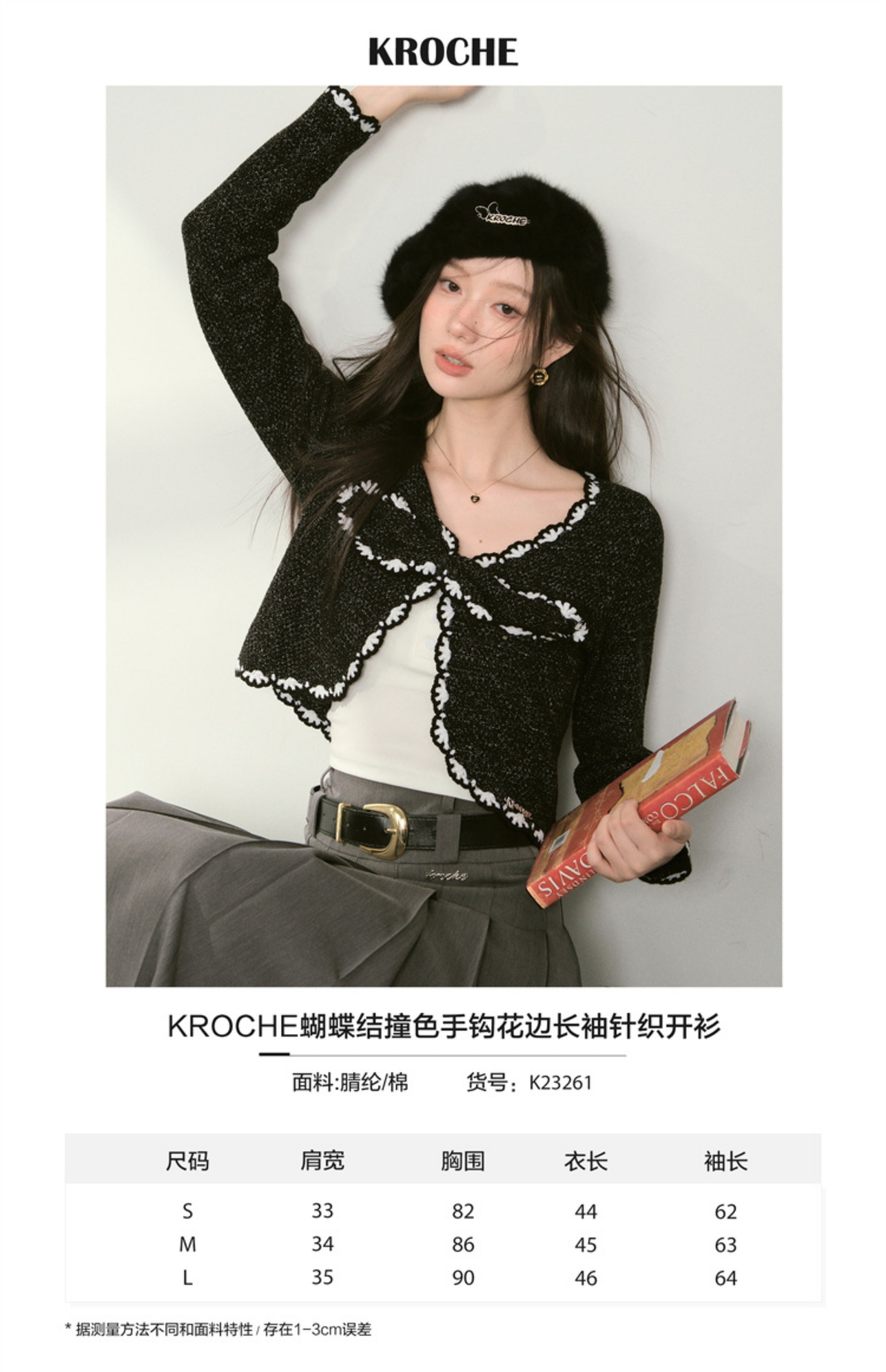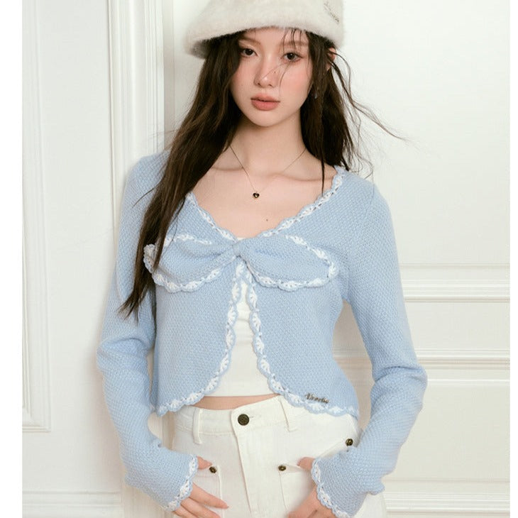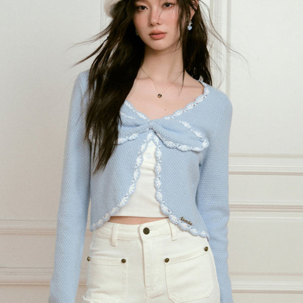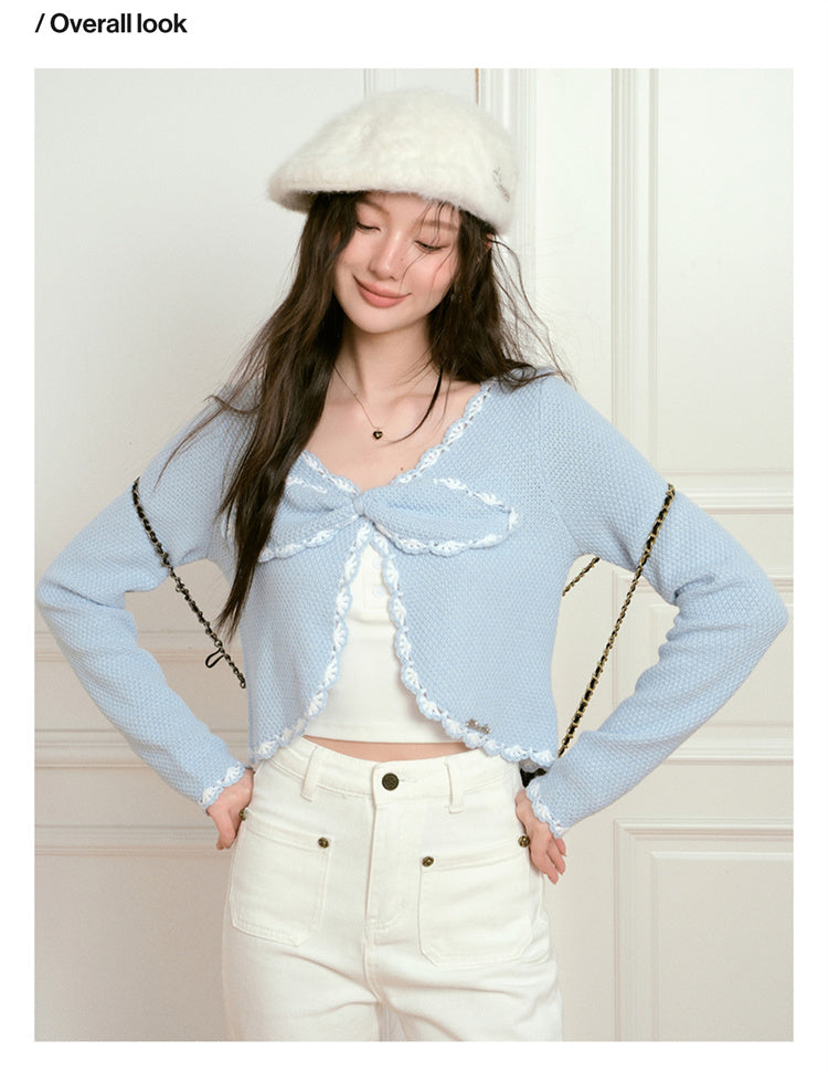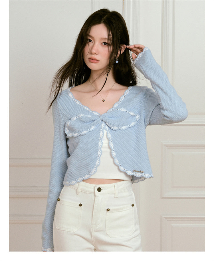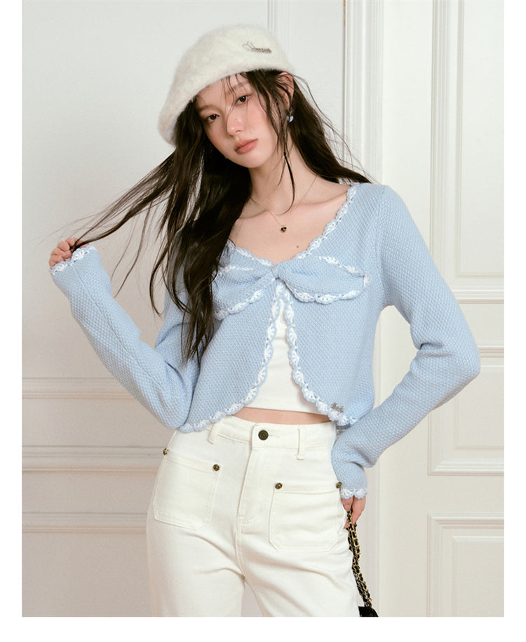 Kroche SS2309 蝴蝶结撞色手钩花边长袖针织开衫 蓝