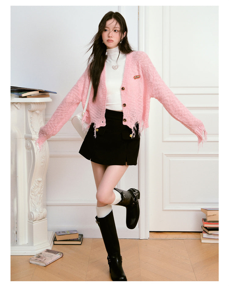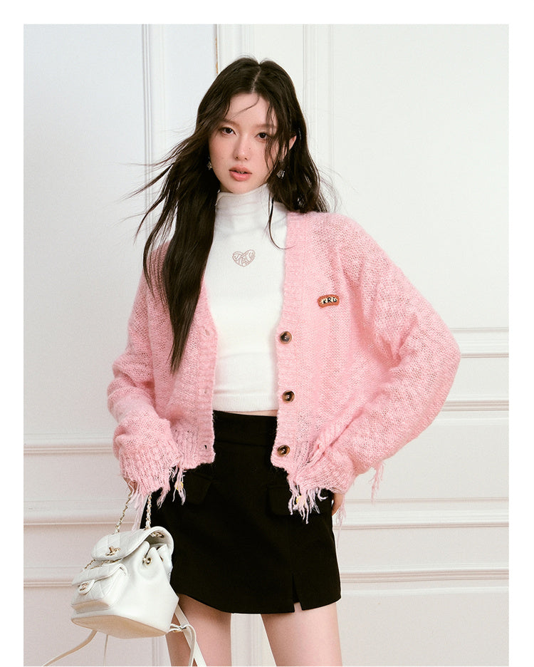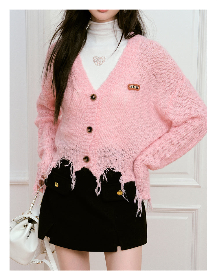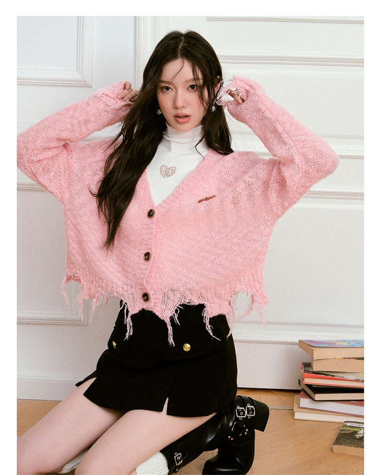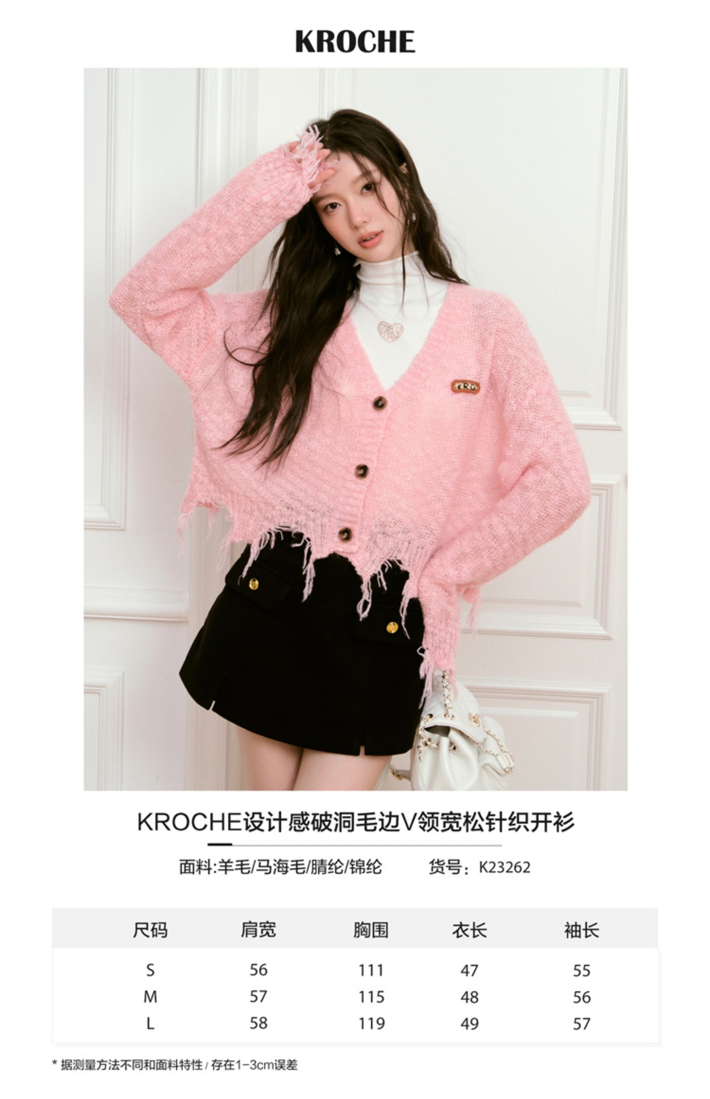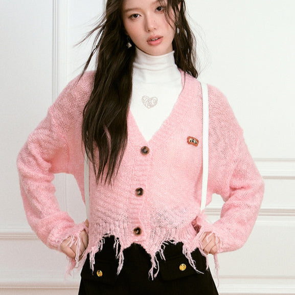 Kroche SS2310 破洞毛边V领宽松针织开衫 粉