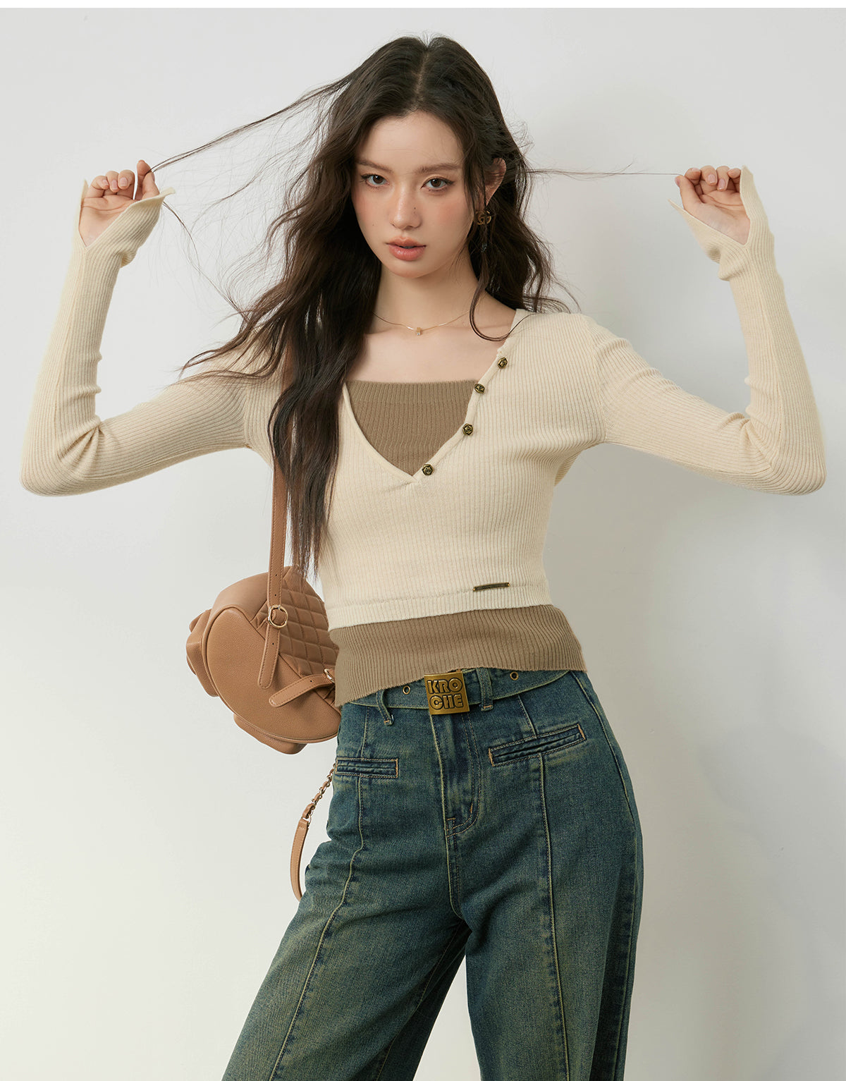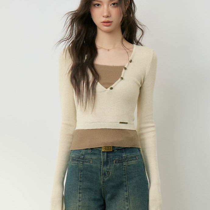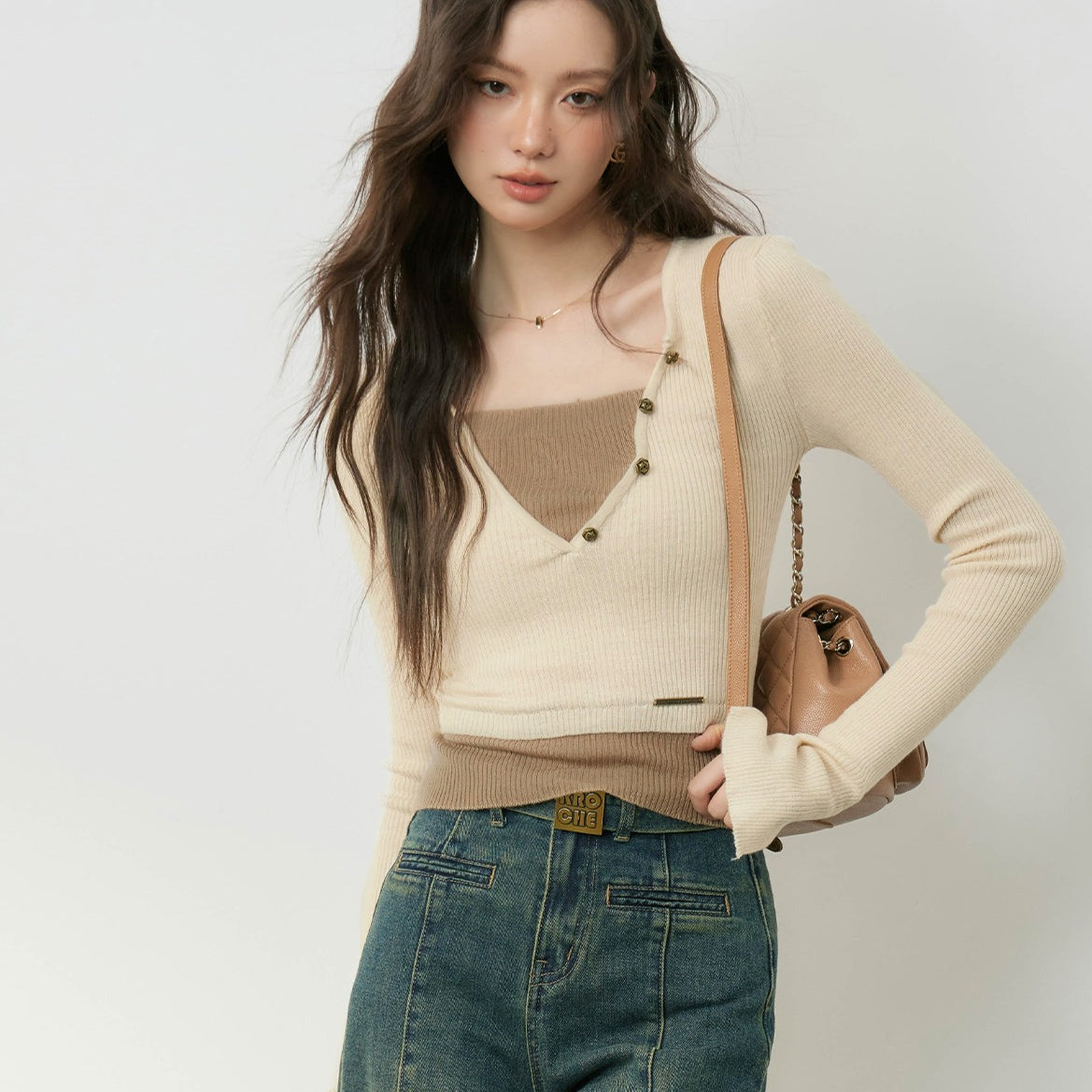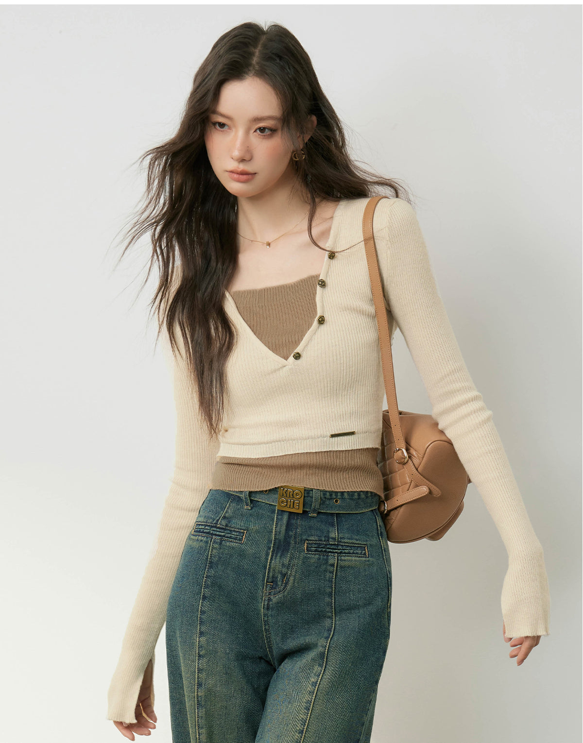 Kroche SS2401 拼接V领假两件针织打底加厚版 杏