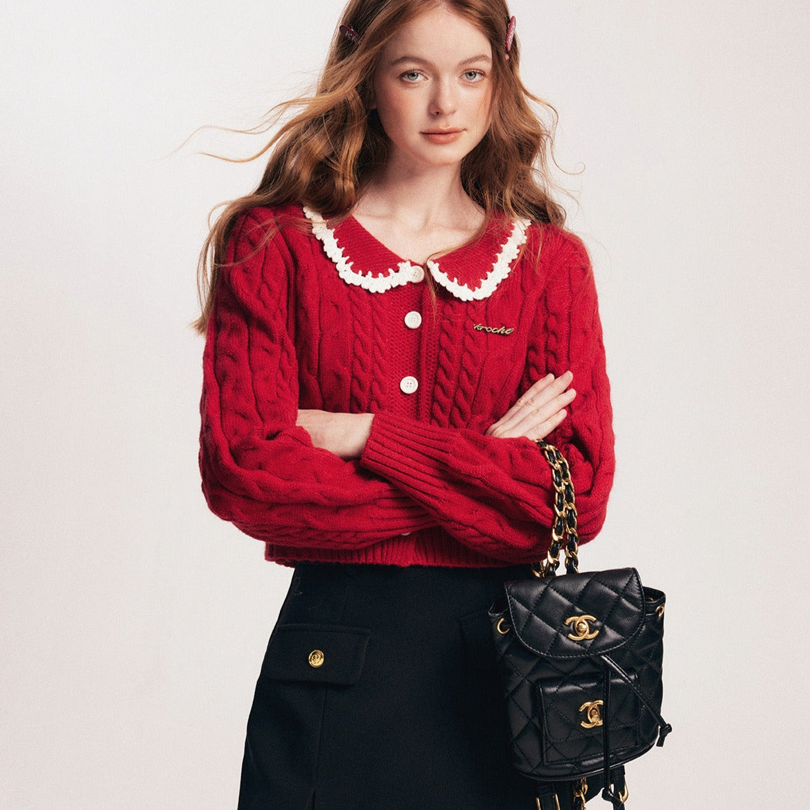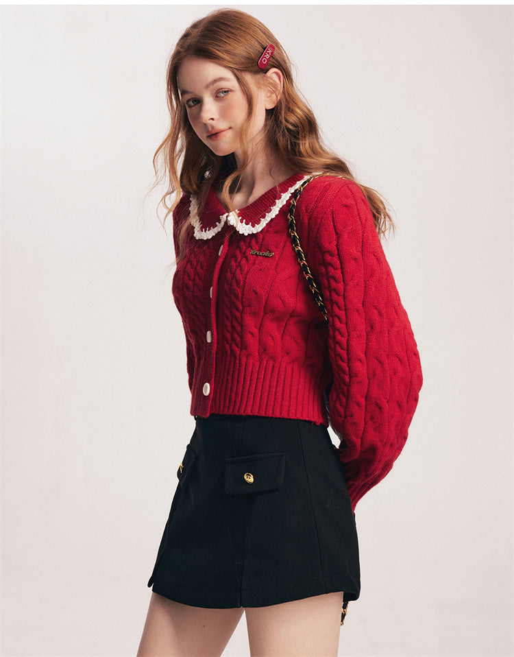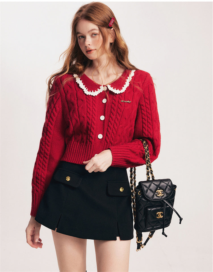 Kroche SS2401 撞色手钩花边娃娃领开衫毛衣 红