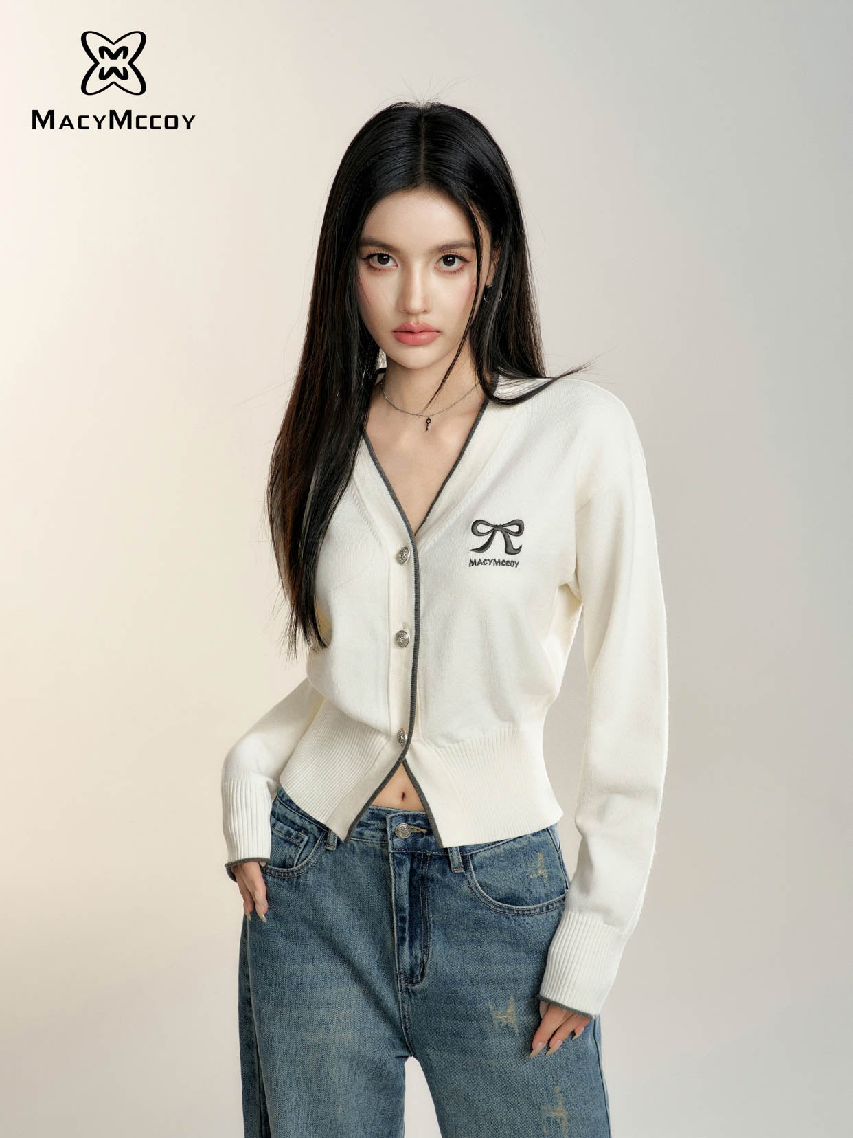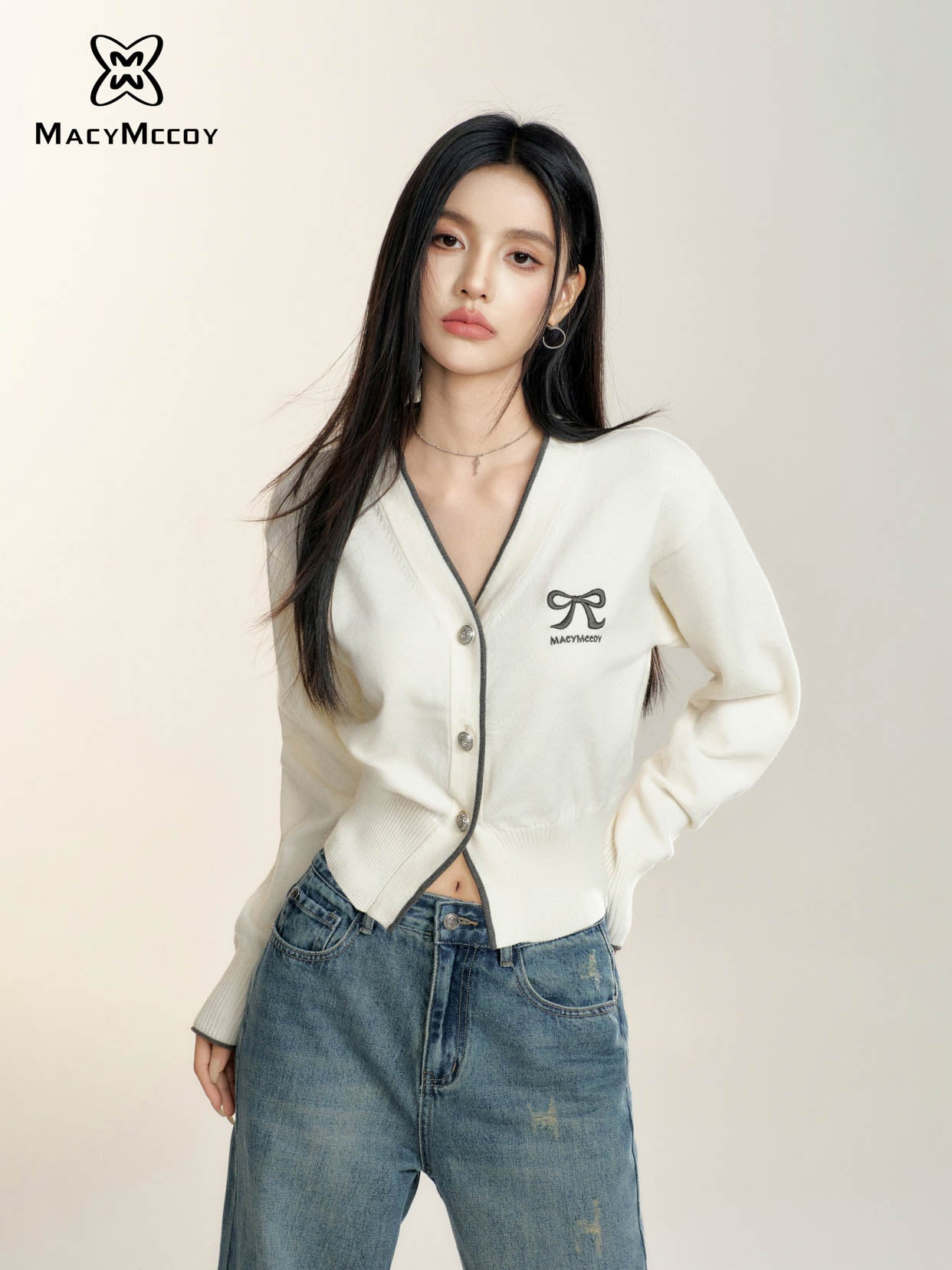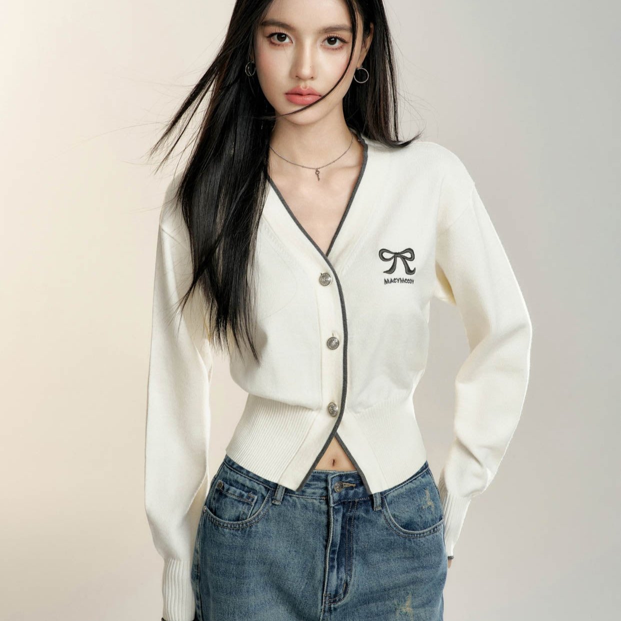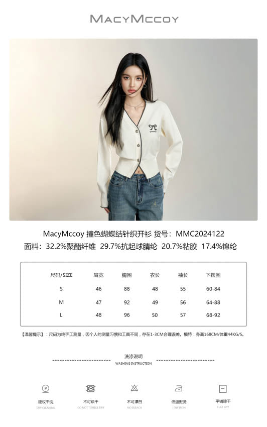MacyMccoy 2408 撞色蝴蝶结针织开衫